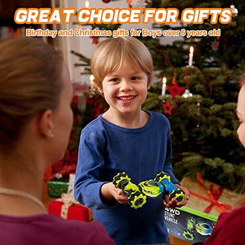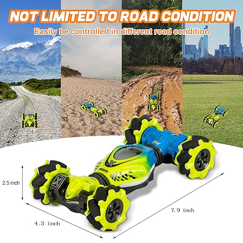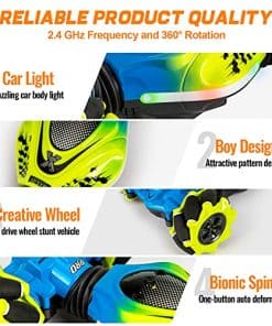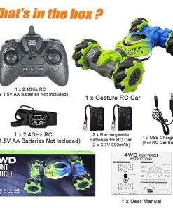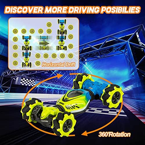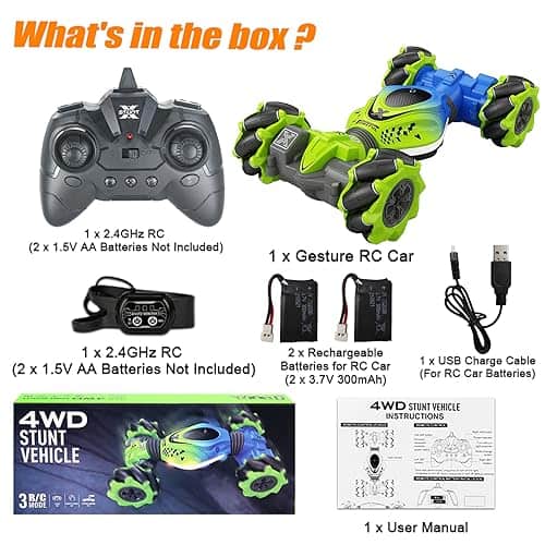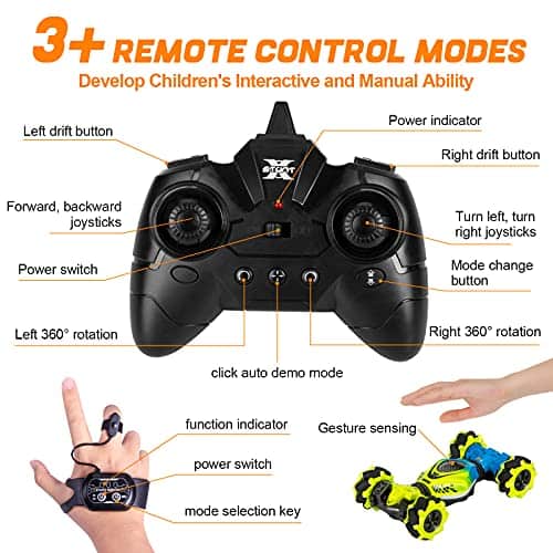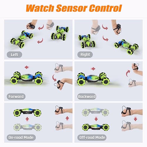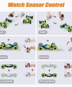 Coche de Control Remoto KIEAHCEY: ¡Haz que el tiempo de juego sea más emocionante con este coche de acrobacias controlado por gestos! Este coche de control remoto 4WD viene con un control remoto y un reloj sensor de gravedad que permiten a los niños conducir el coche de juguete de manera única. Pueden realizar giros, acrobacias, derrapes y más con solo unos simples gestos o movimientos de la muñeca. Además, el coche tiene luces coloridas y efectos de música que añaden diversión adicional a la experiencia de juego. Este coche de acrobacias tiene una construcción duradera y está equipado con baterías recargables que garantizan horas de diversión sin fin. ¡Es el regalo perfecto para niños y niñas mayores de 6 años que disfrutan de los coches de control remoto y las acrobacias emocionantes!