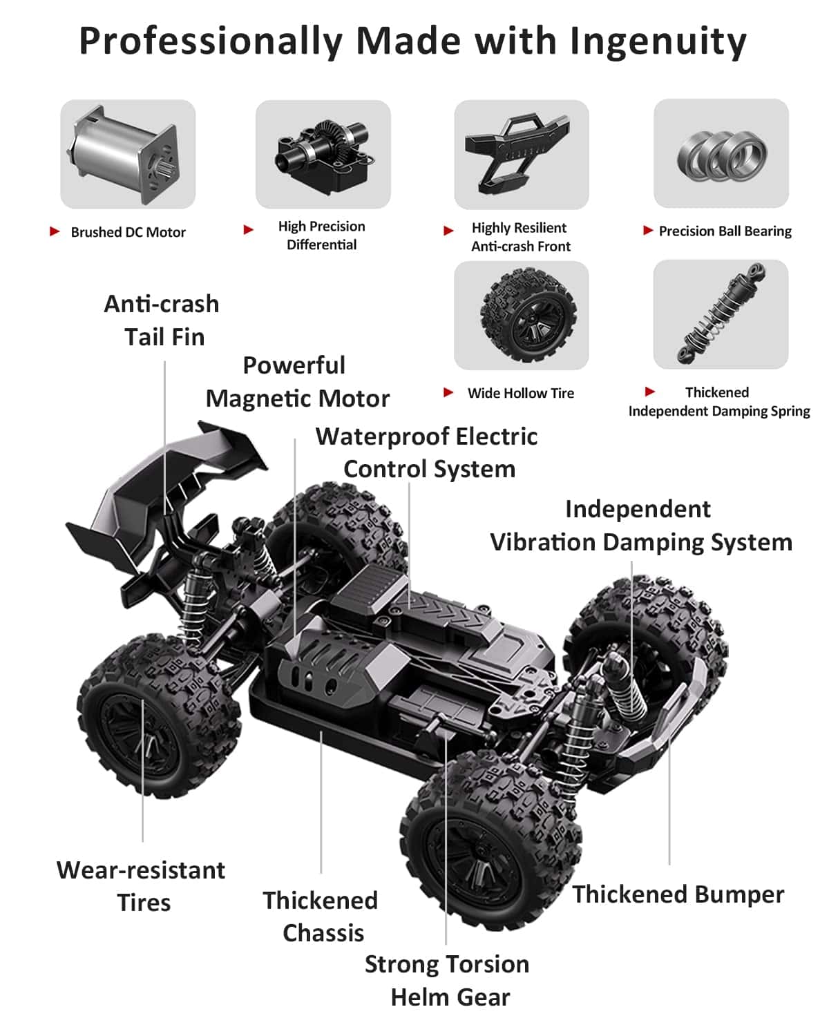 1. Coche RC de alta velocidad equipado con un motor cepillado 380, mayor potencia permite al coche alcanzar rápidamente 40KM/H, la velocidad mínima puede ajustarse a 15KM/H, apto para niños mayores de 8 años para jugar, según diferentes jugadores pueden operar a diferentes velocidades, aumentando la experiencia de conducción y diversión. 2. Control remoto inteligente de 2.4GHz con diseño ergonómico tipo de mano, radio control de 2.4GHz, cubriendo un rango de control de 260 pies, transmisión de señal estable hace que la respuesta sea rápida y sensible, no hay retraso ni lag en la operación, la velocidad se puede ajustar rápido o lento, el ángulo de dirección también se puede ajustar, fácil de usar. 3. Incluye 2 baterías recargables de 7.4V 1500mAh cada una y un cable de carga USB con protección inteligente, cada batería dura 35 minutos, para un total de 70 minutos de juego continuo, permitiéndote experimentar un tiempo de juego extra largo. 4. Coche todoterreno equipado con un sistema de suspensión de absorción de impactos independiente de las cuatro ruedas, excelente absorción de impactos, fuerte agarre en neumáticos de arena, excelente manejo y durabilidad, se puede utilizar en el parque, jardín, asfalto, playa, tierra, grava y pasto corto todo terreno. 5. LED frontal y trasero para iluminar el camino durante la noche y útiles para encontrar el coche rápidamente en la oscuridad. Un regalo perfecto para niños y adultos en cumpleaños y Navidad, cualquier problema durante el uso, siempre puedes contactarnos y resolveremos el problema en 24 horas.