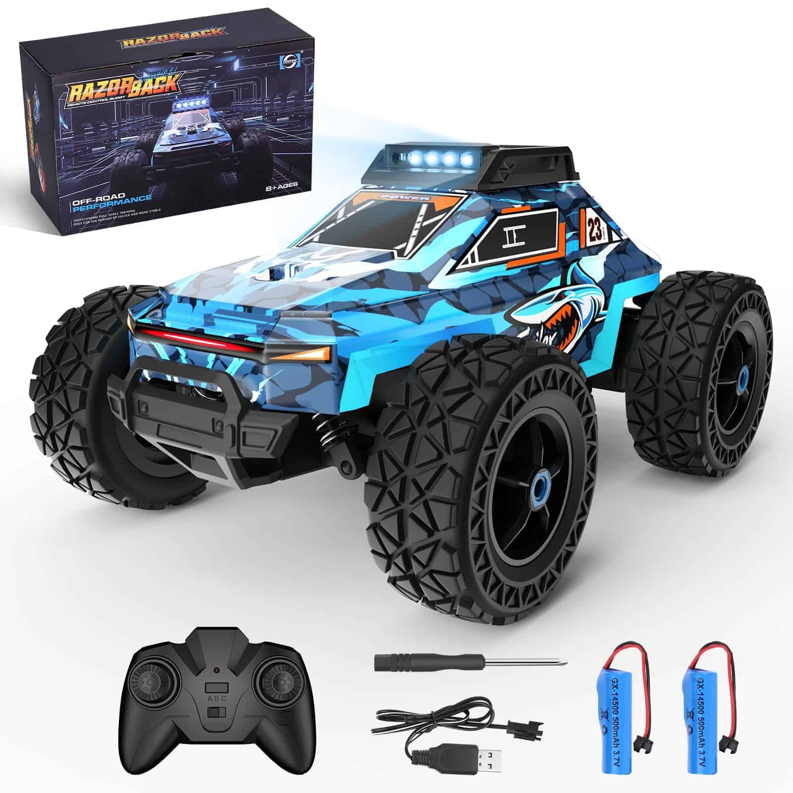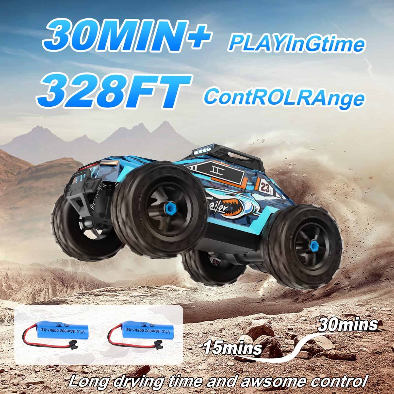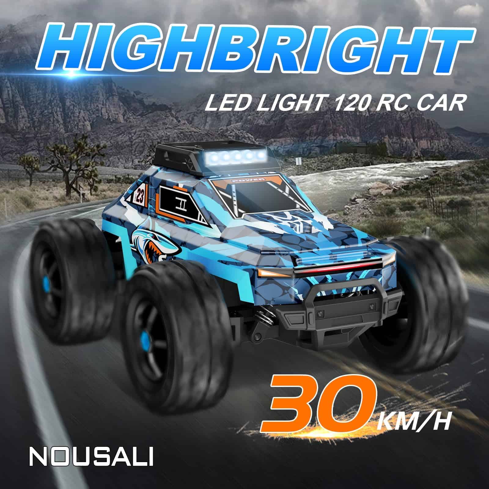 Coche de control remoto Nousali en escala 1:20 con una velocidad de 30 km/h. Equipado con un motor potente que brinda una experiencia de juego emocionante. Con faro LED que ilumina el camino. La carrocería de PVC suave es resistente y flexible, mientras que el chasis de ABS protege el coche de impactos. Los neumáticos de goma ofrecen un buen agarre para correr en cualquier terreno. Viene con 2 baterías recargables para hasta 30 minutos de juego continuo. Este coche de control remoto es el regalo perfecto para niños en cumpleaños, fiestas y días festivos.
