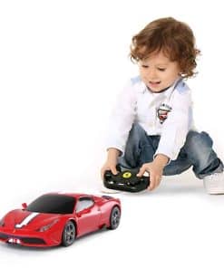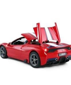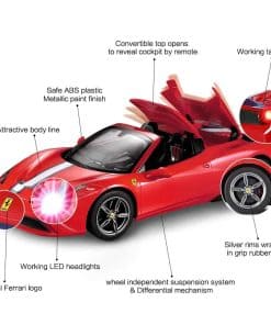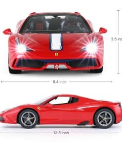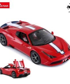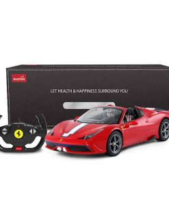 Coche de Control Remoto Rastar Ferrari 458 Special A a Escala 1/14 Oficialmente Licenciado por Ferrari S.p.A. Escala 1:14 basada en los datos originales del verdadero Ferrari 458 Special A Interior y exterior altamente detallados: Techo convertible Faros delanteros y traseros funcionales Sistema de suspensión independiente de 4 ruedas Llantas plateadas envueltas en neumáticos de goma de agarre Mecanismo diferencial Características: Tamaño: El coche mide 12.8″ x 6.4″ x 3.5″ / El control mide 4.2″ x 5.7″ Color disponible en Rojo Funciones completas – Adelante, Atrás, Detener, Girar a la Izquierda y Derecha Alcance del control remoto de hasta 98 pies Velocidad de 8-10 mph Frecuencia disponible en opcional 27mhz o 40mhz Baterías NO incluidas – Requiere 5 x AA para el coche y 1 x 9V para el control Paquete incluye: 1 x Coche de control remoto Rastar 1/14 1 x control remoto de doble agarre 1 x guía del usuario