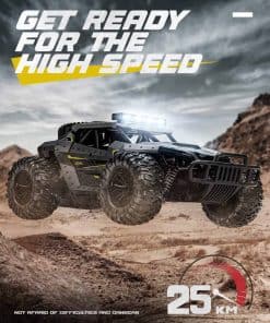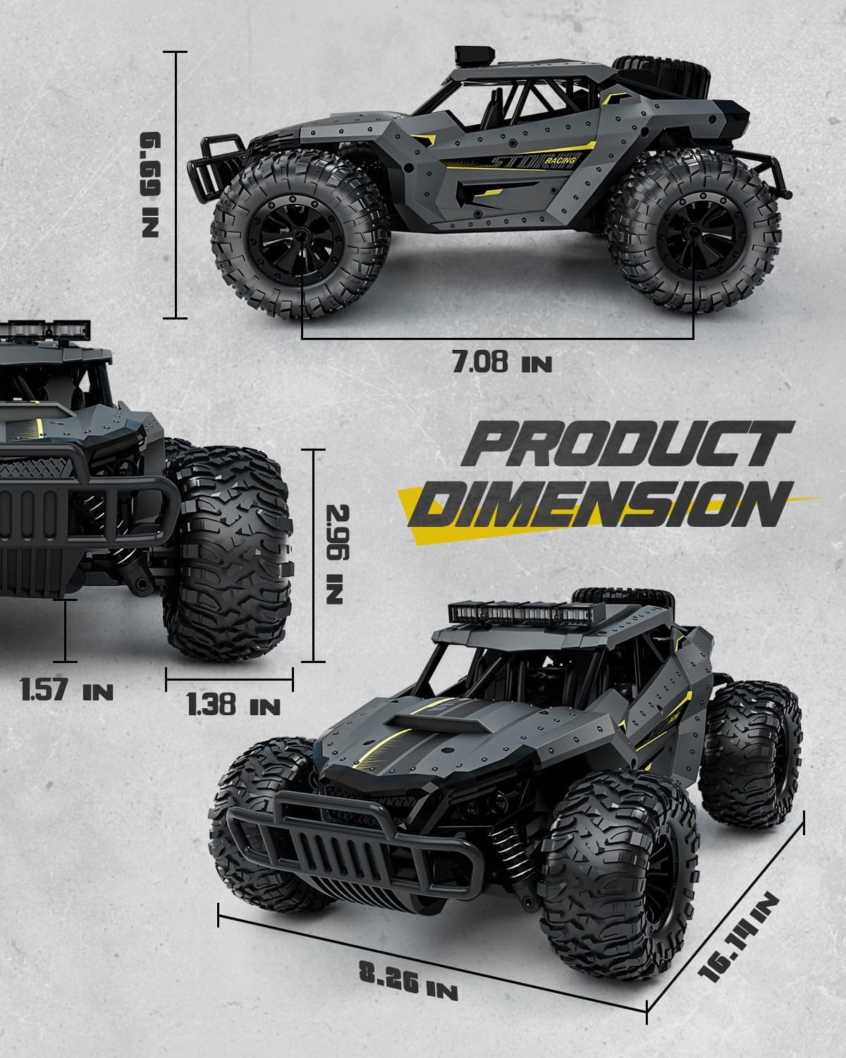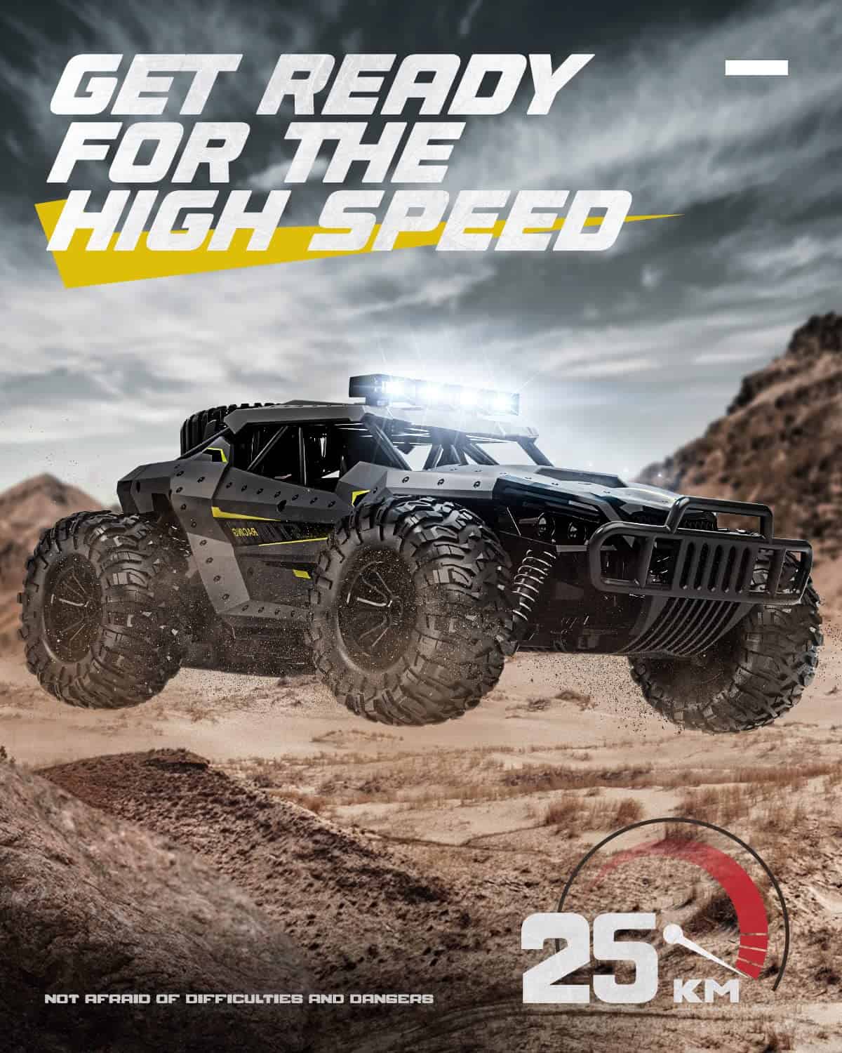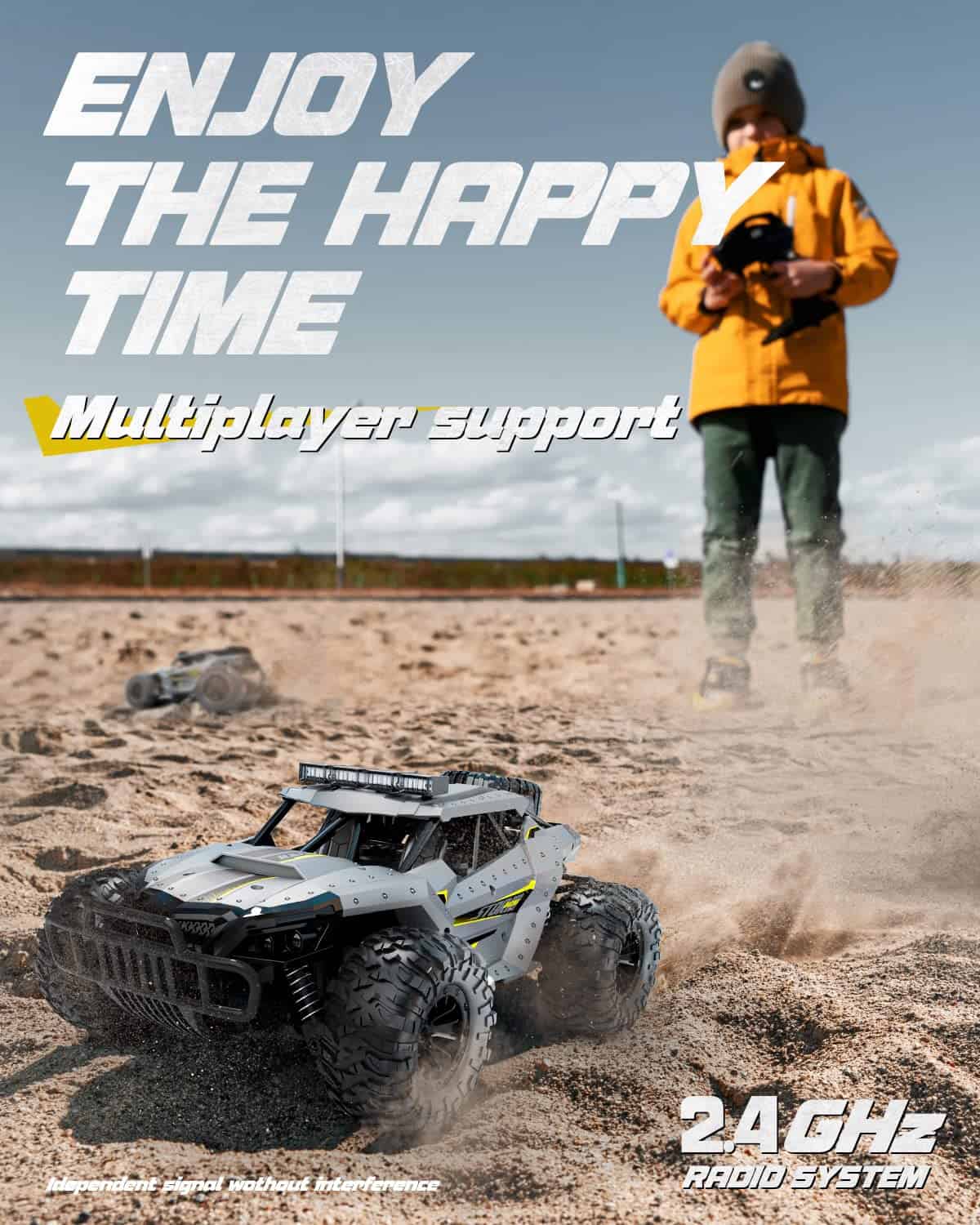 2. Control Remoto a 2.4GHz Anti-interferencias El control remoto opera en la banda de frecuencia de 2.4GHz y tiene efecto anti-interferencias. Puede soportar múltiples coches rc compitiendo al mismo tiempo. La distancia de control más larga puede llegar a 165 pies. Ya sea en interiores o exteriores, es un excelente camión monstruo todoterreno.