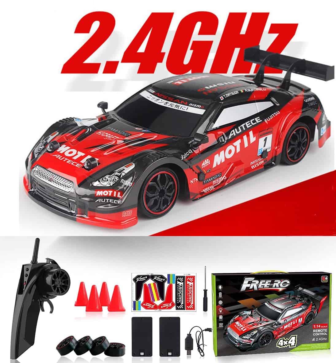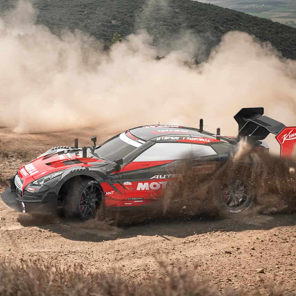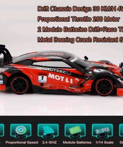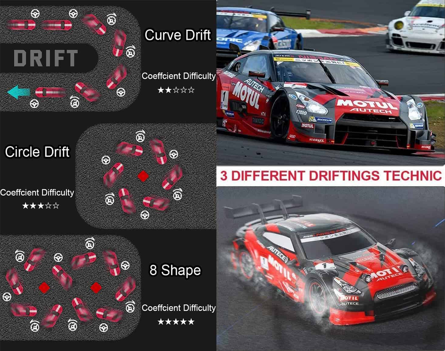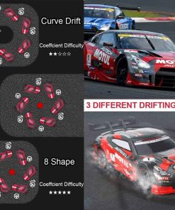 2. Coche de Deriva RC: Con 4 neumáticos de carreras y 4 neumáticos de deriva, los dos tipos de neumáticos se pueden desmontar y reemplazar. Cuenta con capacidades superiores de deriva, incluyendo deriva en forma de U, deriva en figura 8, deriva circular y deriva de 360 grados, convirtiéndolo en el coche de control remoto perfecto para deriva. El coche de control remoto es fácil de jugar y deriva.
