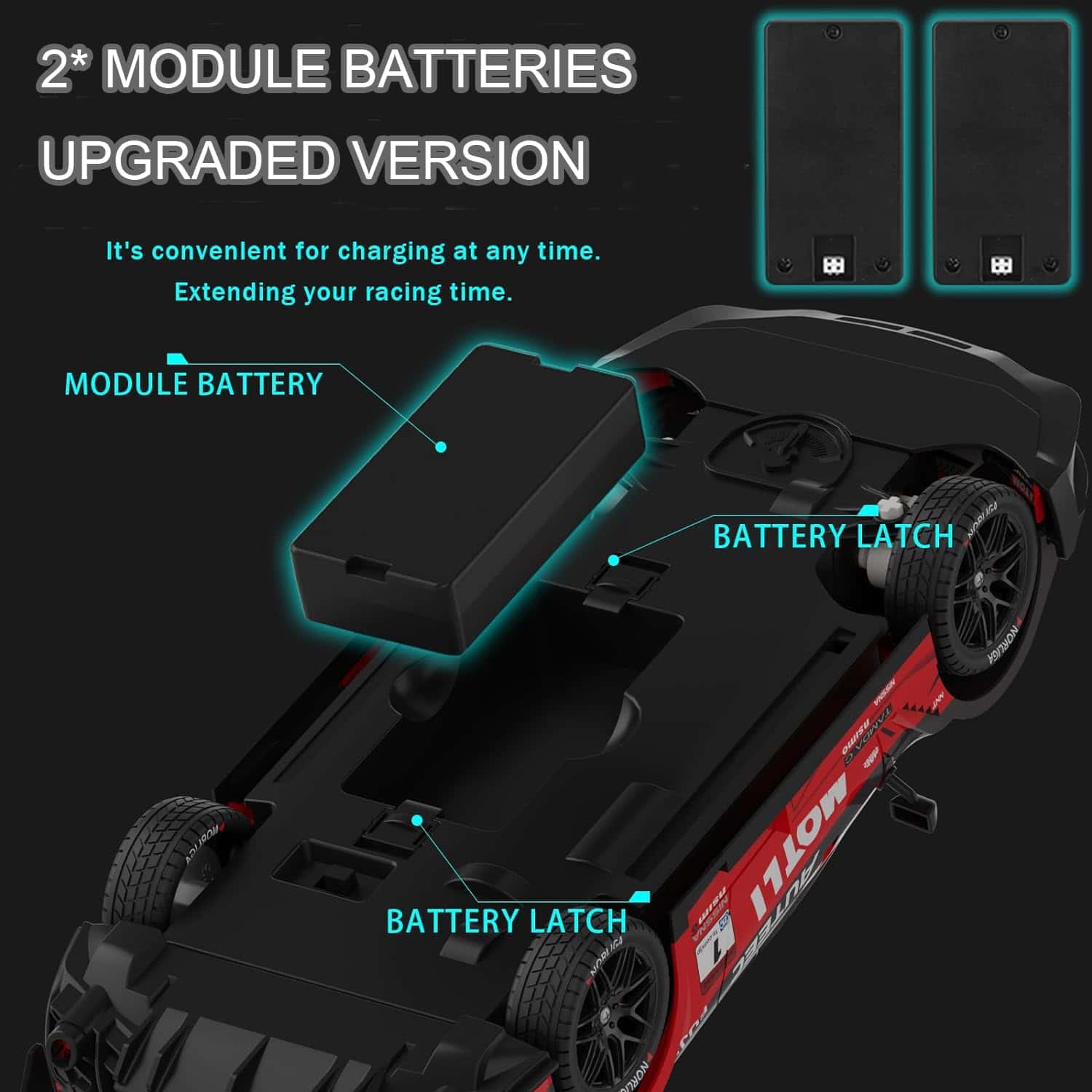 5. Dos Baterías de Módulo Recargables: El Coche de Carreras RC viene con 2 baterías de módulo recargables, que duran aproximadamente 60 minutos. Duplica la felicidad y ofrece una mejor experiencia cuando está completamente cargado. El coche de hobby RC es una opción decente para adultos mayores de 16 años en vacaciones.