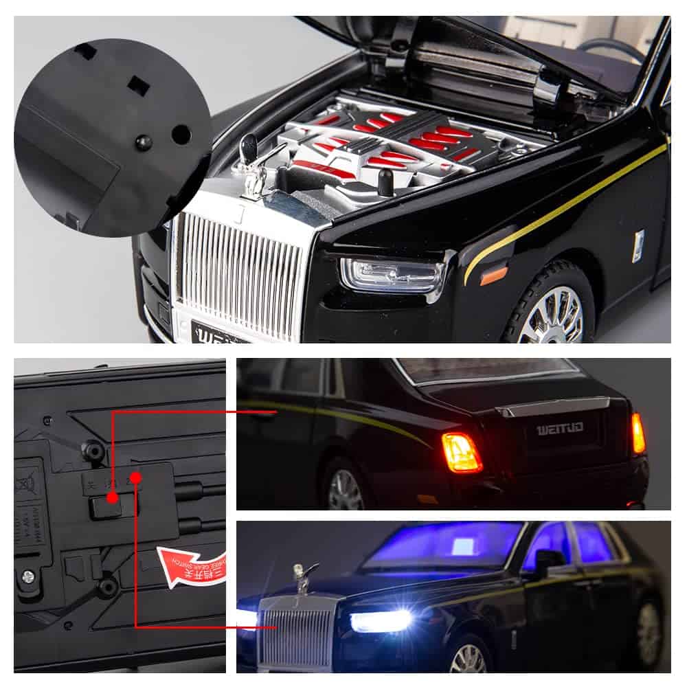 WAKAKAC 1/20 Rolls-Royce Característica: 1.1. Después de quitar la ficha de aislamiento de la batería en la placa inferior, encienda el interruptor de la primera marcha, las luces dobles intermitentes de los faros delanteros y traseros se encienden 2. Encienda el interruptor de la segunda marcha, los faros y la luz ambiental interior se encenderán al mismo tiempo 3. El abridor de puertas se puede usar cuando se abre la puerta, y la alarma entrará en vigencia cuando se abra la puerta 4. Restauración de simulación, se pueden abrir seis puertas, hay un botón debajo del coche para hacer que aparezca el logo del capó y se levante, y el maletero trasero se puede cargar con equipaje 5. Presione el volante para hacer sonar la bocina 6. Coloque el coche en el suelo plano, presione el cuerpo del coche y tire hacia atrás, el coche avanzará (con la función de retroceso)