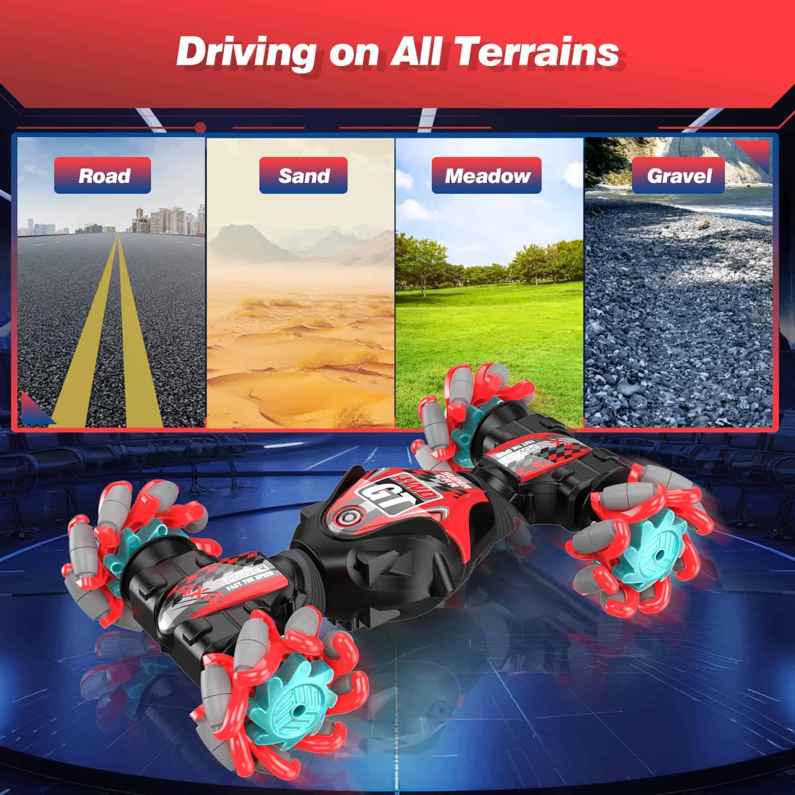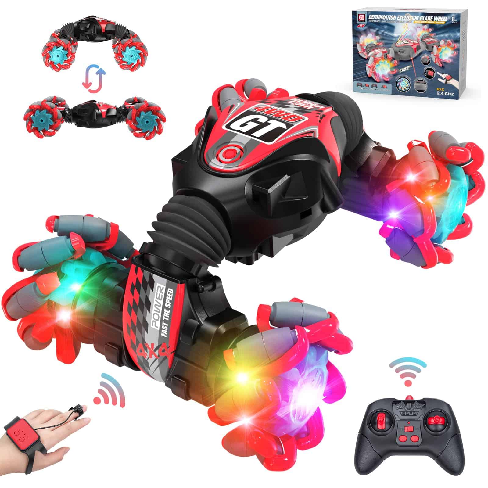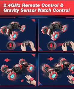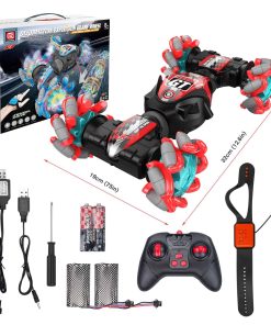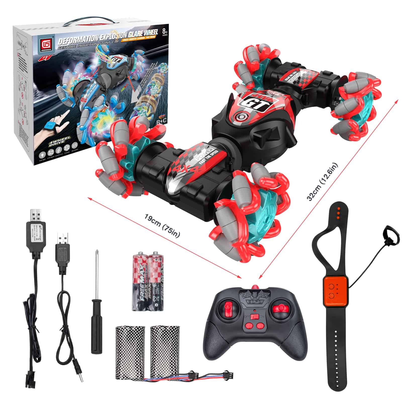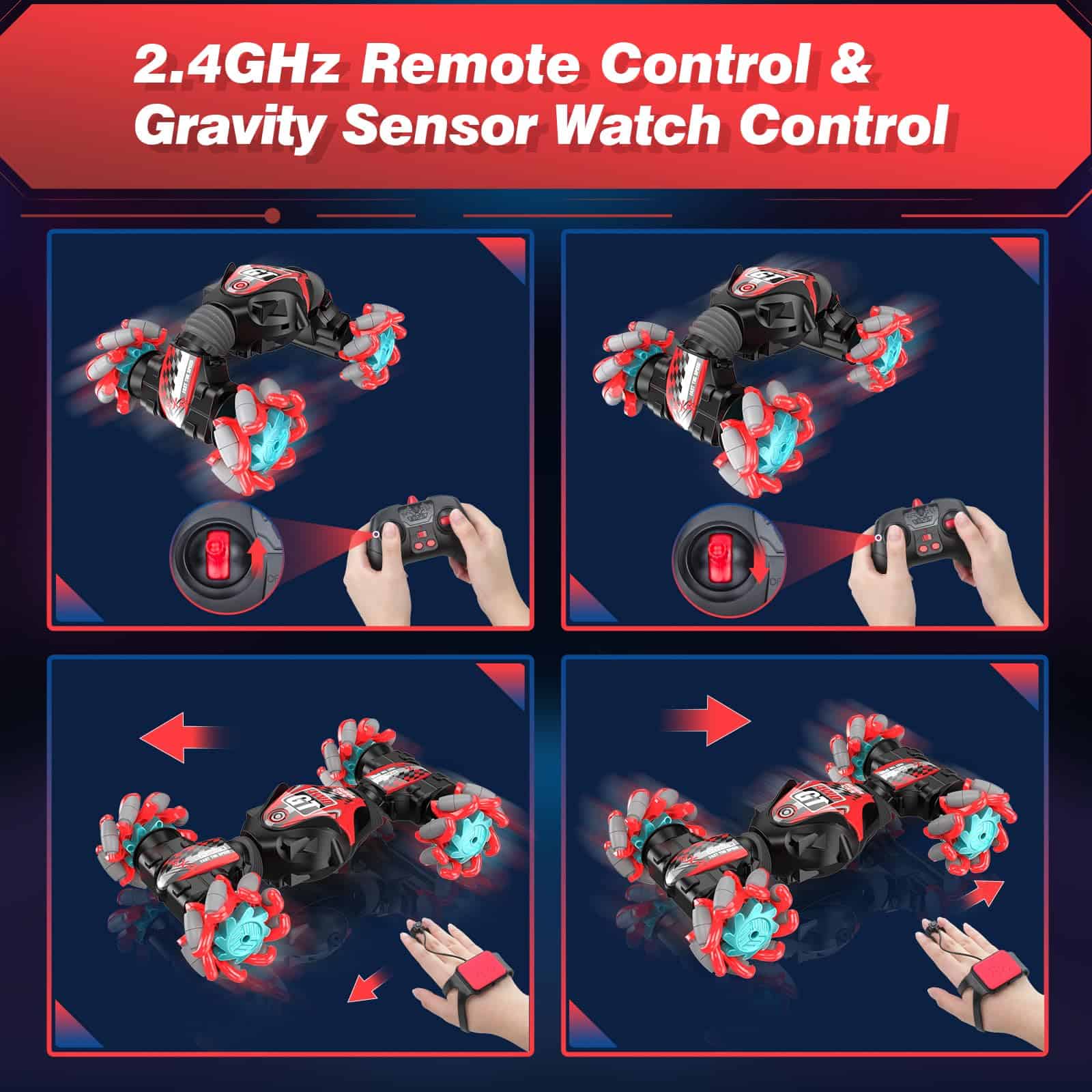 ¿El coche de acrobacias a gestos es un regalo seguro para los niños?Este coche de acrobacias a gestos está hecho de plástico ABS duradero y reciclado, que es seguro para los humanos y el medio ambiente, con certificación CPC y CE, puedes comprarlo sin ninguna preocupación. Un diseño genial de coche de acrobacias a gestos es un regalo ideal para Halloween, Navidad y cumpleaños para niños de 6 a 12 años.¿Cuál es la ventaja de este gran coche de juguete a control remoto?1. Sigue avanzando hasta que se quede sin batería: Nuestro coche de control remoto no se detendrá debido a un vuelco, puede avanzar por ambos lados. Cuando el coche de acrobacias a gestos se volcó de un lado, podías hacer clic en el botón de torsión del cuerpo para hacerlo avanzar.2. Tracción en las 4 ruedas: Cada rueda está equipada con un motor, lo que hace que el coche RC esté lleno de potencia y pueda atravesar arena, guijarros, césped y conducción dura fácilmente.3. Diseño único de ruedas: Cuando nuestro coche de acrobacias a gestos está en marcha, sus ruedas se abrirán como una flor, cuando se detenga la marcha, la rueda se cerrará, súper genial y lleno de diseño tecnológico.4. Luz LED Colorida y Música Emocionante: Función perfecta para que juegues por la noche, las ruedas con LED mostrarán una vista maravillosa para ti. La música emocionante es perfecta para carreras de coches RC a gestos.5. 2 formas de control diferentes para diferentes usos: El controlador de reloj de gestos está diseñado para que los usuarios de coches RC disfruten de la experiencia mágica y de ciencia ficción. El control remoto de 2.4KHz es perfecto para que los niños jueguen a las carreras de coches RC a gestos. Lista de empaque1x Coche de control remoto1x Control Remoto de 2.4KHz1x Controlador de Reloj de Gestos2x Baterías recargables para el coche RC1x Batería para el Control Remoto de 2.4KHz1x Cable de carga USB para la batería del coche RC1x Cable de carga USB para el controlador de reloj de gestos1x Destornillador para reemplazar la batería