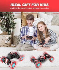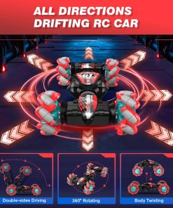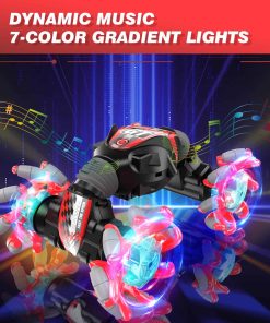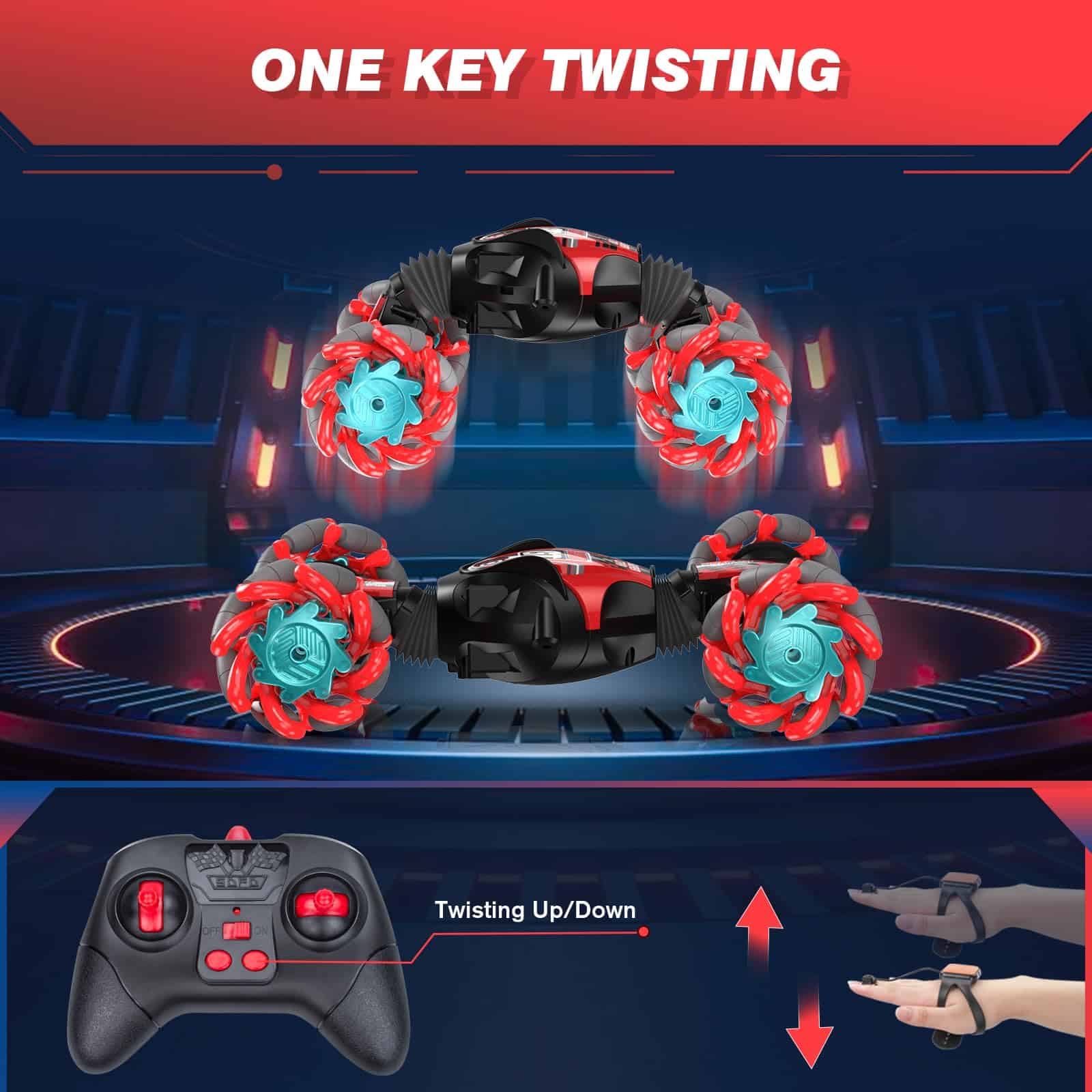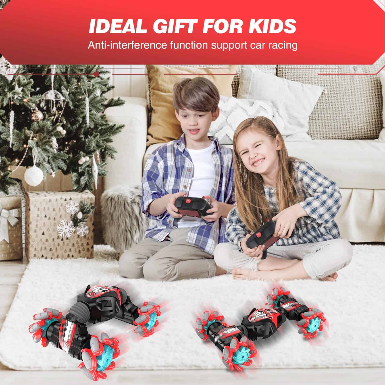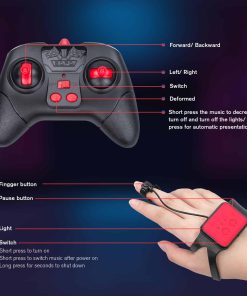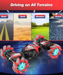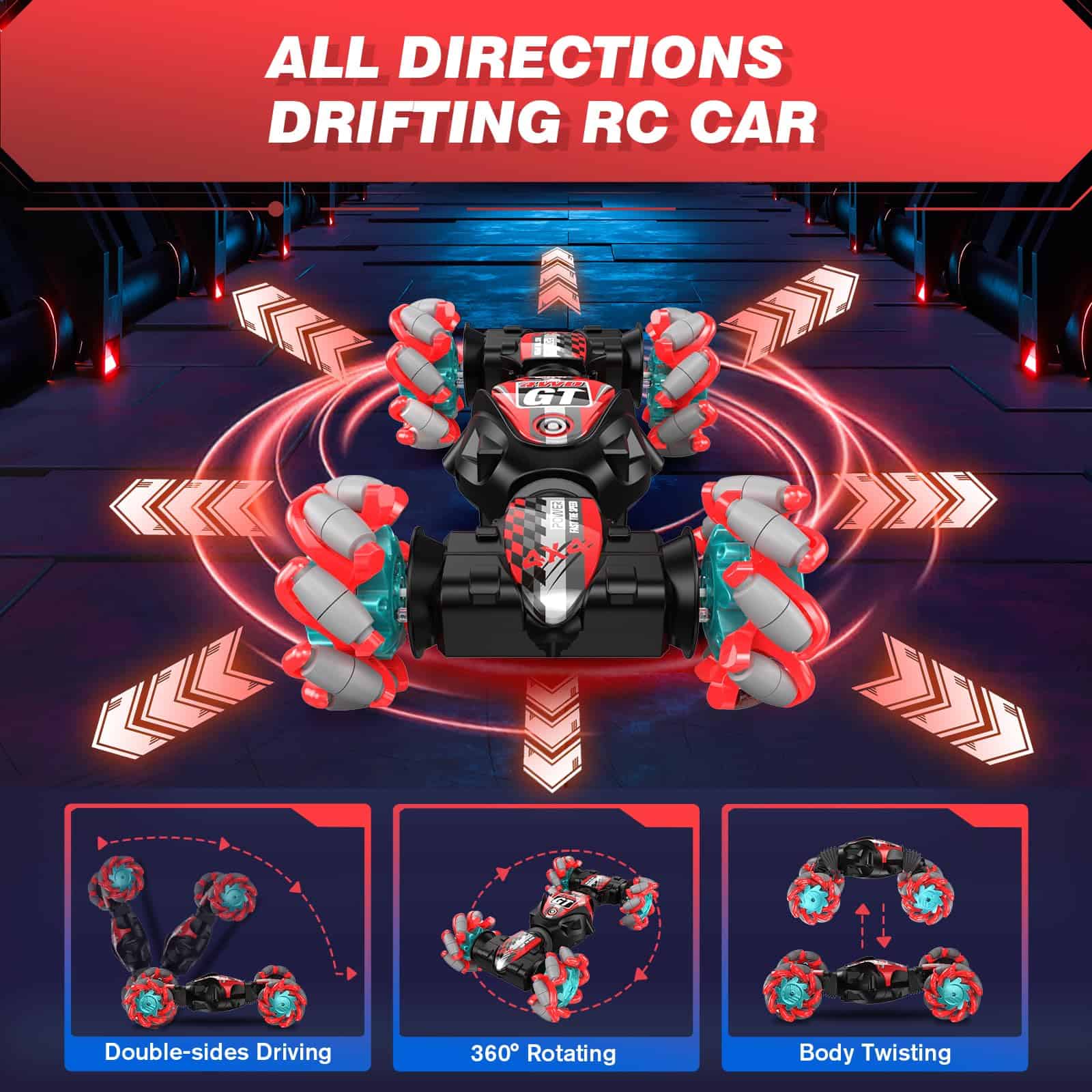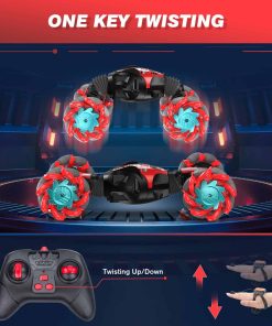 ¿El coche de acrobacias a gestos es un regalo seguro para los niños?Este coche de acrobacias a gestos está hecho de plástico ABS duradero y reciclado, que es seguro para los humanos y el medio ambiente, con certificación CPC y CE, puedes comprarlo sin ninguna preocupación. Un diseño genial de coche de acrobacias a gestos es un regalo ideal para Halloween, Navidad y cumpleaños para niños de 6 a 12 años.¿Cuál es la ventaja de este gran coche de juguete a control remoto?1. Sigue avanzando hasta que se quede sin batería: Nuestro coche de control remoto no se detendrá debido a un vuelco, puede avanzar por ambos lados. Cuando el coche de acrobacias a gestos se volcó de un lado, podías hacer clic en el botón de torsión del cuerpo para hacerlo avanzar.2. Tracción en las 4 ruedas: Cada rueda está equipada con un motor, lo que hace que el coche RC esté lleno de potencia y pueda atravesar arena, guijarros, césped y conducción dura fácilmente.3. Diseño único de ruedas: Cuando nuestro coche de acrobacias a gestos está en marcha, sus ruedas se abrirán como una flor, cuando se detenga la marcha, la rueda se cerrará, súper genial y lleno de diseño tecnológico.4. Luz LED Colorida y Música Emocionante: Función perfecta para que juegues por la noche, las ruedas con LED mostrarán una vista maravillosa para ti. La música emocionante es perfecta para carreras de coches RC a gestos.5. 2 formas de control diferentes para diferentes usos: El controlador de reloj de gestos está diseñado para que los usuarios de coches RC disfruten de la experiencia mágica y de ciencia ficción. El control remoto de 2.4KHz es perfecto para que los niños jueguen a las carreras de coches RC a gestos. Lista de empaque1x Coche de control remoto1x Control Remoto de 2.4KHz1x Controlador de Reloj de Gestos2x Baterías recargables para el coche RC1x Batería para el Control Remoto de 2.4KHz1x Cable de carga USB para la batería del coche RC1x Cable de carga USB para el controlador de reloj de gestos1x Destornillador para reemplazar la batería