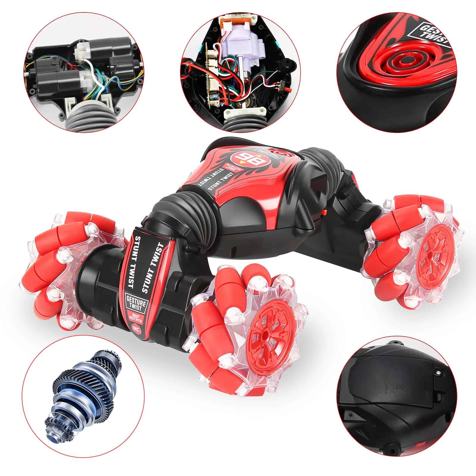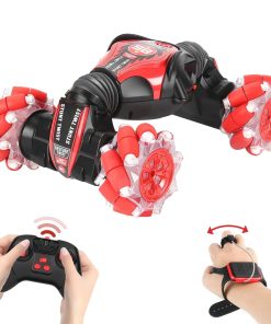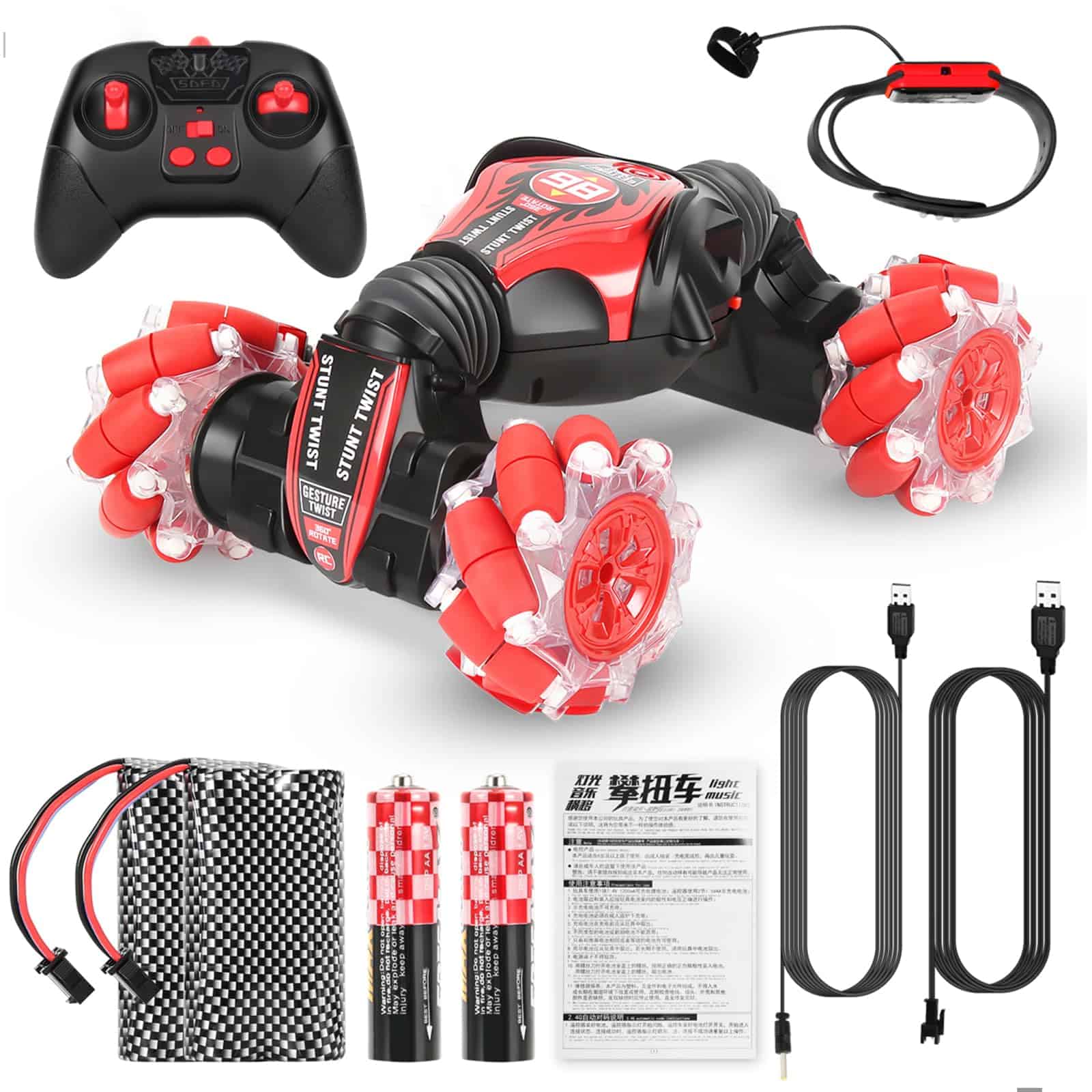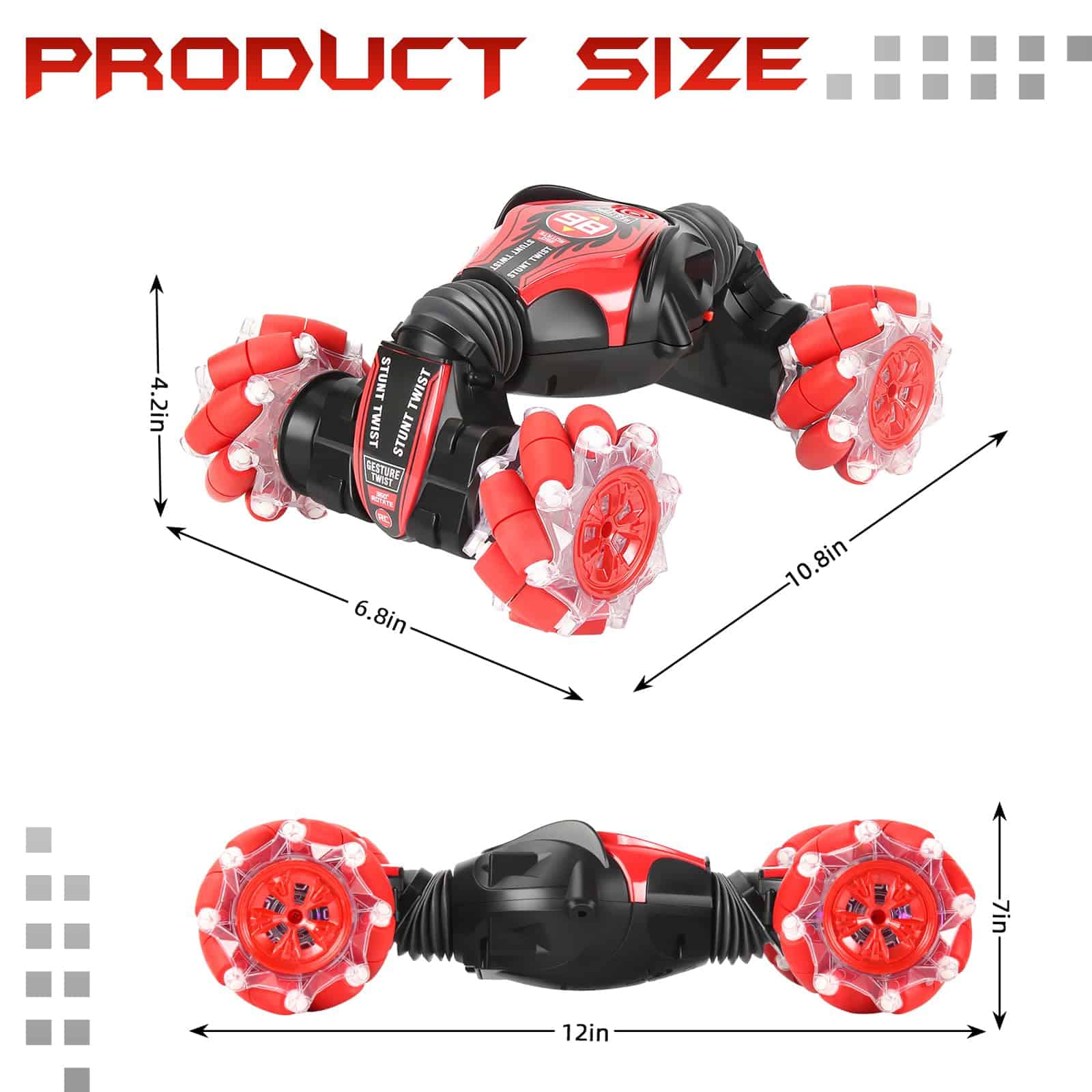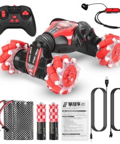 Coche de acrobacias RC con sensor de gestos, ideal para niños y niñas de 6-12 años. Este coche de juguete todo terreno 4WD viene en un atractivo color rojo. Equipado con controladores duales antifértil para una experiencia de conducción más placentera. Puede cambiar entre modos en carretera y fuera de carretera, realizar demostraciones automáticas, deformaciones de tecla única, movimiento omnidireccional, deriva lateral, rotación doble de 360º y subir colinas en incrementos de 45º. Fabricado con materiales duraderos y a prueba de golpes. Diseñado con impresionantes efectos de iluminación y música para una experiencia visual y auditiva emocionante. Incluye control remoto y baterías recargables. El regalo perfecto para los más pequeños en su cumpleaños, Navidad y Año Nuevo. Apto para uso en interiores y exteriores.