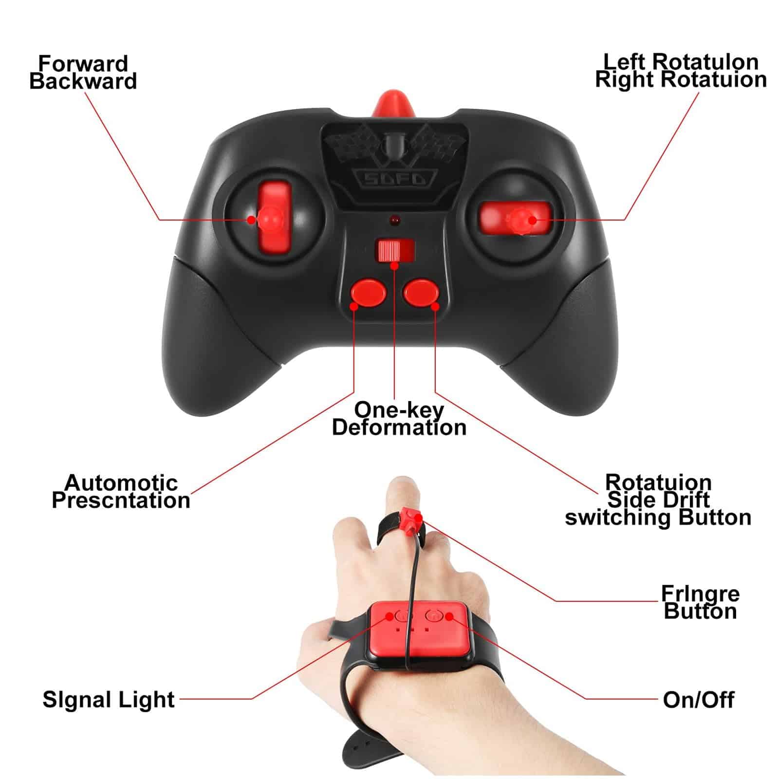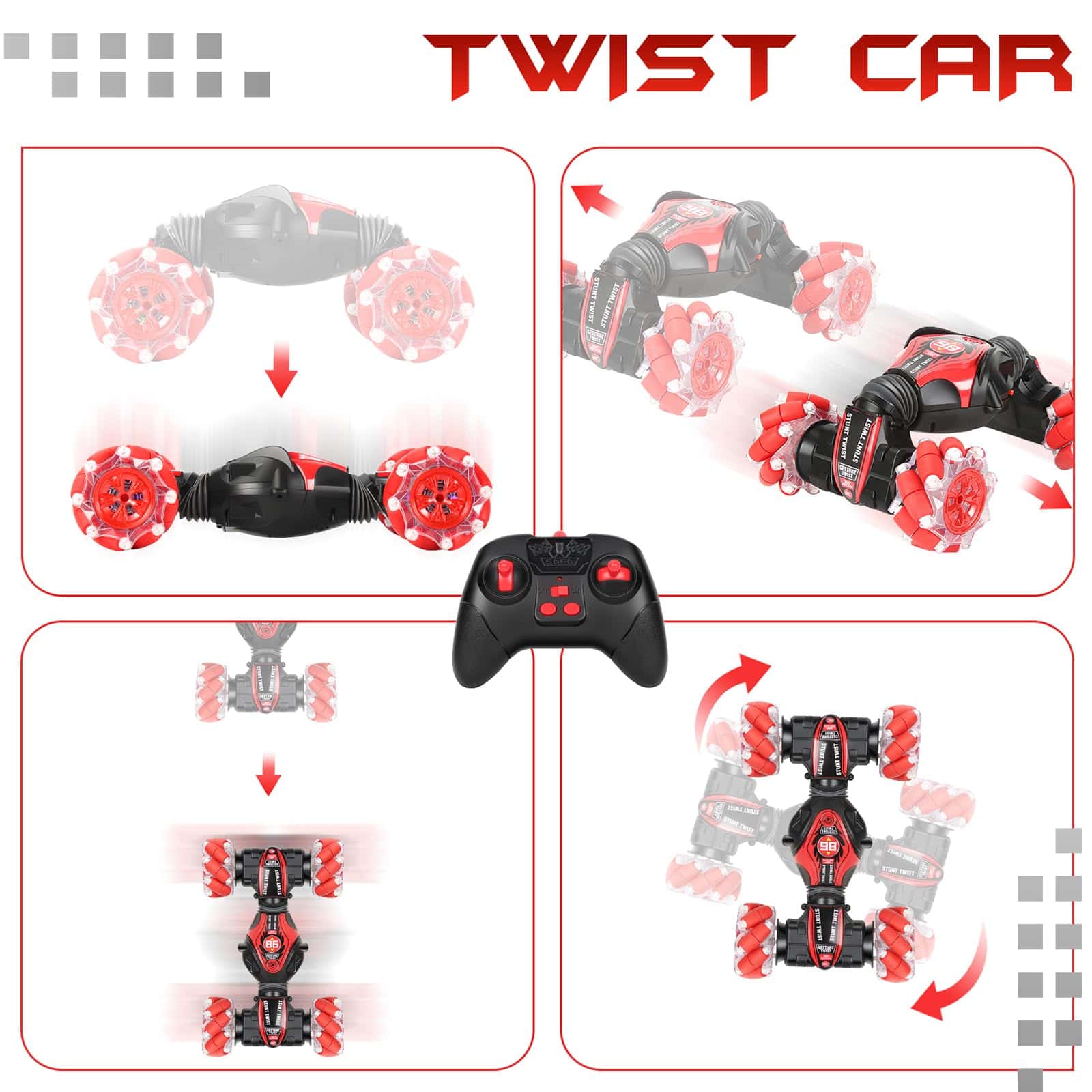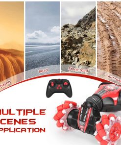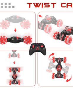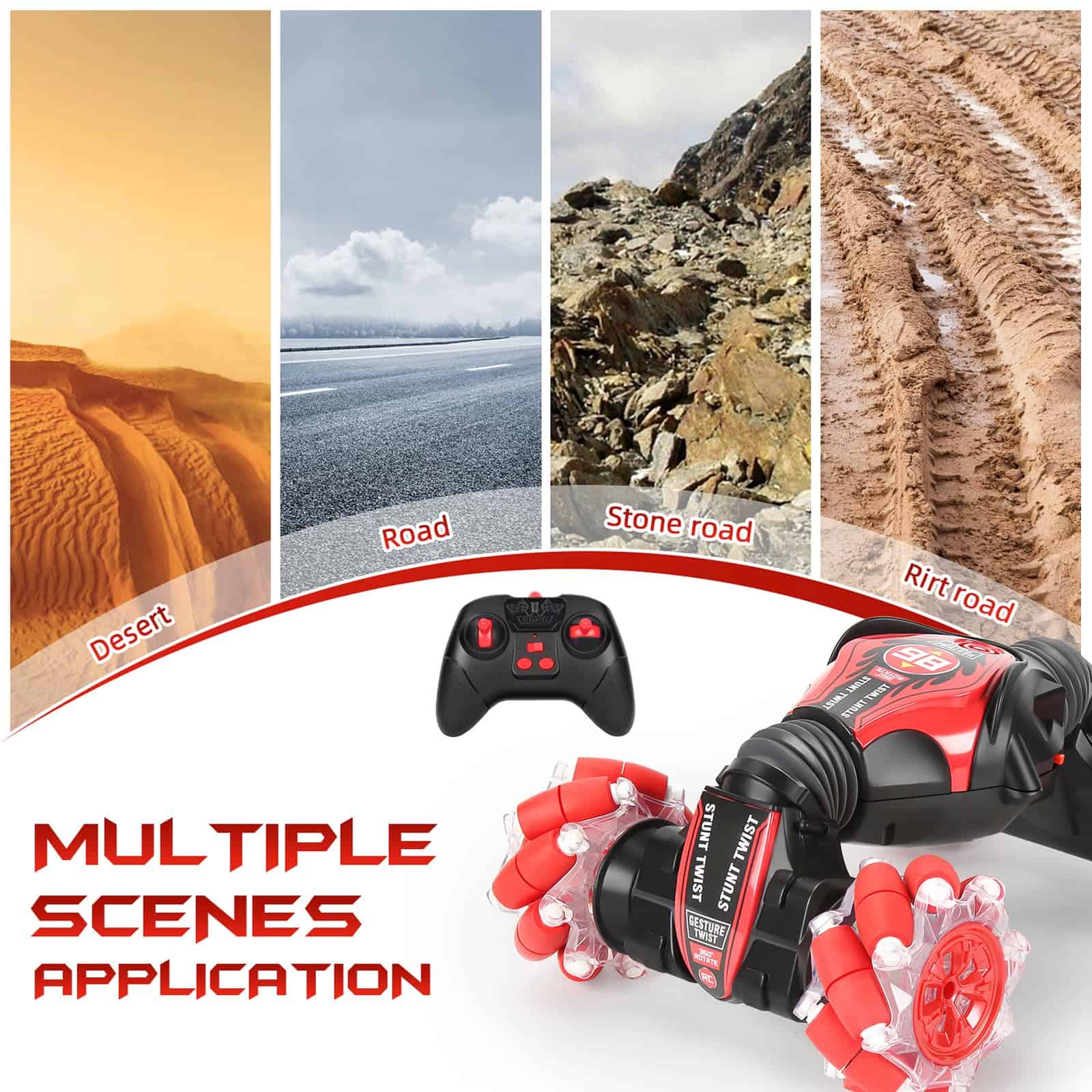 Coche de acrobacias RC con sensor de gestos, ideal para niños y niñas de 6-12 años. Este coche de juguete todo terreno 4WD viene en un atractivo color rojo. Equipado con controladores duales antifértil para una experiencia de conducción más placentera. Puede cambiar entre modos en carretera y fuera de carretera, realizar demostraciones automáticas, deformaciones de tecla única, movimiento omnidireccional, deriva lateral, rotación doble de 360º y subir colinas en incrementos de 45º. Fabricado con materiales duraderos y a prueba de golpes. Diseñado con impresionantes efectos de iluminación y música para una experiencia visual y auditiva emocionante. Incluye control remoto y baterías recargables. El regalo perfecto para los más pequeños en su cumpleaños, Navidad y Año Nuevo. Apto para uso en interiores y exteriores.