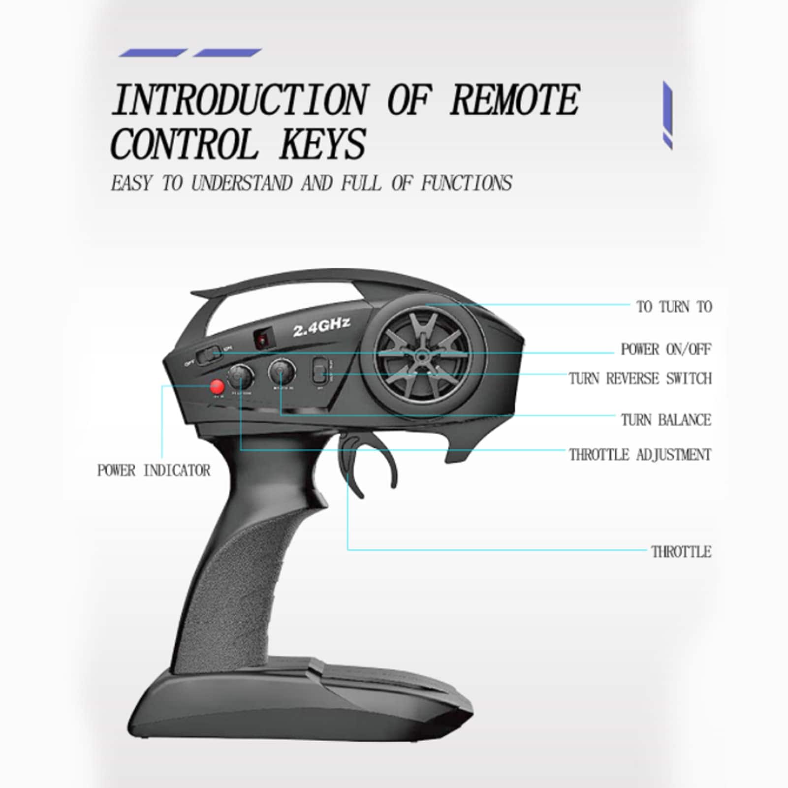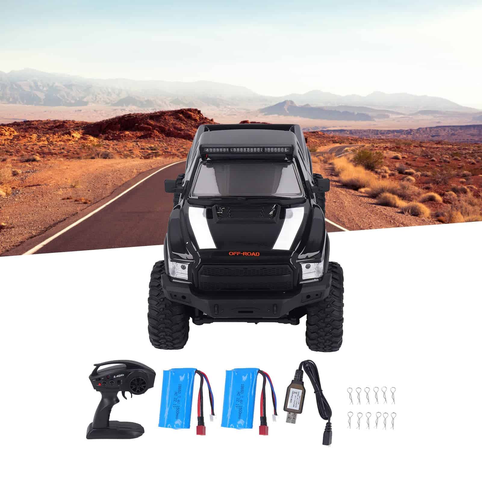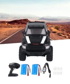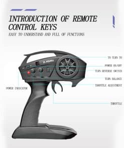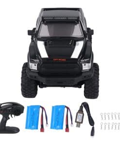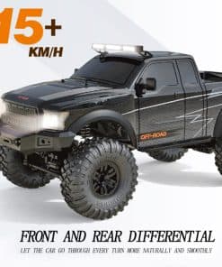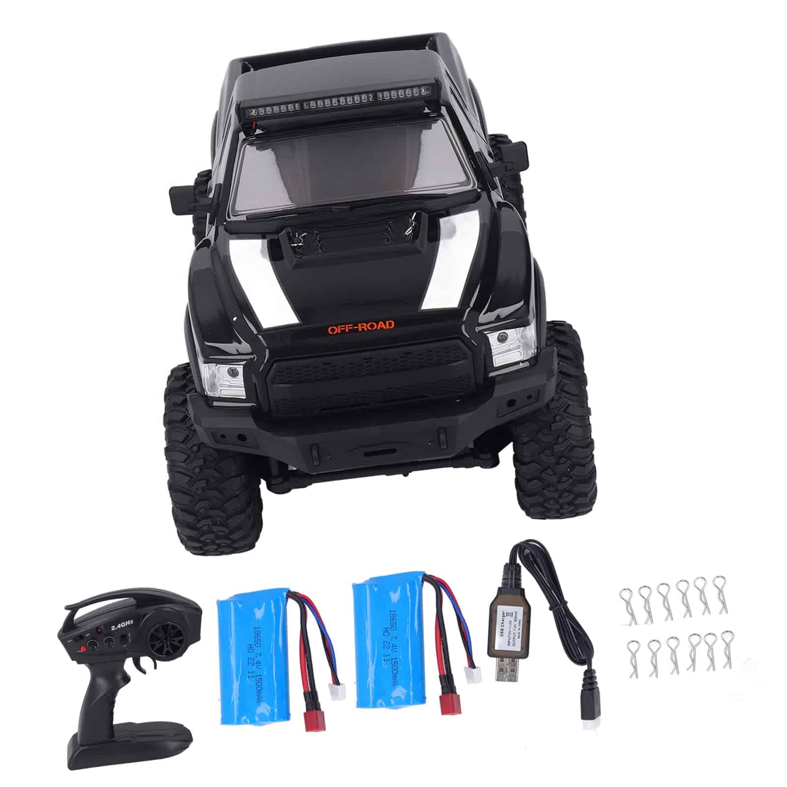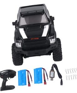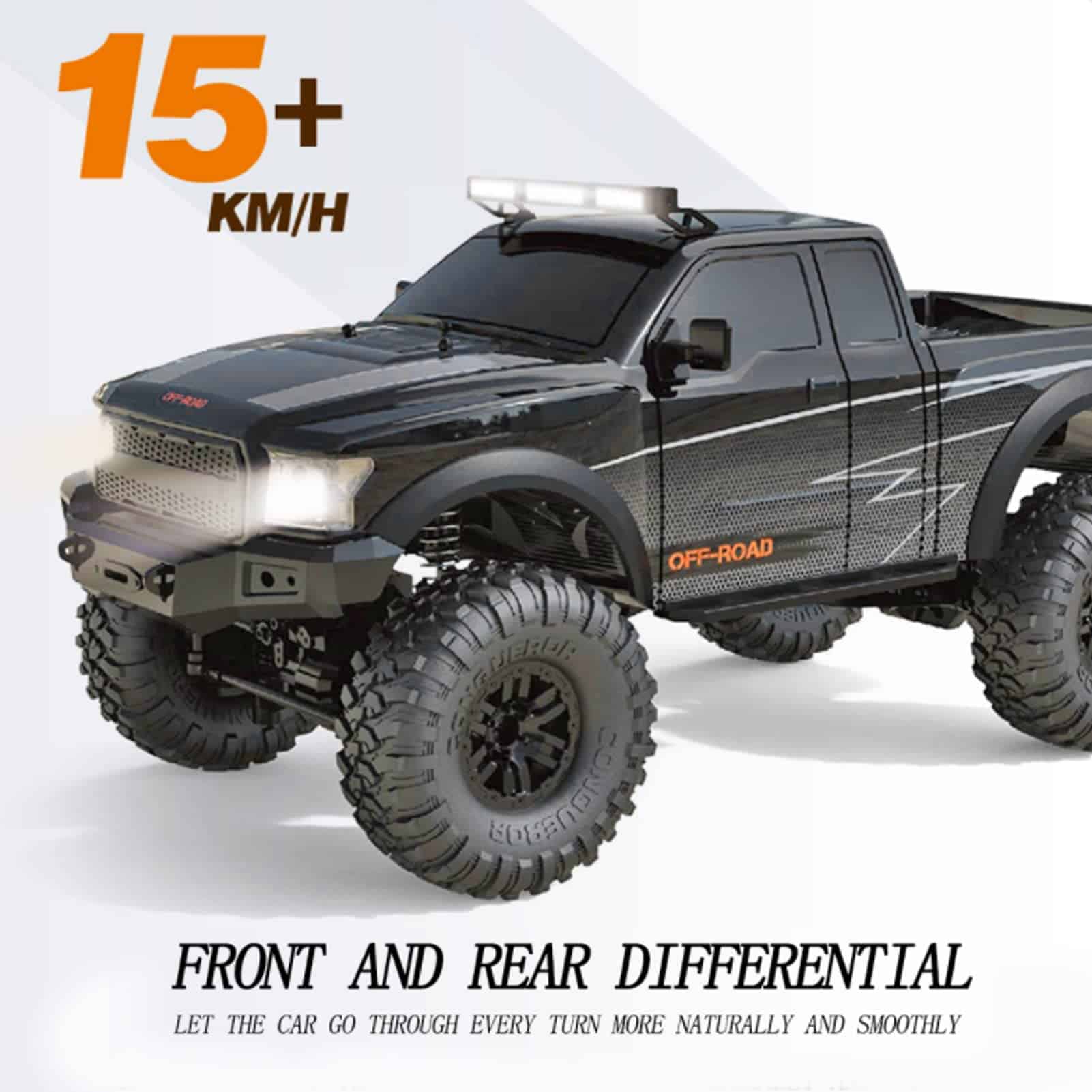 1. 2.4GHz Inalámbrico: Este crawler RC utiliza un sistema inalámbrico de 2.4 GHz que asegura una señal estable. La dirección de las ruedas delanteras se puede ajustar fácilmente a través del control remoto.