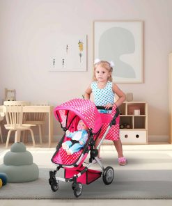 ¡NUEVO ESTILO! Dale a la pretendida de juego de tu pequeña princesa la actualización que tanto necesita con este Cochecito de Muñecas de Lujo con Flores de Exquisite Buggy. La adición definitiva a la representación de tu hijo, una muñeca o un osito de peluche de hasta 18 pulgadas puede entrar y descansar cómodamente en la cama muy suave del cochecito. Este cochecito de bebé viene con una serie de características amigables para los niños. Viene con un mango resistente que se puede ajustar hasta 28 pulgadas, basado en la altura y preferencia de tu hijo. La orientación del mismo mango también puede moverse de adelante hacia atrás y viceversa, haciendo que la muñeca mire a su pequeña mamá o a la calle. Probado con todas las certificaciones de seguridad, la construcción de 4 ruedas fácilmente giratorias de este elegante carruaje ofrece una excelente y suave movilidad, permitiendo que tu hijo disfrute de un control seguro y sin esfuerzo. Una capota convertible y una cuna inclinable vienen como características adicionales. ¡Pero eso no es todo! Este producto de lujo incluye múltiples compartimentos: una cesta en la parte inferior y una bolsa de pañales gratis no solo para almacenar juguetes, ropa de repuesto, accesorios de muñecas y snacks, sino para mejorar el juego del niño. Con piezas fáciles de ensamblar y mantener, este cochecito de muñecas será el compañero perfecto en los paseos de tu pequeña en el parque.
