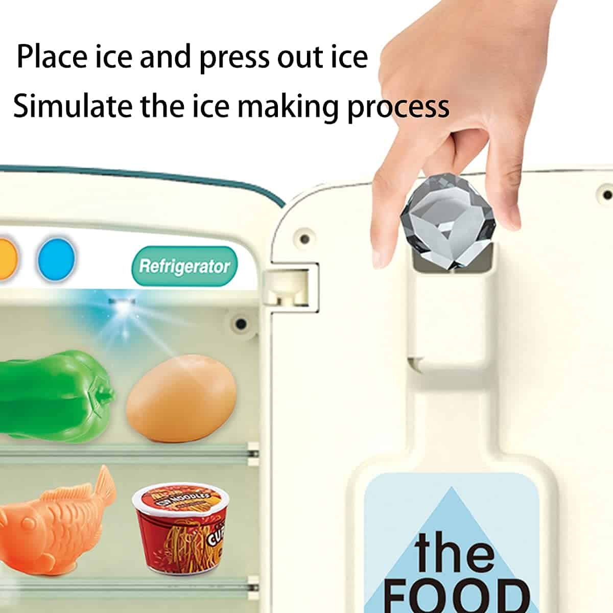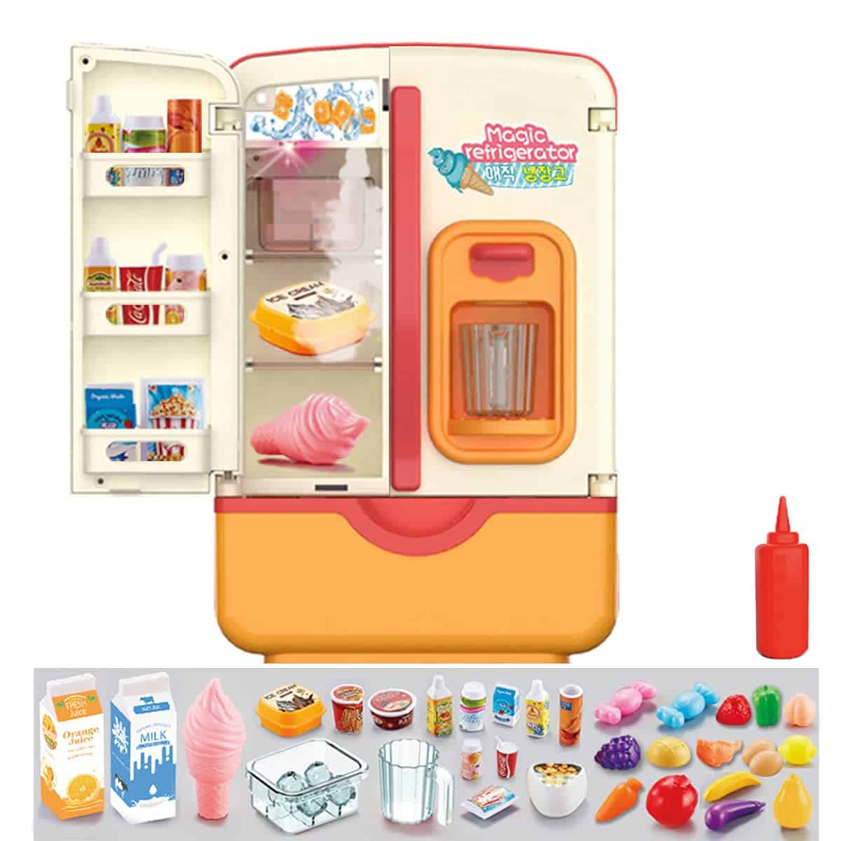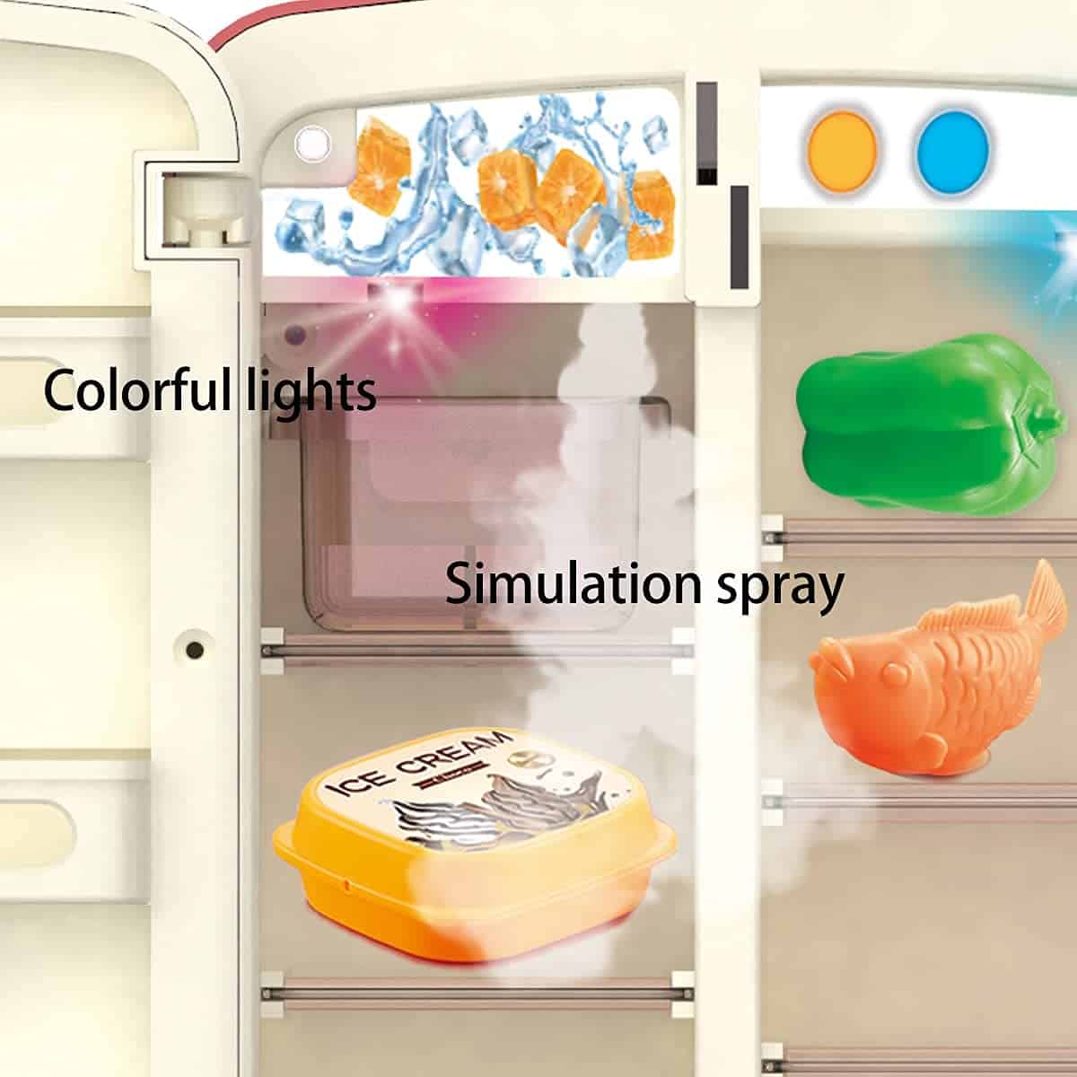 Set de juguete de refrigerador para niños con efectos realistas de iluminación y spray y música, adecuado para niños pequeños e infantiles juego de cocina, completo con comida simulada, materiales