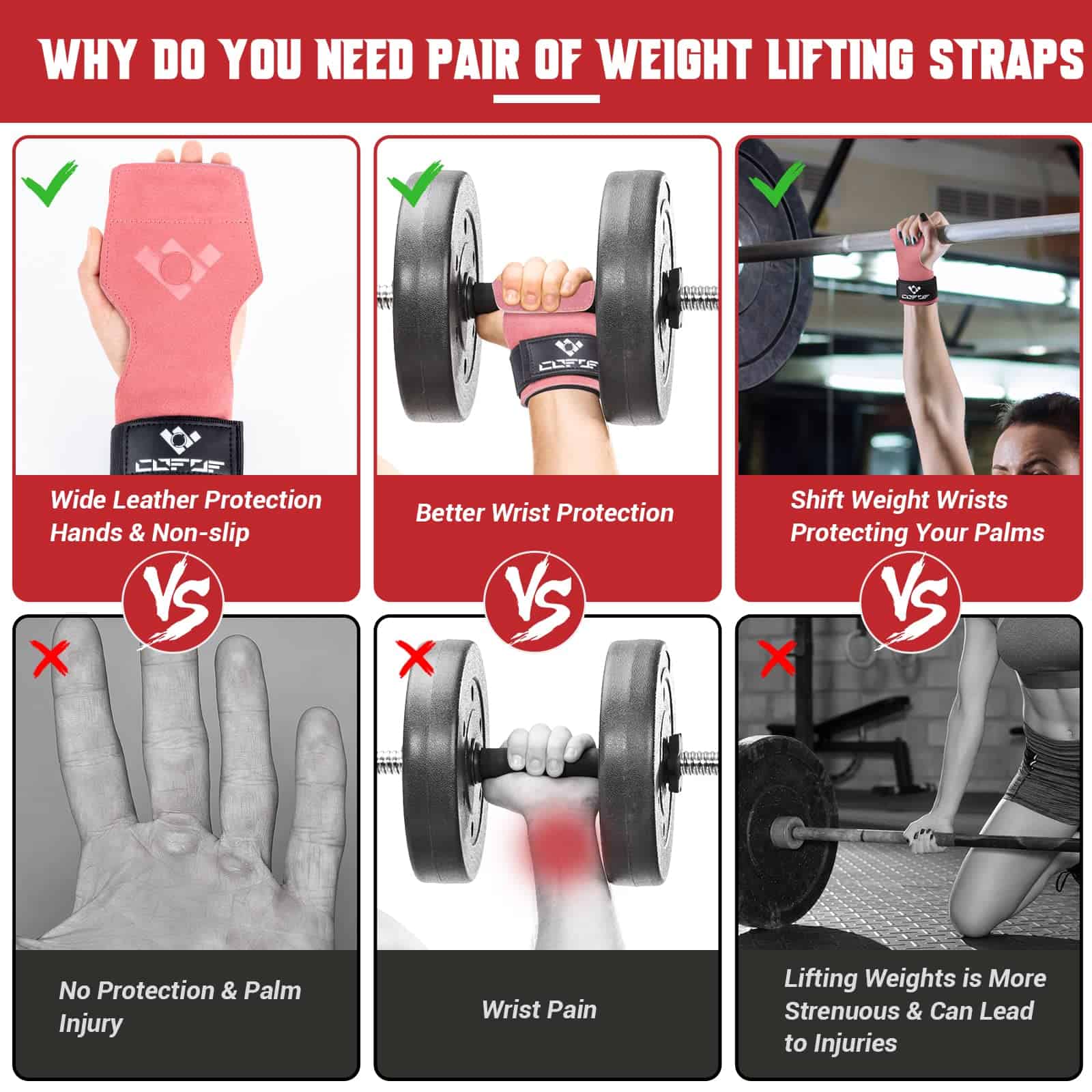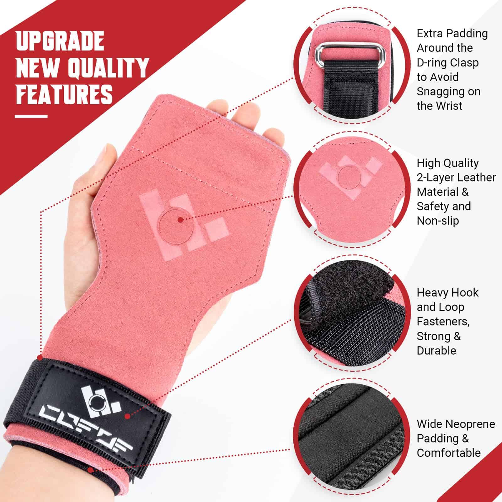1. Correa de muñeca para levantamiento de pesas mejorada: Nuestras correas de muñeca para levantar peso están hechas de doble capa de cuero suave que es de alta calidad y está diseñado ergonómicamente para adaptarse a tus manos y proporcionar un mejor agarre. Agregando acolchado adicional alrededor del mosquetón en forma de D mantén tu muñeca de ser apretada y sentir dolorosa. La correa para levantar peso con gancho y lazo de alta densidad se pueden llevar fácilmente en la muñeca, y se quita y se pone libremente por ti mismo. La almohadilla de neopreno ensanchada te hace sentir cómodo.