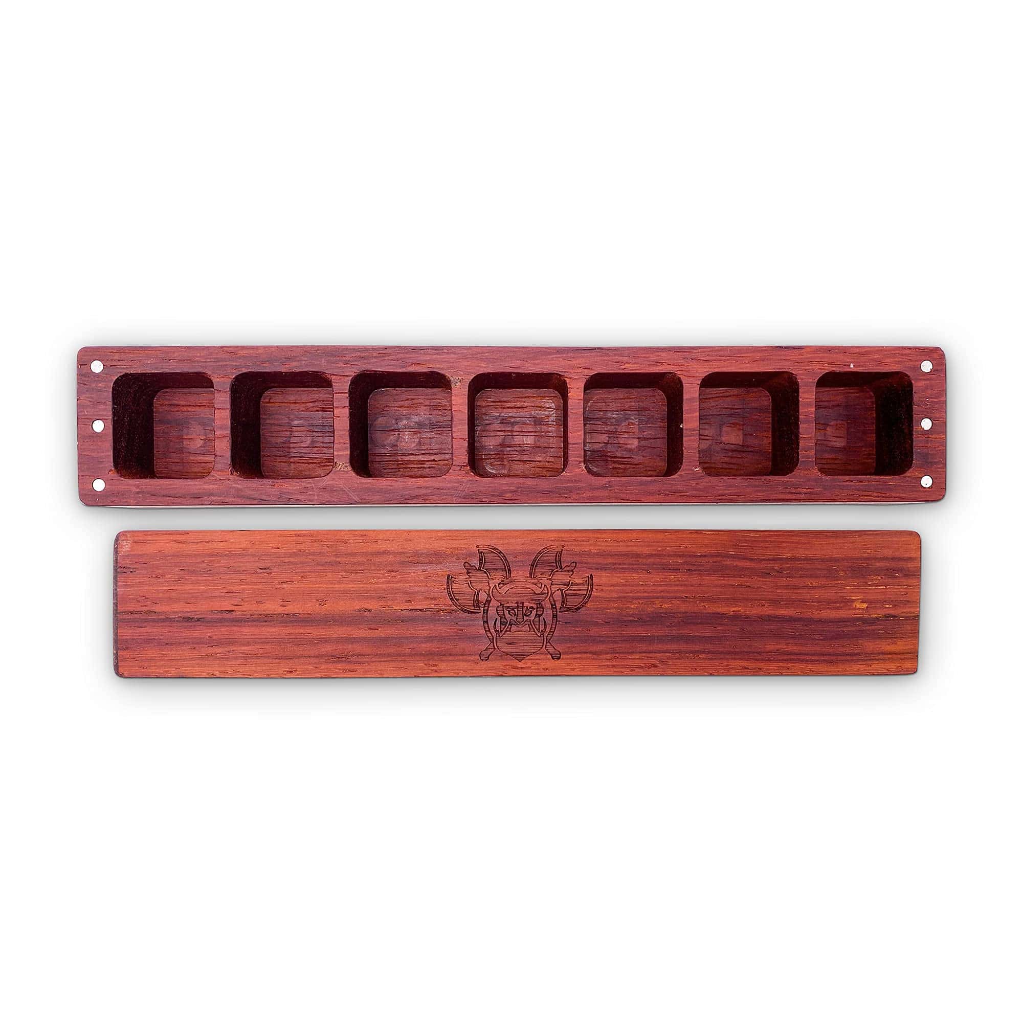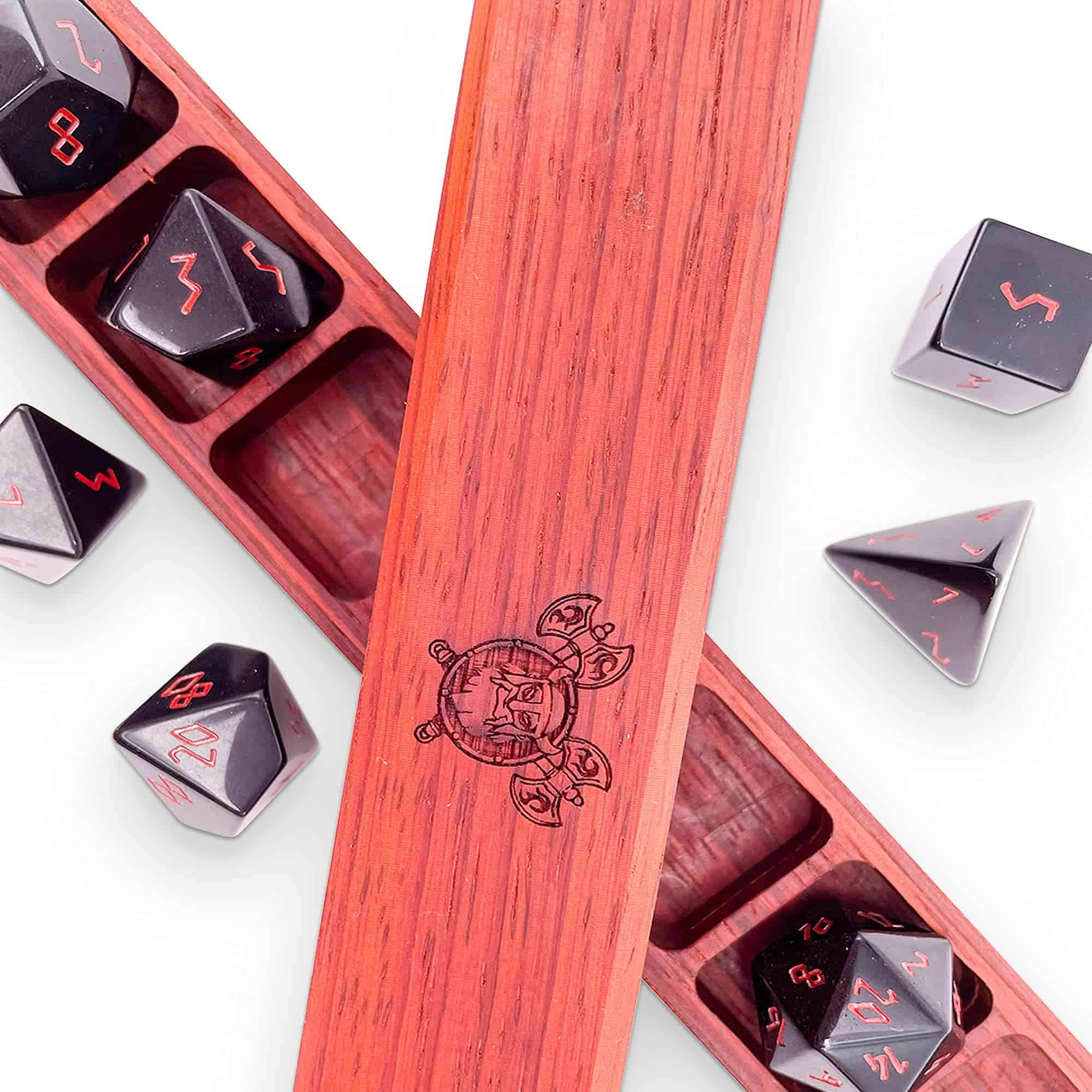 Dale a tus dados más especiales el trato real que se merecen con el Cofre de Contención – Padauk. Celebrado desde el siglo X a.C. por su espléndido color rojo-anaranjado y su resistencia, el Padauk adornaba estructuras reales, templos, muebles e incluso copas y cáliz reales. Este duro, robusto madera posee un brillo suave y natural y una encantadora veta recta que aumenta su inmensa belleza al ser tallada y pulida. Crecido típicamente en climas tropicales, esta madera rojo vermellón se obtiene de diferentes rincones del mundo como la India, Indochina, el Pacífico Sur y África Occidental. Elegante, esbelto y cuidadosamente tallado, este Cofre de Contención complementa tu set de dados como un sueño.