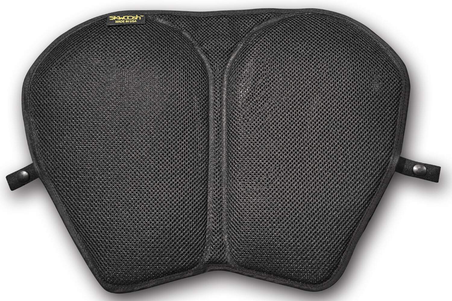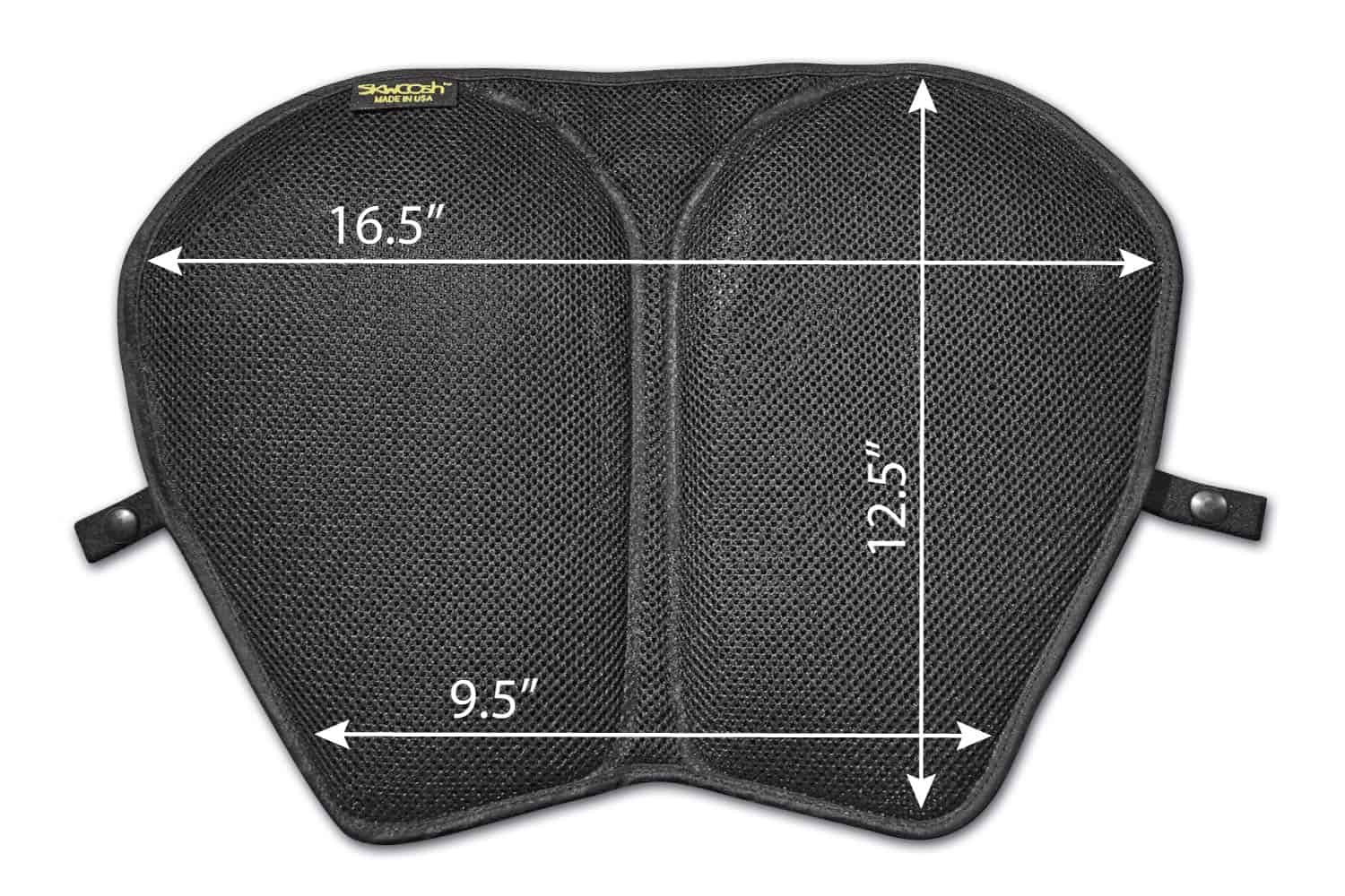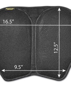 El Cojín de Gel Skwoosh XL para Motocicleta con diseño de malla que circula el aire y canal de aire proporciona comodidad fresca, alivio de presión y amortiguación de vibraciones. El gel fluidizado ligero de SKWOOSH alivia la presión, ayuda a la circulación y elimina el entumecimiento causado por viajes largos. Hay alivio del coxis, un canal de aire incorporado y una base antideslizante para mantener el cojín en su lugar cuando se usa. Viene con una correa de seguridad fácil de instalar y el cojín se dobla para un almacenamiento fácil. Tiene un ancho adicional (16 «W) en la parte superior, es más corto (12 «L) y se estrecha a 9 » en la parte inferior para que se ajuste a la mayoría de las motocicletas grandes de turismo. Este cojín de gel está diseñado para cruceros extendidos y comodidad adicional. Este cojín de gel no necesita mantenimiento, está diseñado para cruceros extendidos y no tiene bombas ni válvulas. SKWOOSH es el cojín de gel más cómodo y sin problemas. Dependiendo del tamaño real de tu asiento, este cojín puede adaptarse a modelos de motocicletas de crucero, turismo y deportivas. Fabricado en EE. UU.