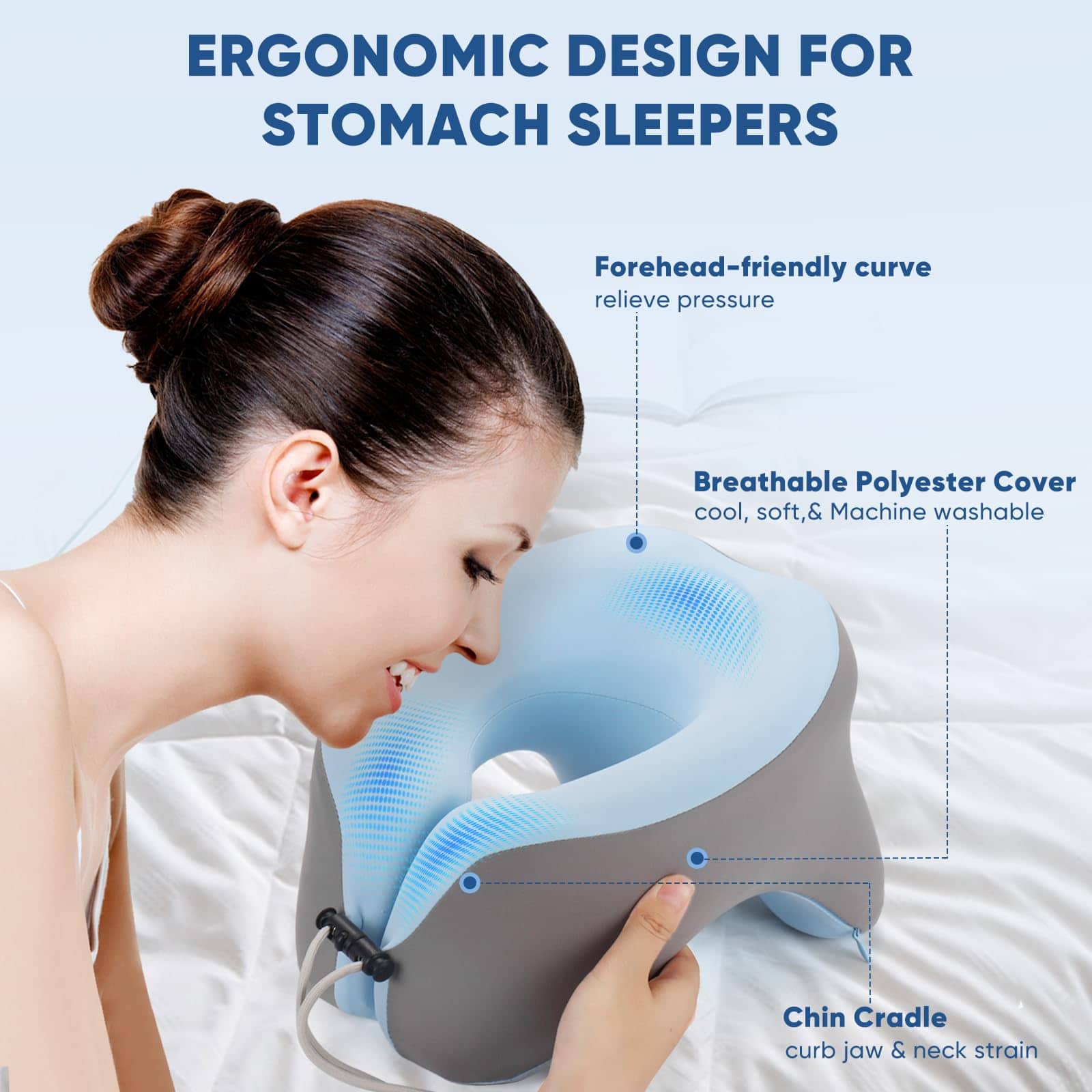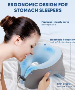 1. Para Viajar, para Siestas Boca Abajo: Diseño ergonómico pendiente de patente que se puede utilizar como lujoso cojín de viaje y también como cojín para dormir boca abajo. Los grandes arcos de ventilación ayudan a proporcionar un mejor flujo de aire si se usa como cojín para dormir boca abajo, la forma ergonómica brinda un soporte completo para el cuello durante los viajes en forma de cojín de viaje.