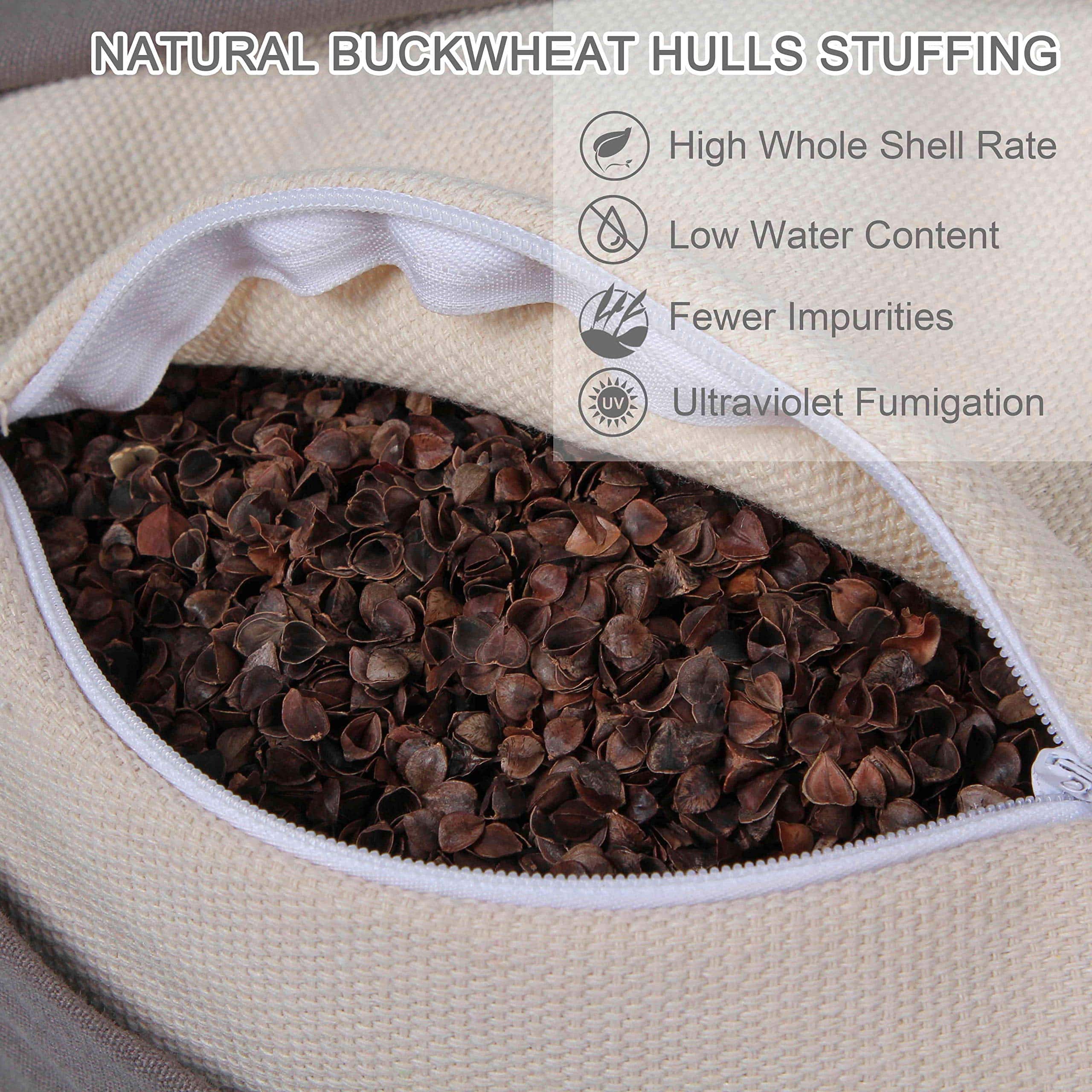 Alta Calidad: El tratamiento de deshidratación, lavado a alta temperatura y fumigación ultravioleta garantiza que las cáscaras de trigo sarraceno natural tengan bajo contenido de agua, estén limpias y libres de harina. La funda de lona encriptada de 10 oz es suave y duradera, también es resistente al encogimiento y a la decoloración. La funda de la funda interna de tela gris es resistente.