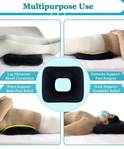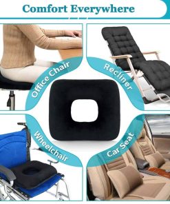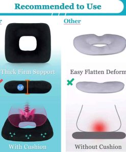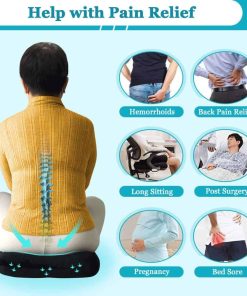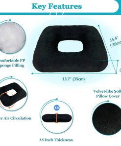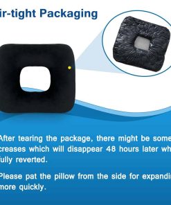 Cojín para alivio del dolor que mide 15″ x 13″ x 3.5″, área de fuerza del cojín ampliada para aguantar hasta 200 libras de peso. Alivia la presión al sentarse cuando se sufre de dolor de espalda, dolor de coxis, dolor lumbar, dolor de piernas, dolor de cadera o cualquier dolor nervioso en la parte baja de la espalda, y ayuda a la recuperación de hemorroides, prostatitis, ciática, bursitis isquial, fisura anal, postparto. Diseñado con un hueco de 5.6″ x 6″ para aliviar la presión después de una cirugía o sentarse. Funciona perfectamente como almohada para posicionar el cuerpo y puede levantar la cabeza, cuello, espalda, cadera, piernas, tobillos en la cama o dormir boca abajo en el hueco del cojín. Fácil de llevar y lavar, compatible con sillas de oficina, asientos de hogar, asientos de automóvil, sillas de ruedas, aviones, trenes y camas. Se recomienda lavar a mano, si se necesita lavar a máquina, colocar el cojín en una bolsa de lavado, usar detergente suave, temperatura del agua no superior a 30 grados Celsius. Lavar por separado, círculo suave para secar, secar a temperatura baja. No usar lejía ni planchar.