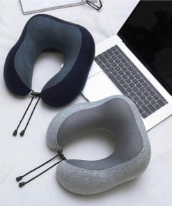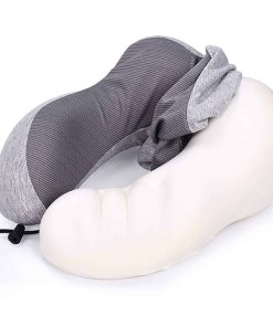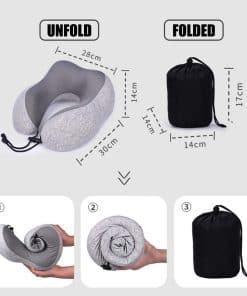 Espuma viscoelástica extra cómoda en el interior. Diseño en forma de D se adapta a la forma del cuello, proporciona descanso cómodo en tu largo viaje. 100% espuma químicamente segura y tela de algodón amigable con la piel proporciona un tacto cómodo. Con antifaz y tapones para los oídos. Con bolsa de almacenamiento, fácil de llevar.