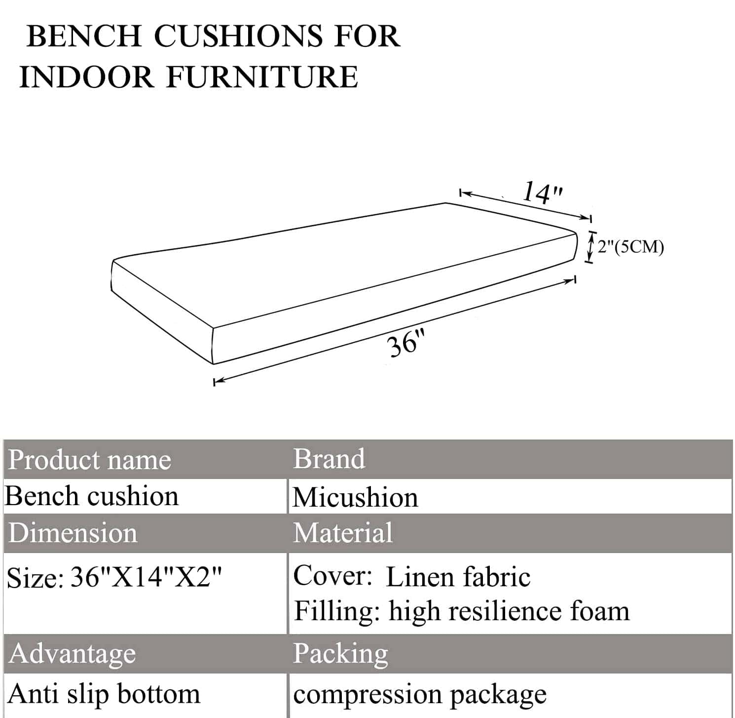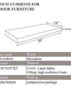 1. Cojín para banco de piano Cojín para banco de piano para muebles de interior tamaño: 36 pulgadas L x 14 pulgadas W x 2 pulgadas T.