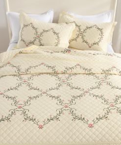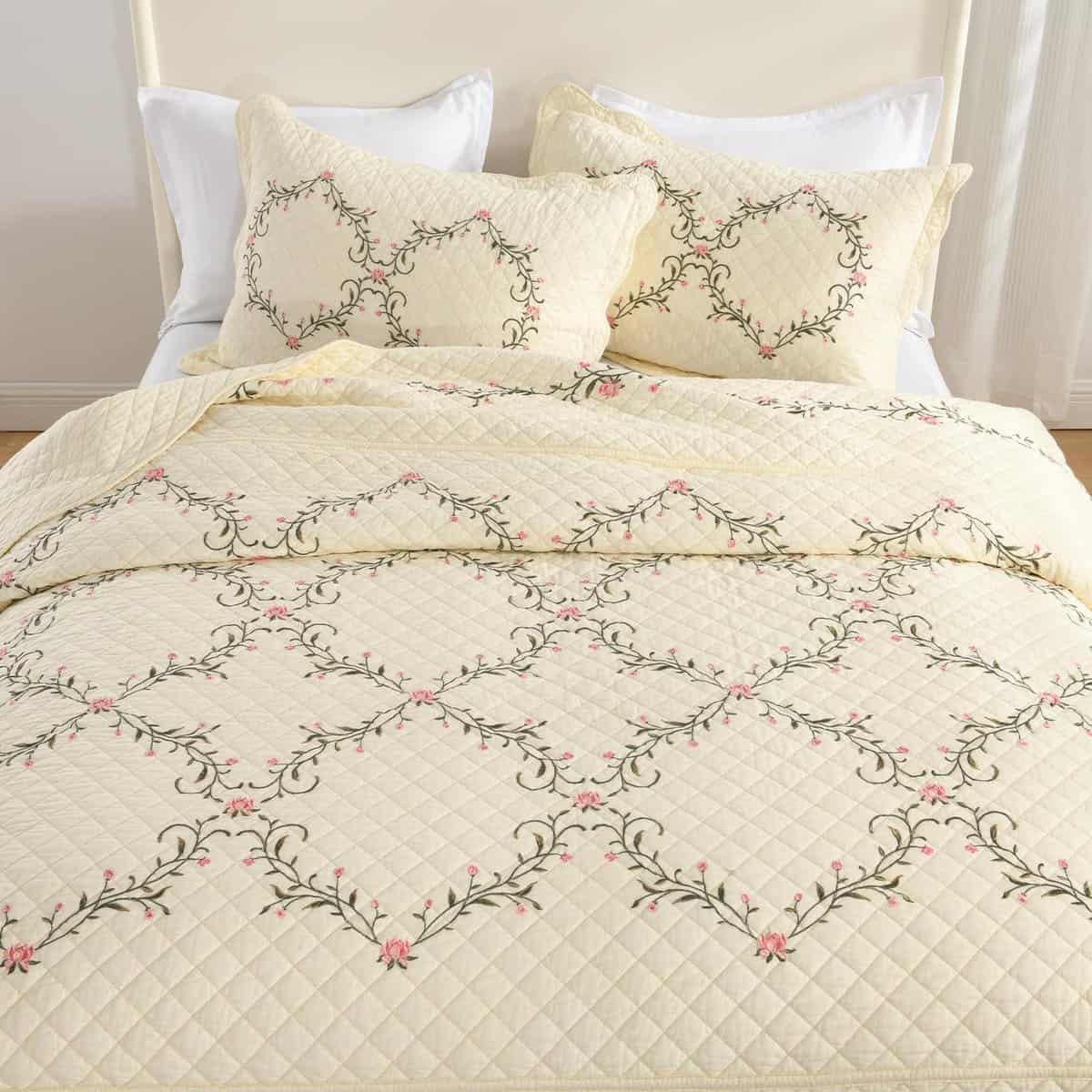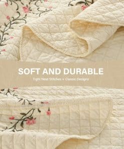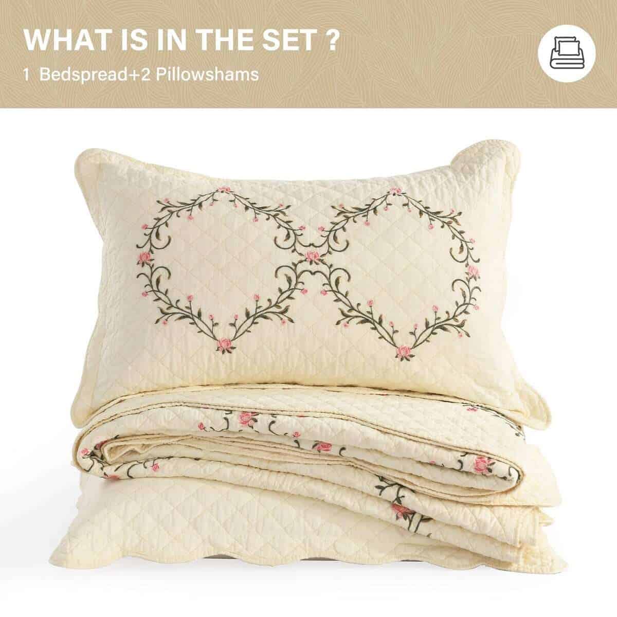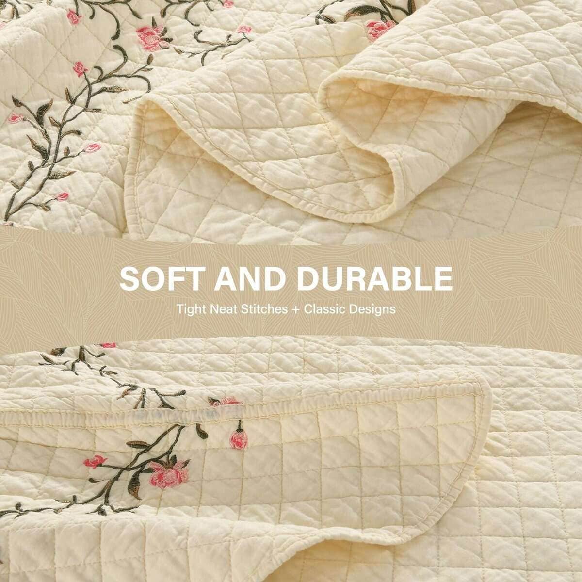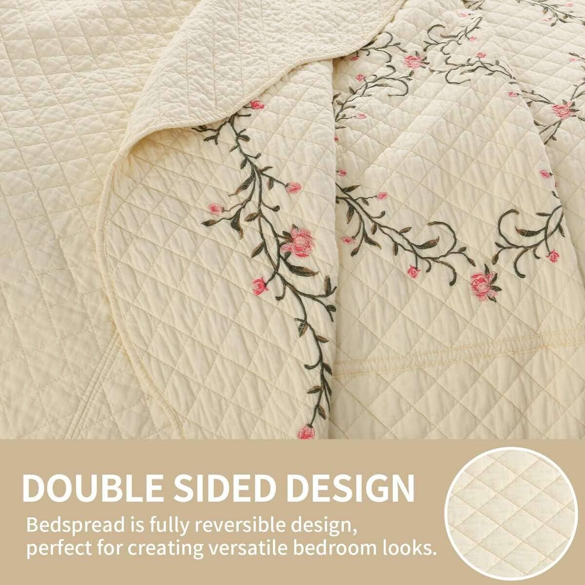 2. Ampliamente Aplicable y Decorativo – Esta colcha reversible acolchada con bordado floral cuenta con patrones de bordado de vid verde y flores rosas/rojas en la cara A y un color crema sólido en la cara B, este juego de cubrecamas suave de color hace que tu habitación sea dulce y acogedora. Este set de cubrecamas decorativas también puede combinar fácilmente con la decoración de tu dormitorio, sala de estar, habitación principal, habitación de invitados, estudio, dormitorio y caravanas. Es una buena opción de regalo.