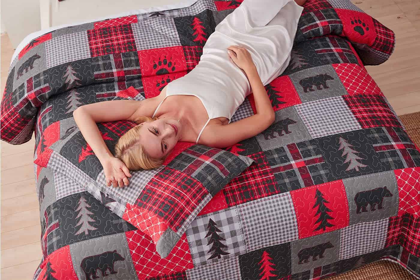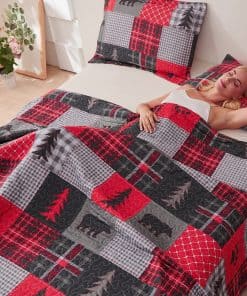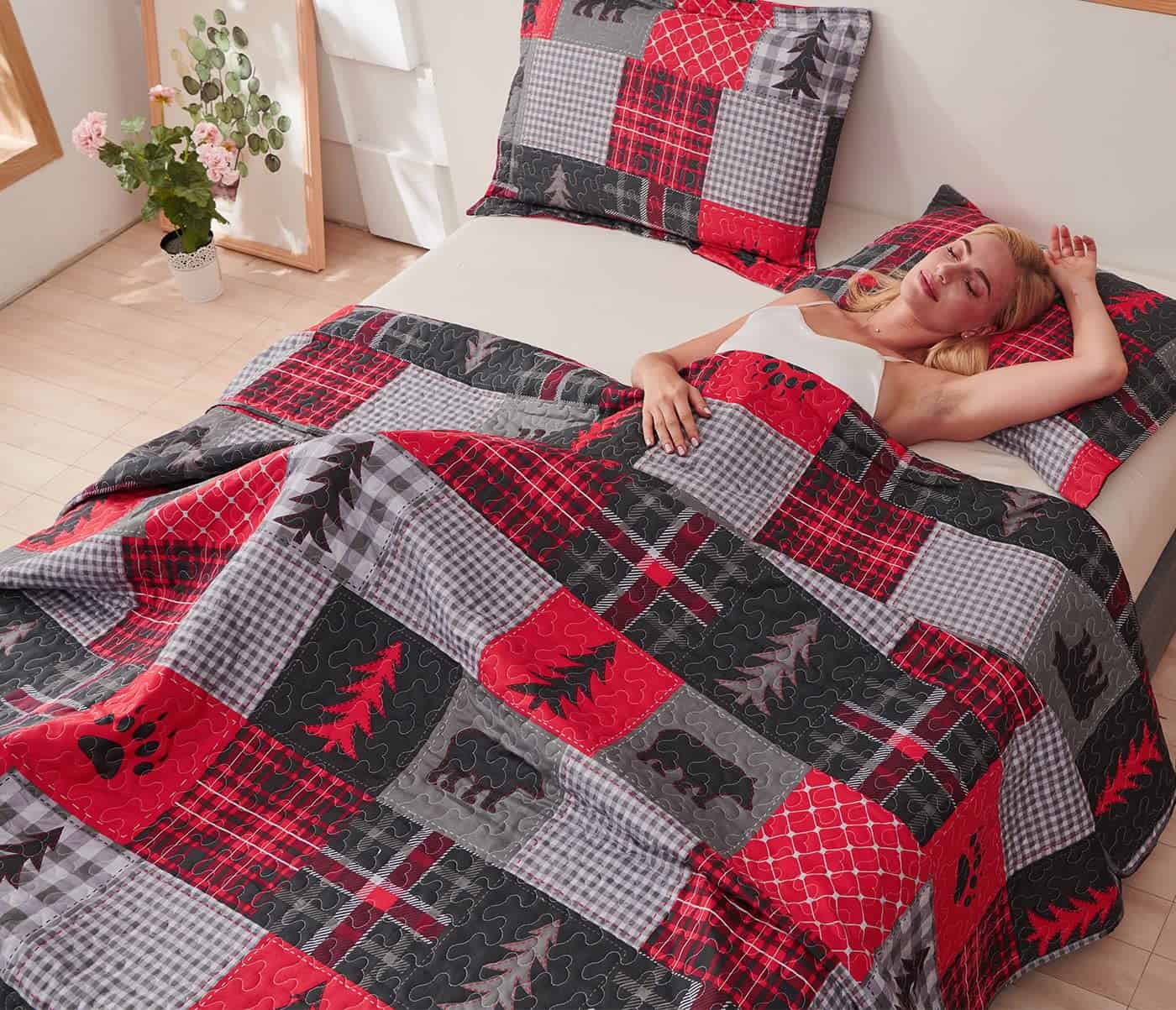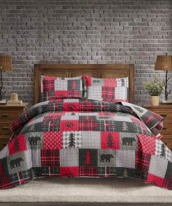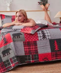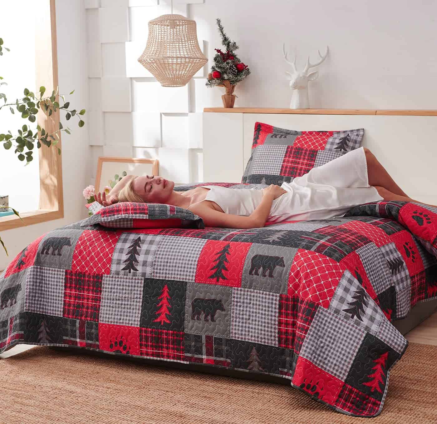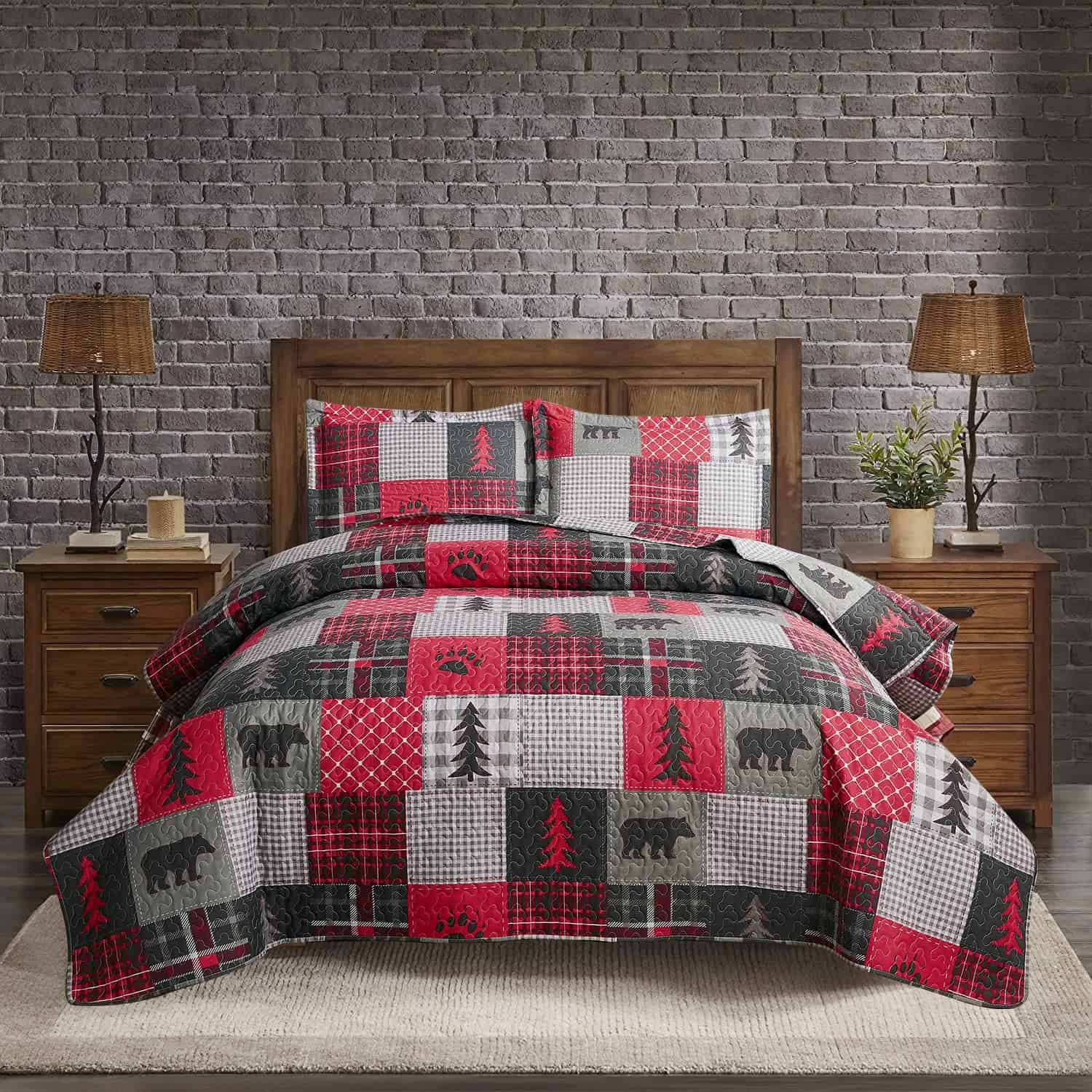 3. DISEÑO REVERSIBLE DE COLCHA CUERPSPREAD OSA PARA TODAS LAS ESTACIONES: Juego de edredones de cabaña cálidos y acogedores para todas las estaciones. Colcha acolchada tamaño queen de cabaña, cama de cabaña de estilo lodge, construcción multi-capas diseño reversible, ambos lados con patchwork a cuadros rojo y negro y diseño de oso negro del bosque, relleno interior con cálidas algodón egipcio, puntadas y costuras apretadas para durabilidad que pueden proteger el relleno interior, resistente a lavados y no se deshilachará, perfecto para familias con mascotas o niños.