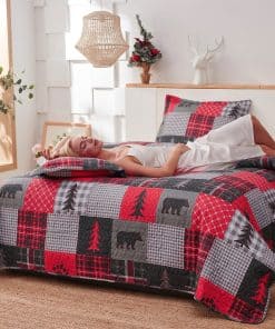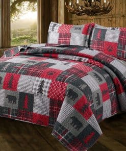 1. JUEGO DE EDREDÓN TAMAÑO QUEEN RÚSTICO DECORACIÓN HOGAREÑA: Colcha acolchada a cuadros para cama Rustica de país, colcha de cama para cabaña Rustica incluye 1 edredón (90″x90″) y 2 fundas de almohada (20″x26″) colección de colchas para cabañas para decorar tu cabaña, dormitorio de casa, cama de día, habitación de invitados, casa de vacaciones. Colcha temática de la cabaña, colcha acolchada en patchwork a cuadros rojo y negro, juego de edredones oso rústico es una elección perfecta para la decoración del hogar, ropa de cama rústica dando a tu dormitorio una estética única e invigorando tu habitación al instante.