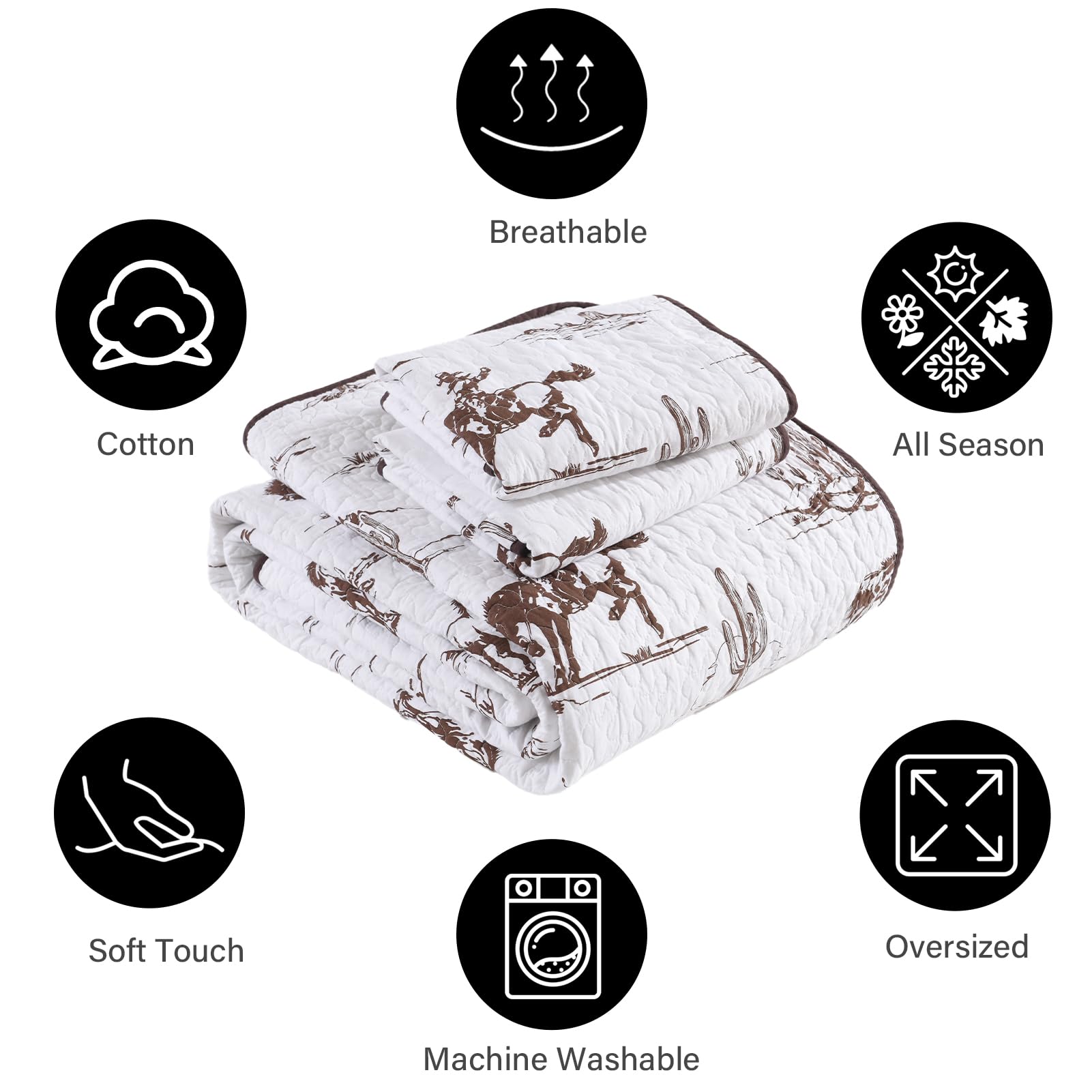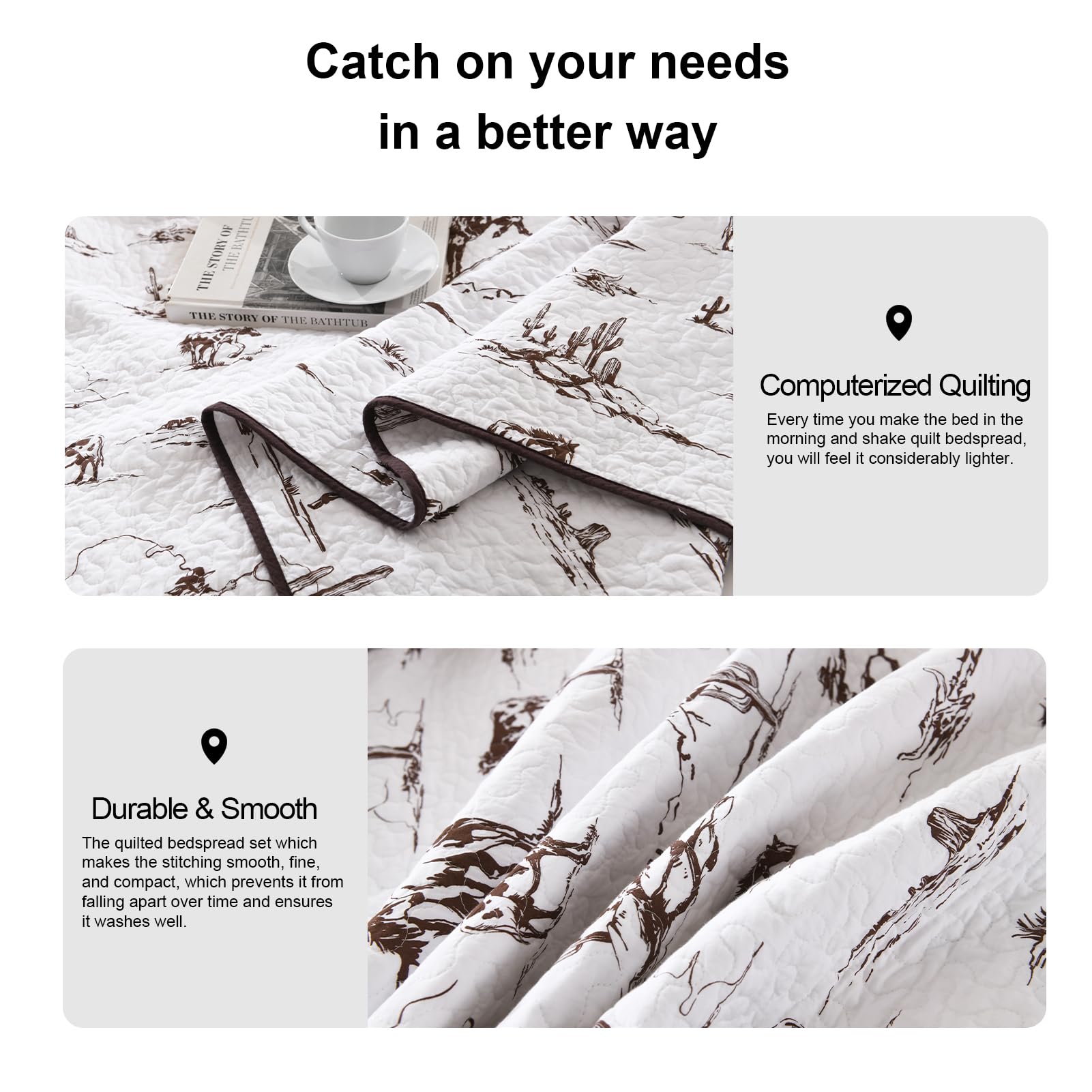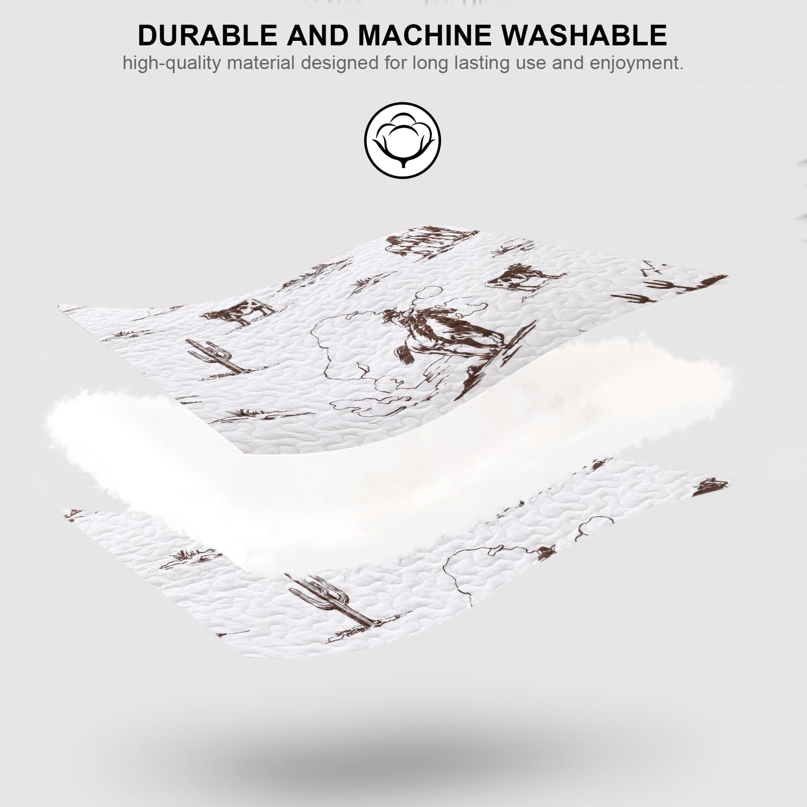 Western Charm: Los patrones sencillos pero vivaces de la vida en el rancho occidental y los vaqueros te hacen sentir como si estuvieras justo en medio de un rancho, experimentando su laboriosidad, abundancia, salvajismo y paz. Tener esta colcha hará que tu habitación sea acogedora y llena de encanto occidental mientras sigue emanando vitalidad. Te ayuda a encontrar la paz interior después de un día ajetreado. Para Varios Cuartos: Una colcha con encanto occidental se combina fácilmente con la decoración de tu habitación. Es adecuada para dormitorios, salas de estar, habitaciones principales, habitaciones de invitados, estudios, dormitorios y caravanas. Es ligera y portátil para habitaciones interiores y camping al aire libre. Agrega un toque del oeste a cada viaje. También es un buen regalo. Para las Cuatro Estaciones: Este juego de colcha se puede utilizar en primavera, verano, otoño e invierno. Si tiendes a sudar más al dormir, este juego de colcha se puede utilizar solo en clima frío, o puedes usar este juego de colcha junto con una manta o edredón en clima frío. Versátil: Puedes usar este juego de colcha como parte de tu decoración del hogar, y también puedes usarlo como un edredón ligero, cubrecama acolchado o manta para la cama. O simplemente úsalo como una capa de tu juego de ropa de cama para crear ambiente y llevar vitalidad al espacio. Juego de Colcha Queen de 3 Piezas Incluye: 1 Colcha (90 x 98 pulgadas) + 2 Fundas de Almohada (20 x 28 pulgadas). Duradero y Ligero: Material duradero, costuras ordenadas y ajustadas garantizan un uso a largo plazo. Diseño ligero que facilita el transporte, cuidado y lavado, si tienes mascotas, esta colcha también es una buena elección. Instrucciones de Cuidado: Lavar a máquina por separado en agua fría, secar a fuego lento, no usar lejía. La colcha mantendrá el calor y su forma original después de lavarla. Si tienes mascotas, la colcha lavable es una buena elección.