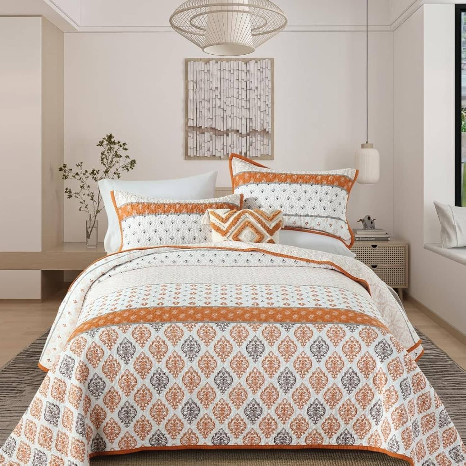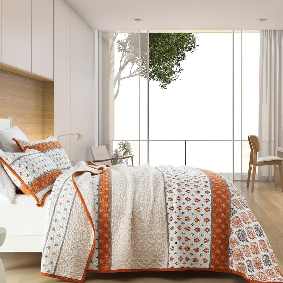 Colcha de algodón para cama tamaño Queen Qiqiong, juego de ropa de cama con estampado floral para cama Queen, colcha acolchada para cama Queen ligera y reversible, juego de edredón para cama Queen de color naranja blanco de 3 piezas. Esta colcha tamaño queen tiene un diseño de estampado floral, la artesanía de doble costura hace que este edredón sea duradero, encaja perfectamente en tu decoración rústica de casa de campo o granja, el juego de ropa de cama queen es especial para tu habitación de cabaña y habitación de invitados, dormitorio principal. Esta colcha de algodón para cama queen es ligera pero te mantiene abrigado en todas las estaciones, especialmente para los durmientes calurosos, diseño reversible de la colcha para cambiar tu estado de ánimo cada vez que se vean el frente y la parte trasera, puede ser considerado un buen regalo para parejas nuevas, padres o amigos. Esta colcha queen de estampado floral es fácil de cuidar; Lavar a máquina por separado en agua fría; Secar a baja temperatura; No usar blanqueador en este juego de colcha acolchada; El diseño de borlas curvadas se ve más acogedor; Ambos son juegos de colchas queen y edredones queen en nuestra tienda, por favor elige tus colchas favoritas y comparte con nosotros tu experiencia de compra