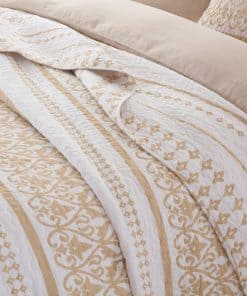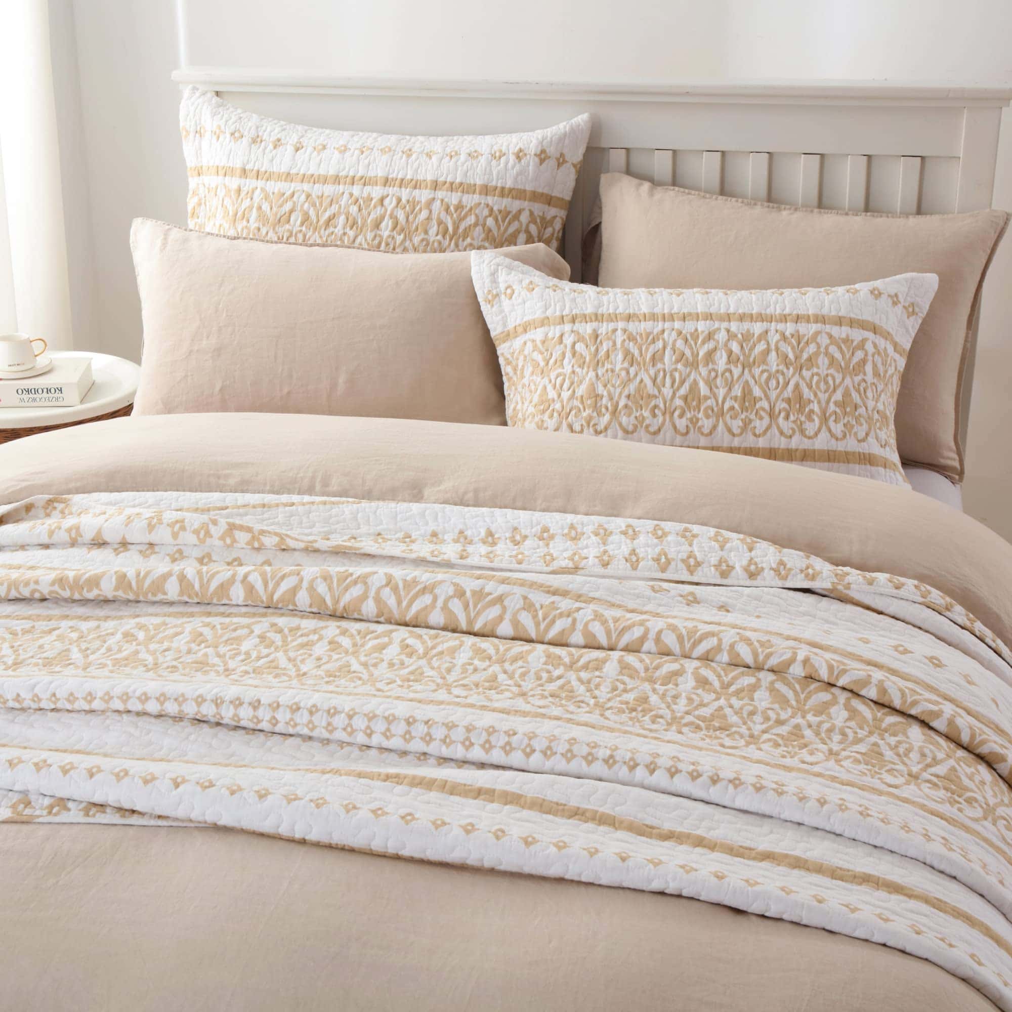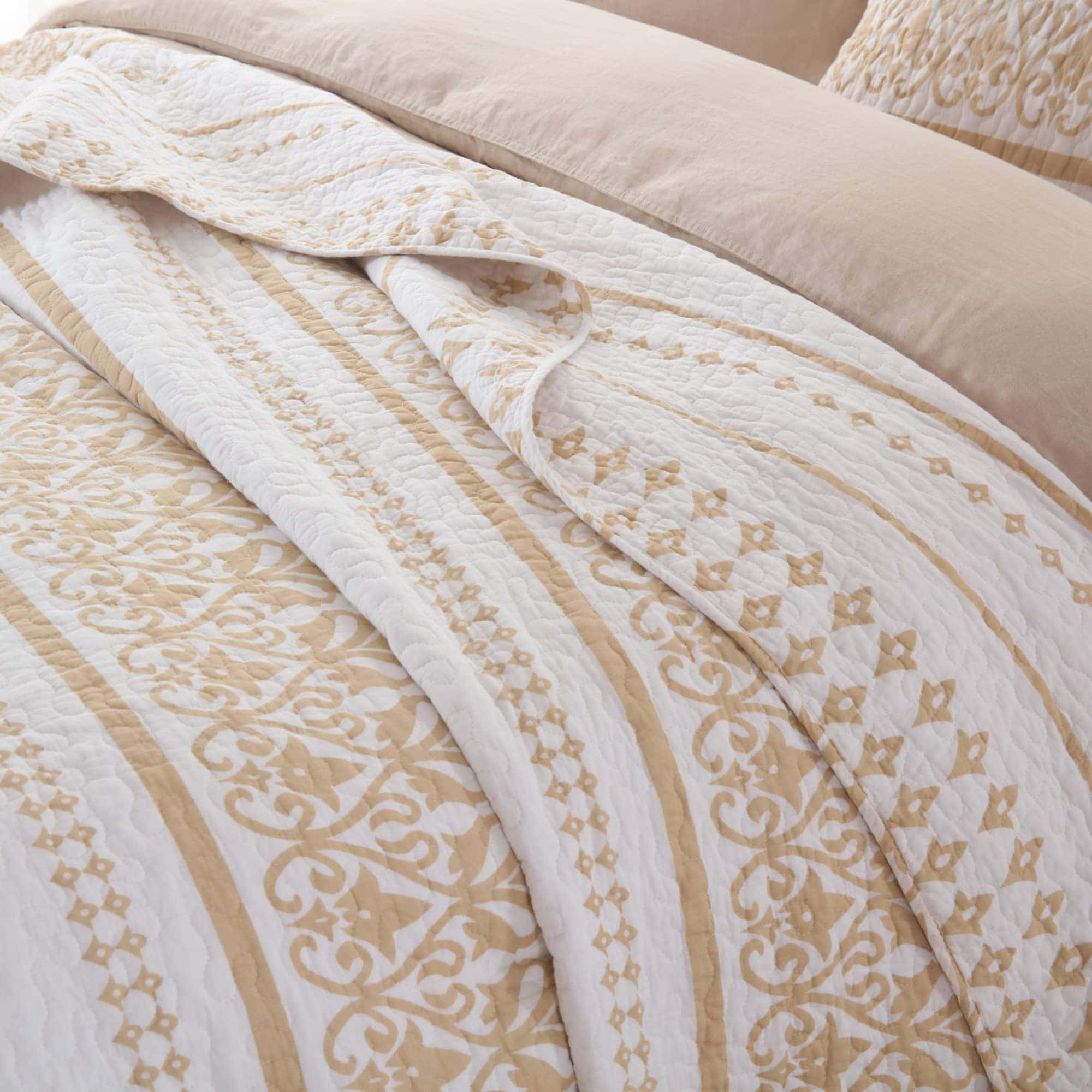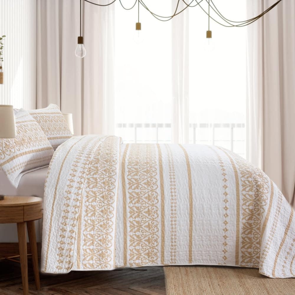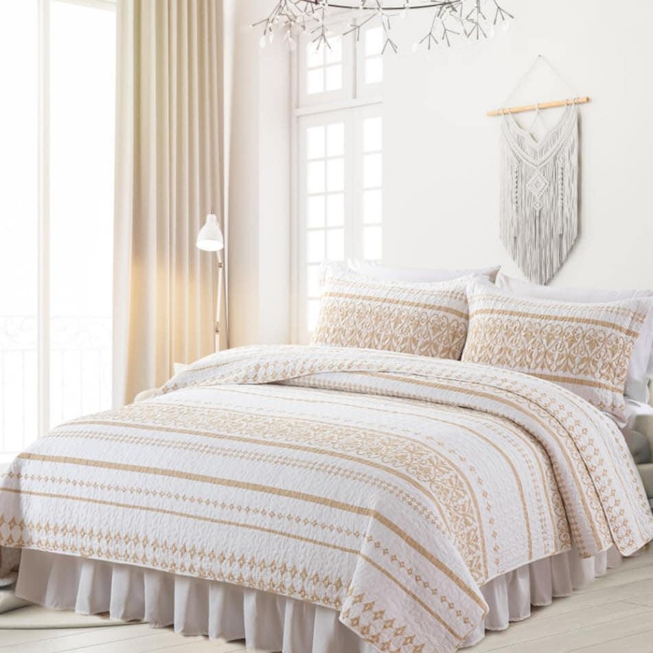 2. Juego de Colcha Boho Queen Este clásico juego de colcha rayada boho en tamaño queen en blanco y beige está diseñado con patrones a rayas que hacen que su habitación sea brillante y acogedora y adopta una excelente artesanía de doble costura, se adapta perfectamente a su decoración de casa de campo o granja.