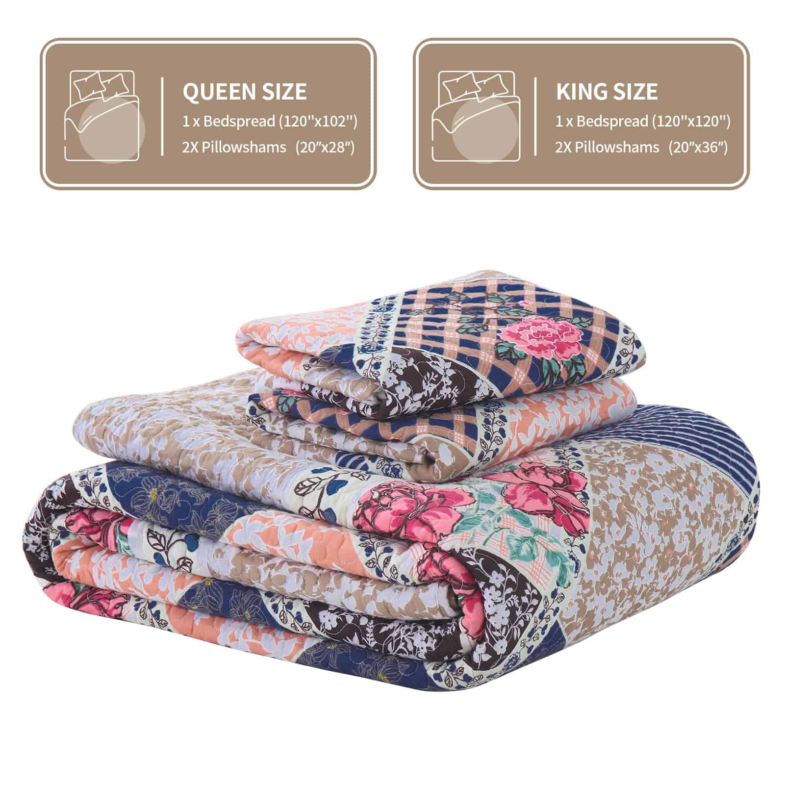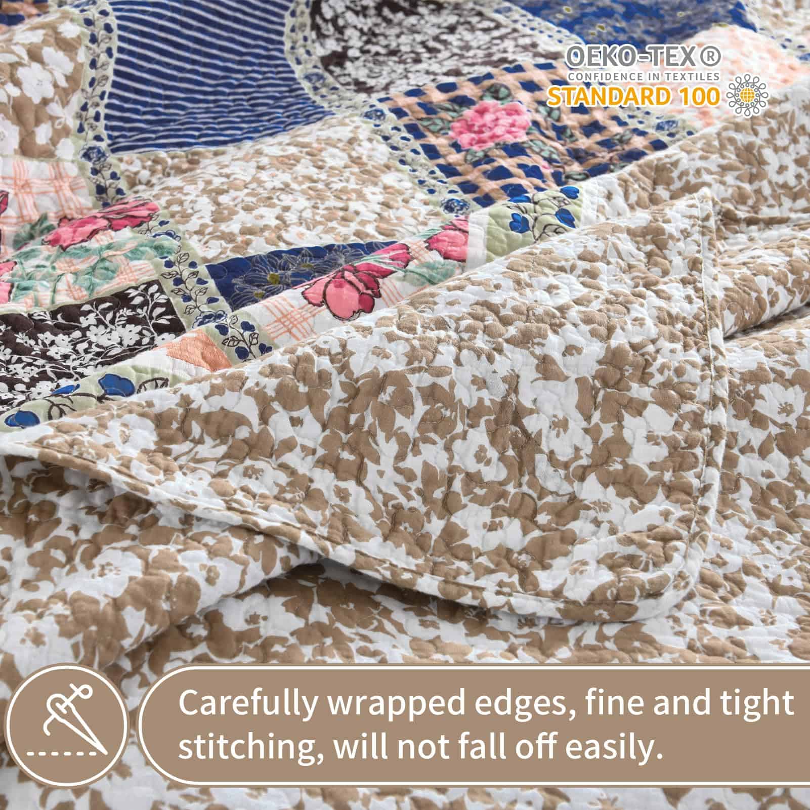 5. Cuidado Fácil – Este juego de colcha viene con una colcha king size (128″ x 120″) y dos fundas de almohada a juego (20″ x 36″). El edredón delgado es lavable a máquina, lo que te ahorra tiempo y energía. Seca a baja temperatura para asegurar la longevidad del tejido de algodón suave y colorido.