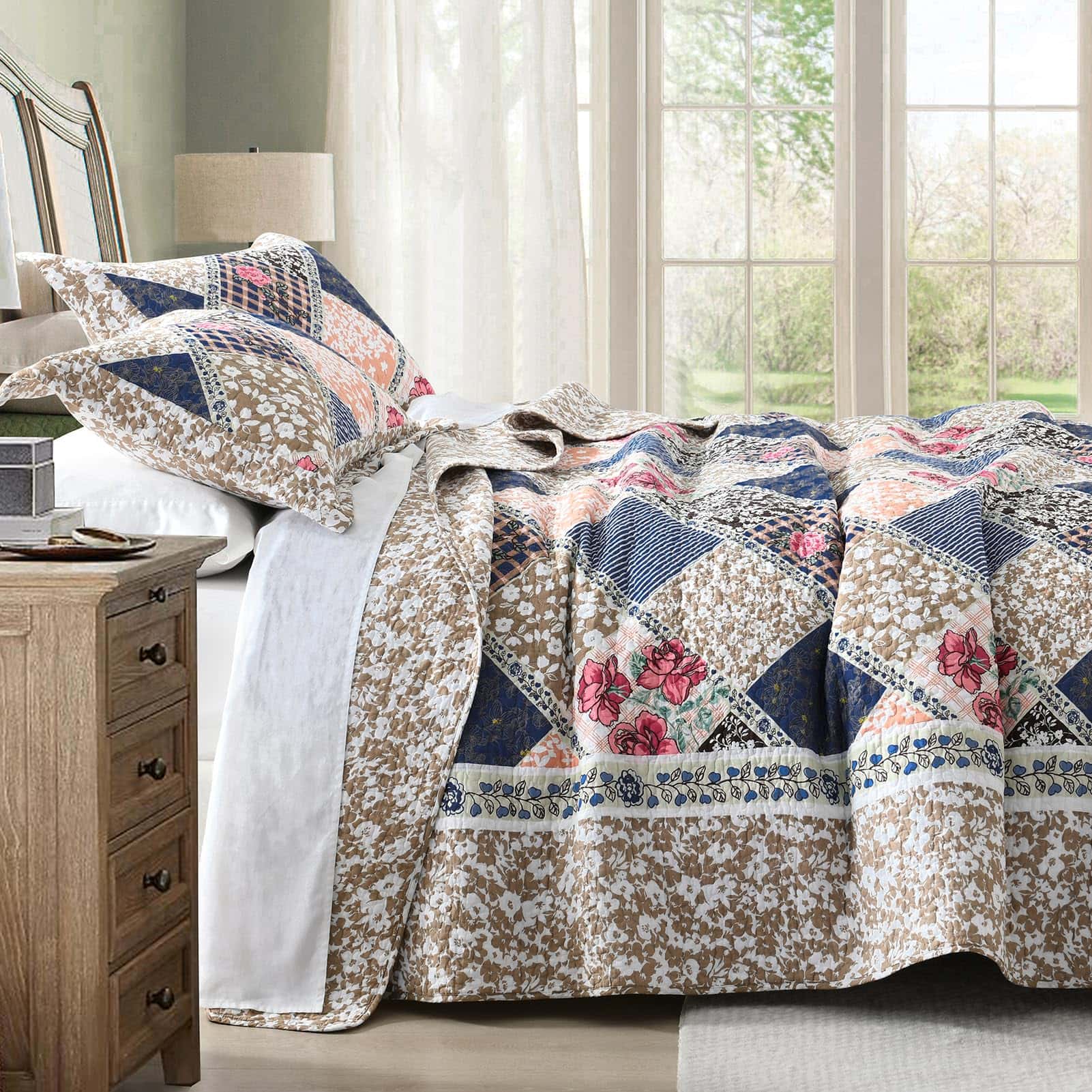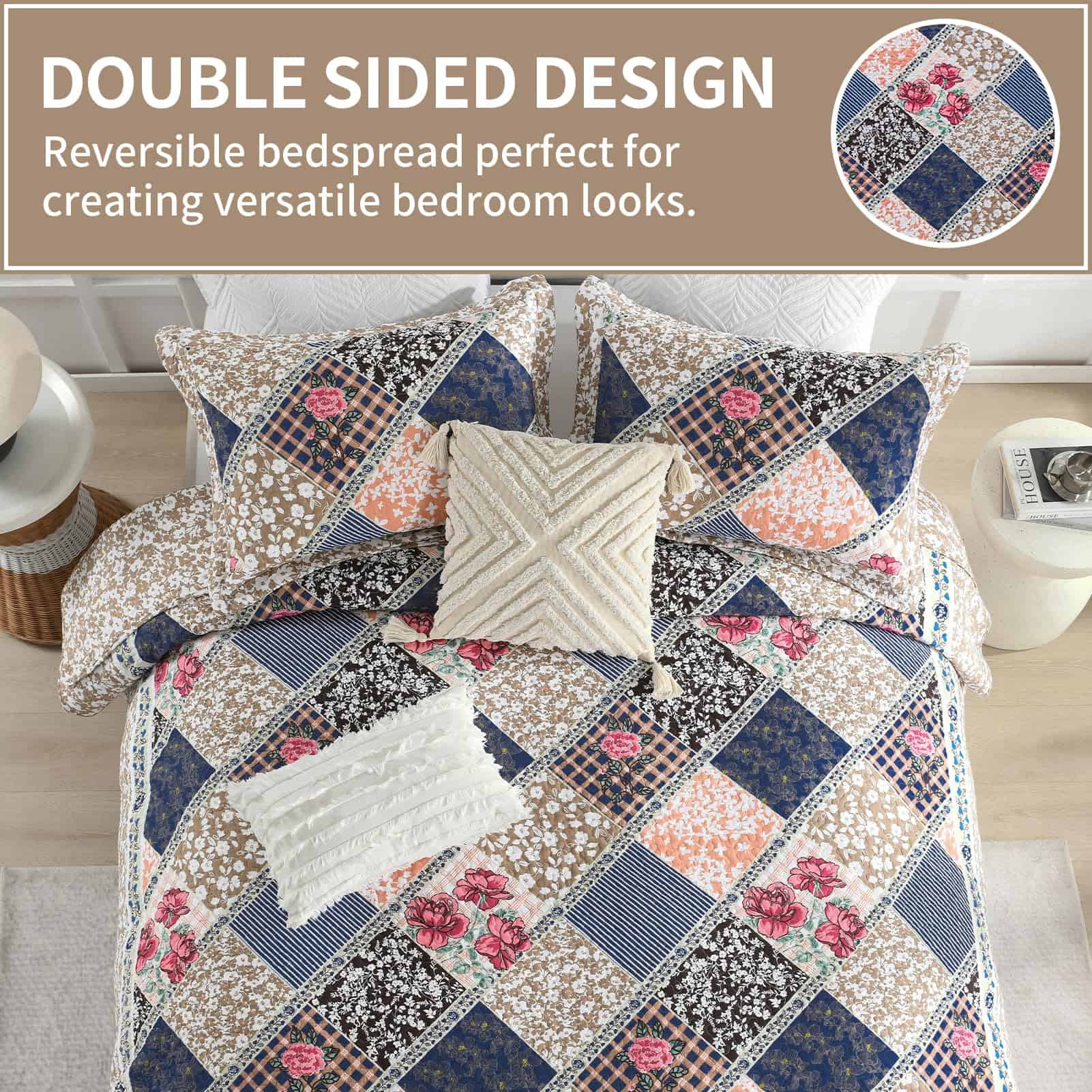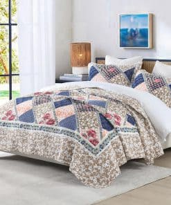 3. Diseño de Patchwork Floral – Diseñado con patrones florales variados y coordinados en color, esta colcha reversible crea un aspecto vintage, fresco y rústico para tu dormitorio. Adorna el rincón favorito de tu casa con esta impresionante colcha de flores.