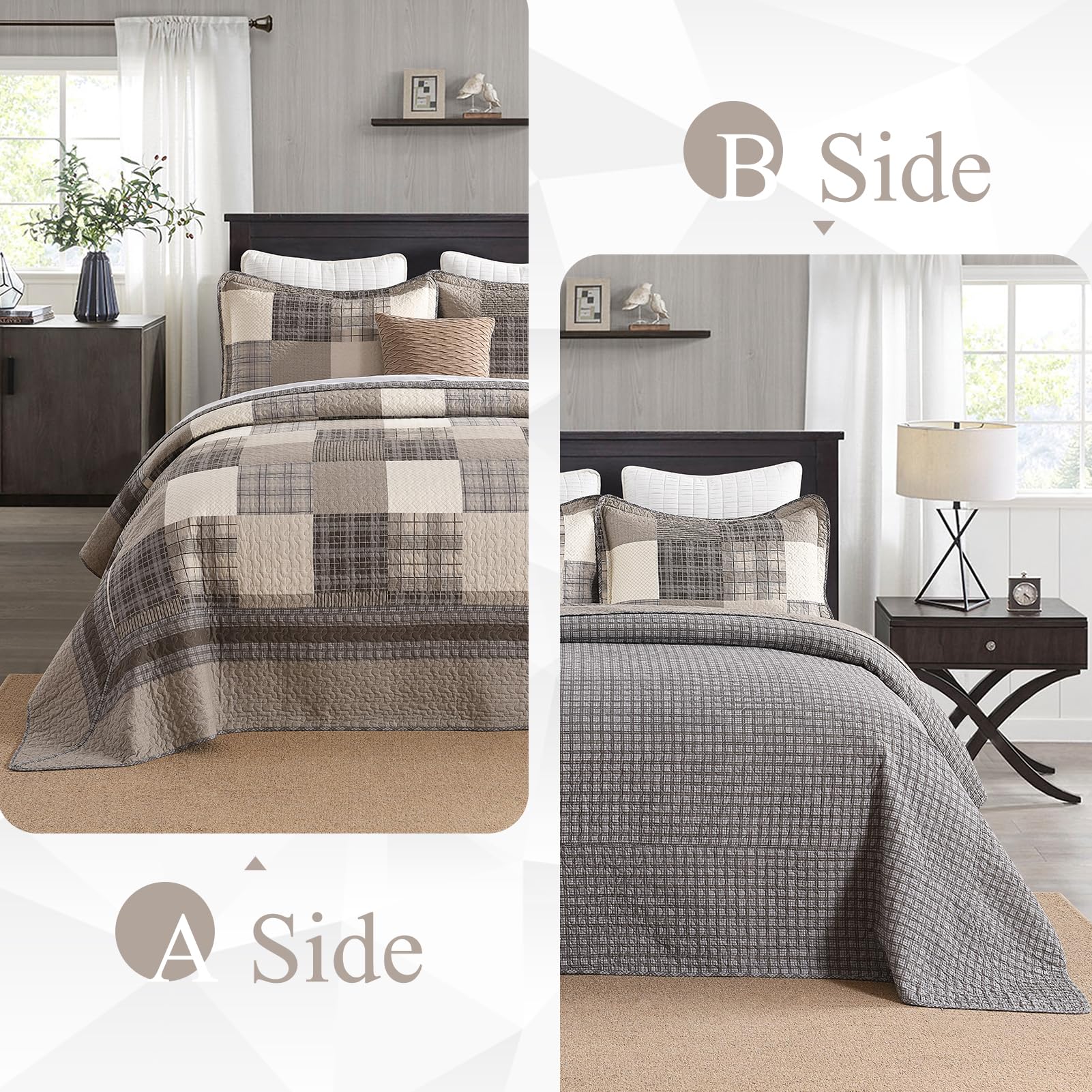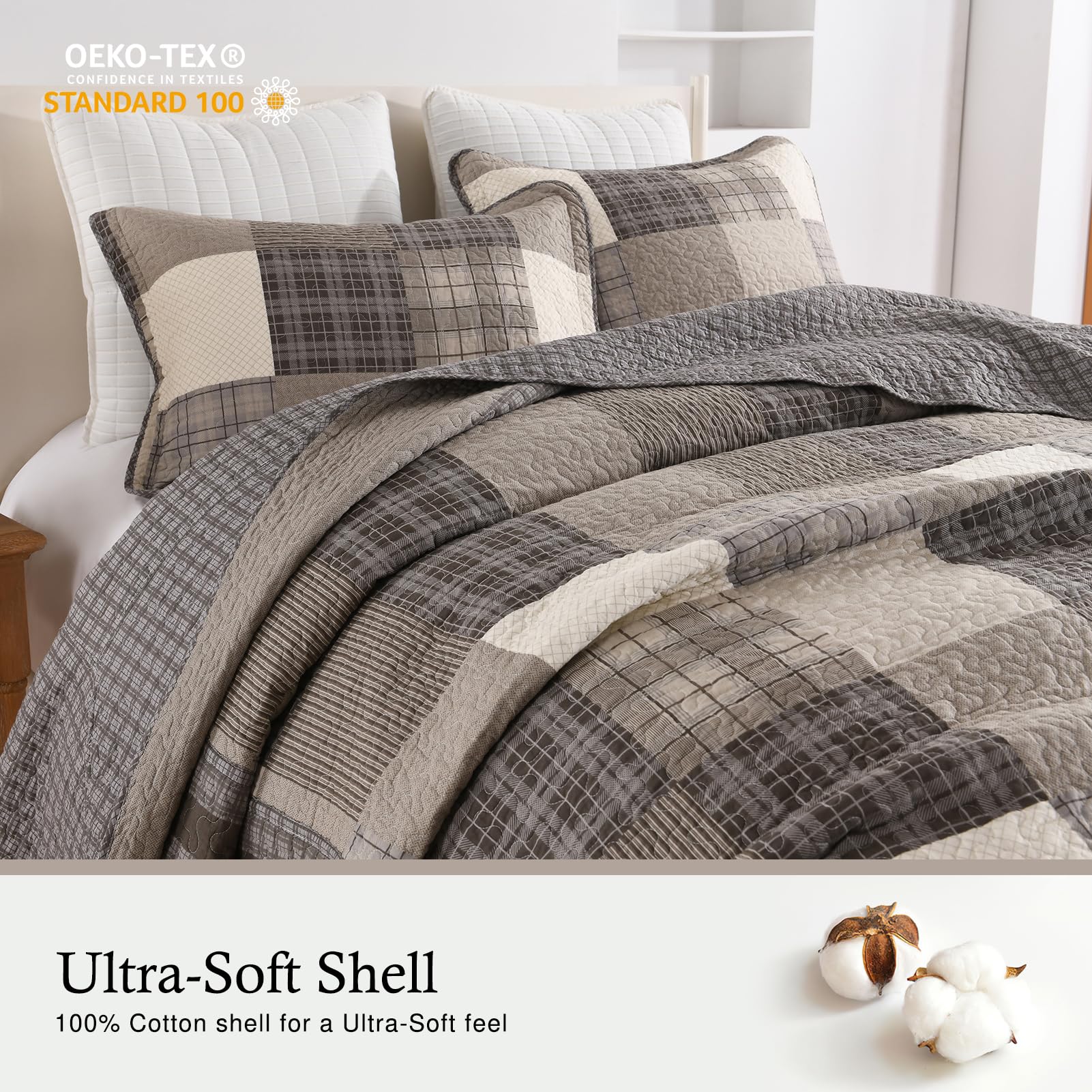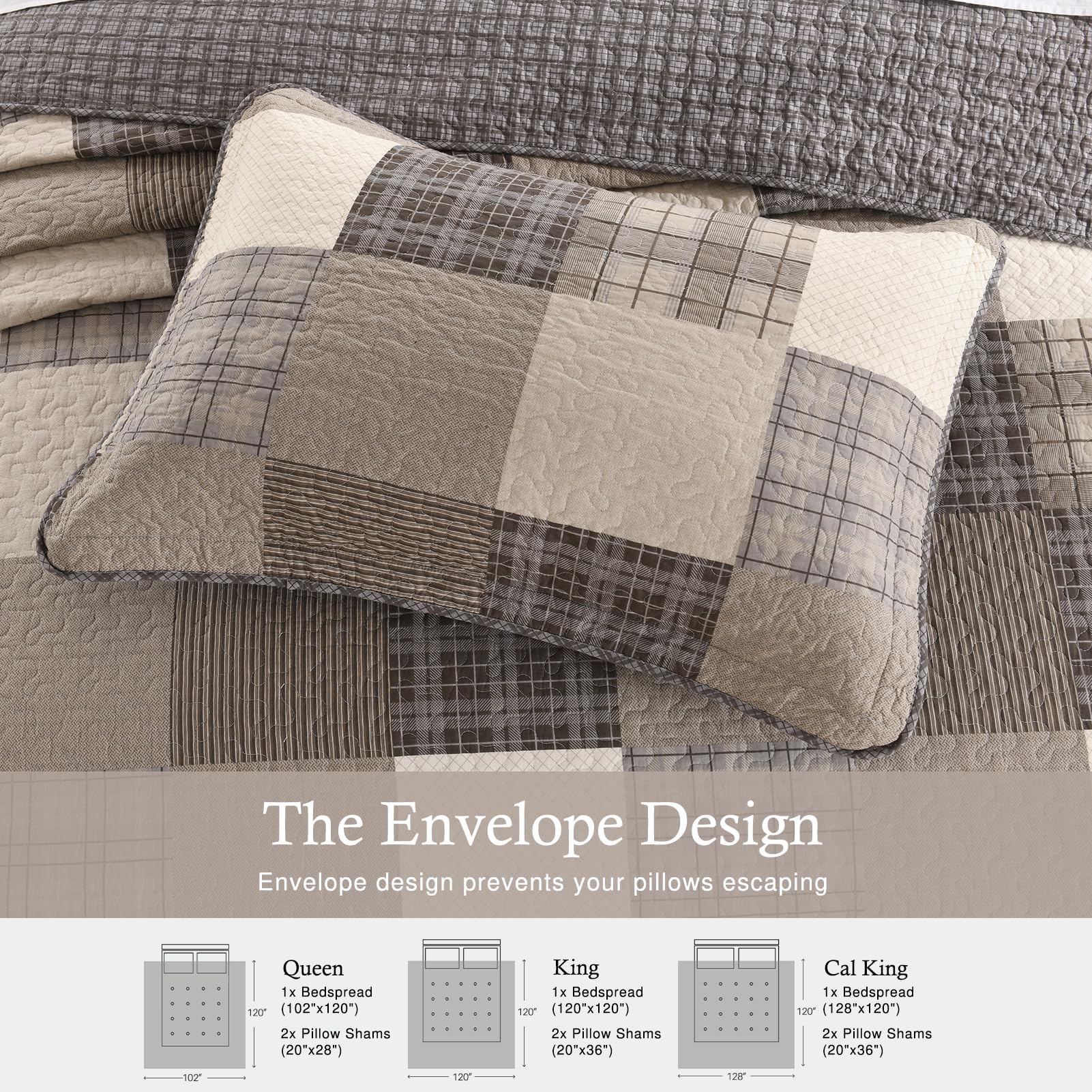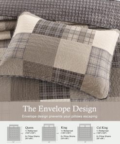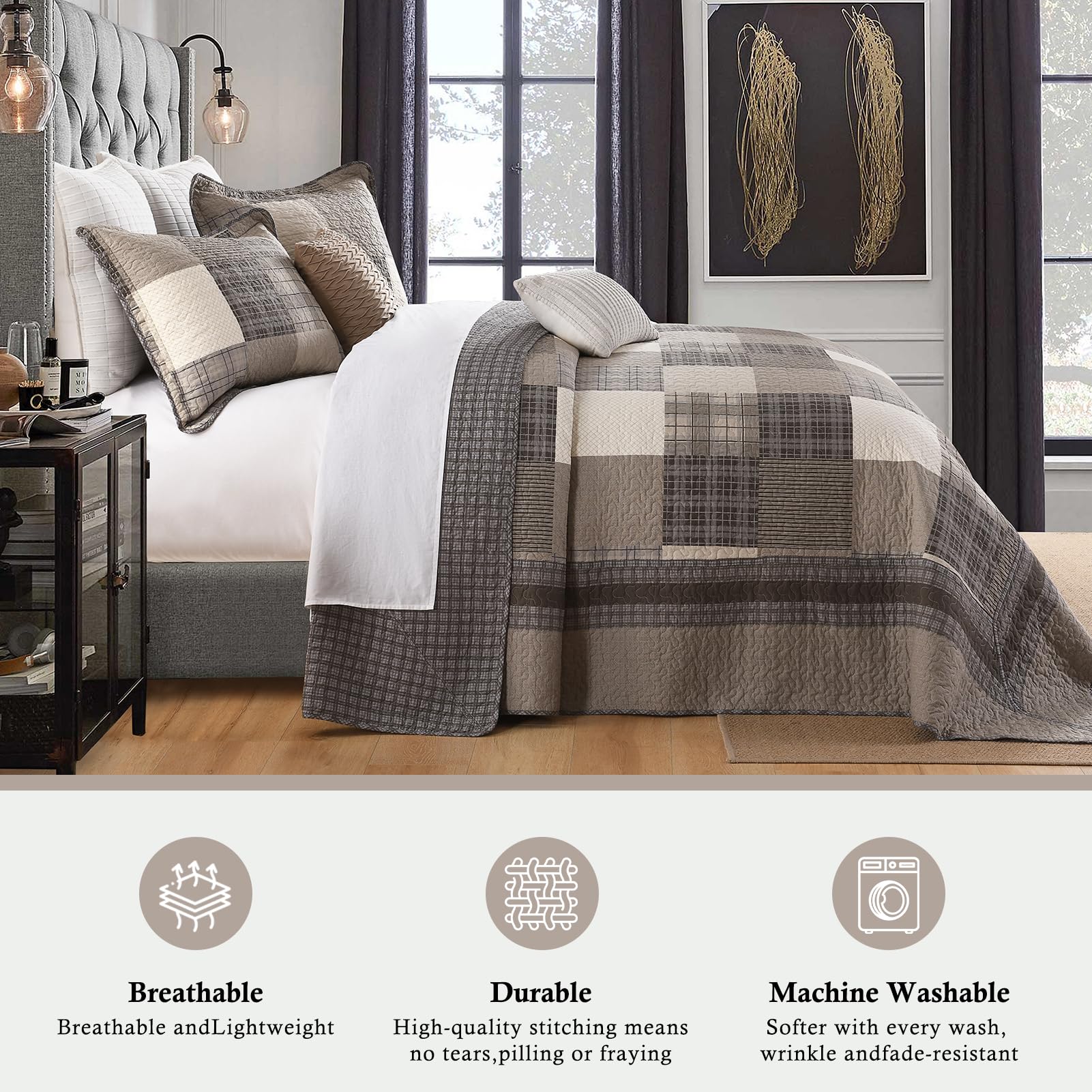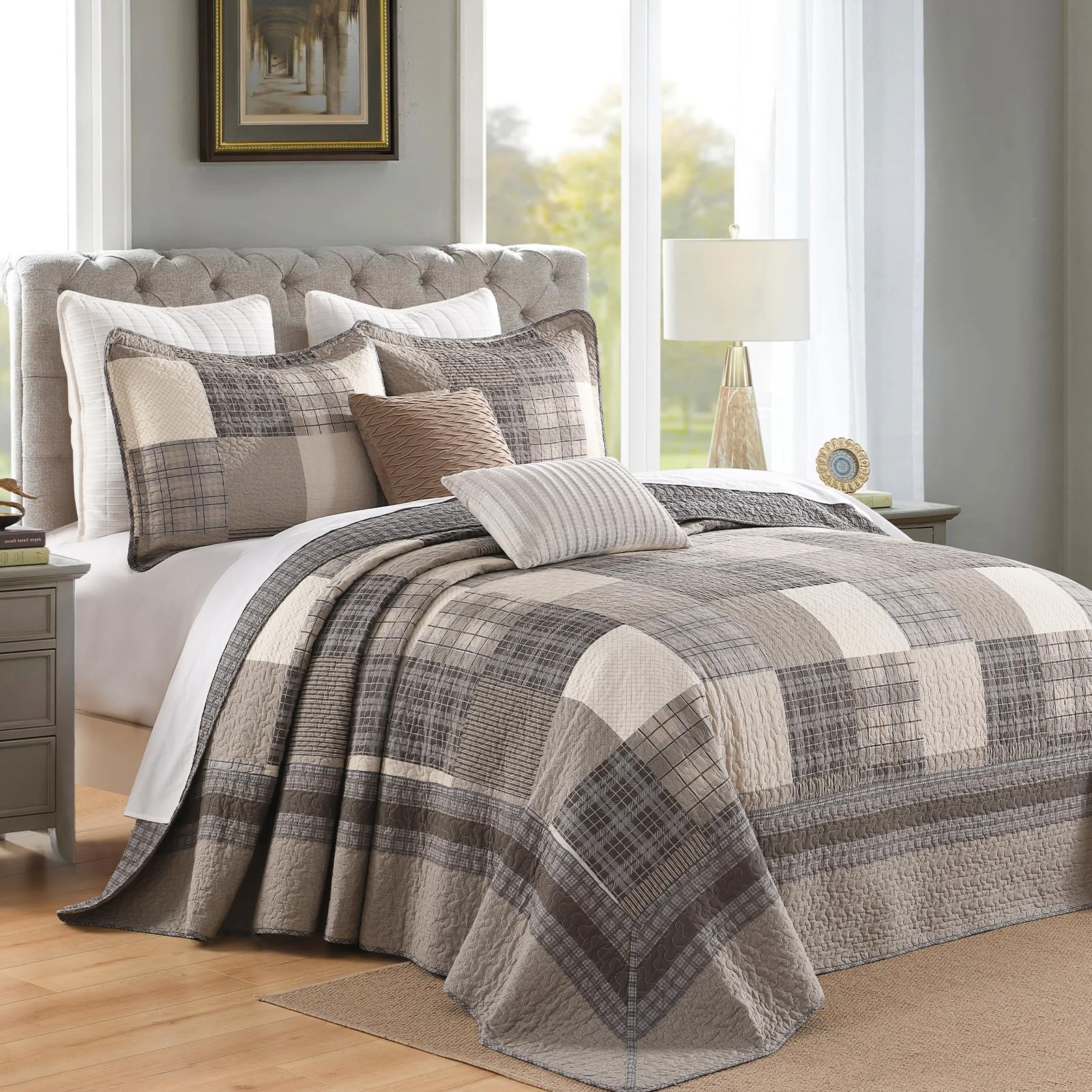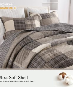 Esta colcha extragrande para cama California King de QuiltMuse mide 128″x120″ y viene con 2 fundas de almohada 20″x36″. Es ideal para camas king más grandes y altas, colchones más gruesos y bases ajustables. Ofrece cobertura completa y protección para sus sábanas y edredones contra el polvo y las manchas. La transpirabilidad superior y las propiedades amigables con la piel de esta colcha mantienen seco y cómodo, especialmente para las personas que duermen calientes, permitiéndoles decir adiós a la sensación de opresión y el malestar y abrazar una mejor calidad de sueño. La colcha combina tonos terrosos para llevar la elegancia clásica de la granja campestre a su dormitorio. La disposición armoniosa de colores crea un ambiente sosegado y acogedor, perfecto para un retiro sereno. Su patrón de cuadros atemporal y su textura suave ofrecen confort y estilo, convirtiéndola en una adición ideal para cualquier hogar de inspiración rústica. Tejida con algodón transpirable, esta colcha para cama es perfecta para el clima cálido, pero también se puede superponer en los meses más fríos. Es ligero, suave y no te carga, permitiéndote dormir más cómodamente. Esta colcha acolchada ha sido prelavada, lo que resulta en una mejor sensación y reduce efectivamente la posibilidad de retracción posterior. Es lavable a máquina con agua fría y se puede secar en secadora a baja temperatura. Por favor, no use lejía.