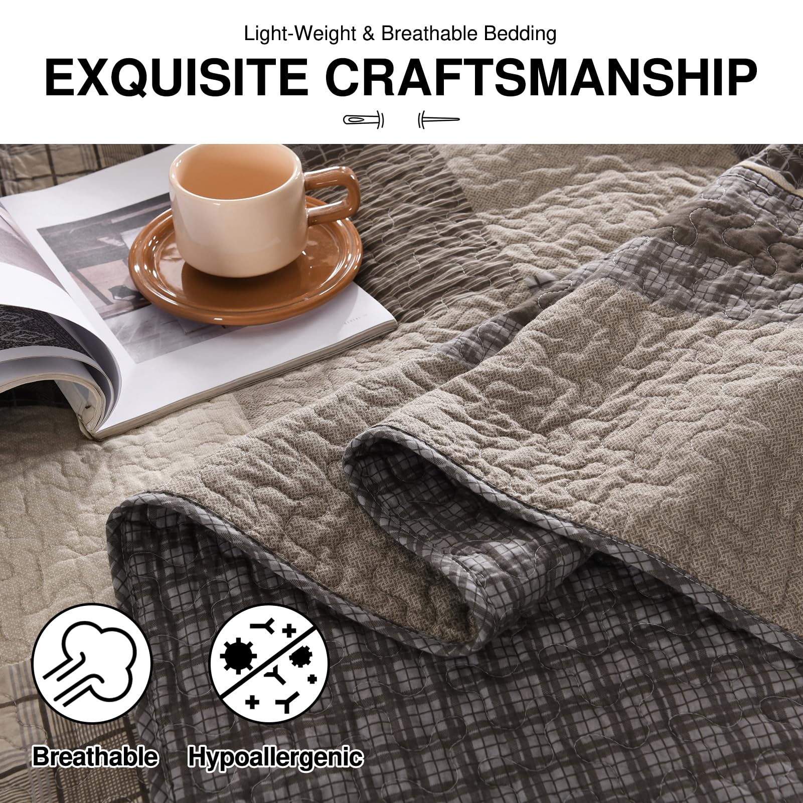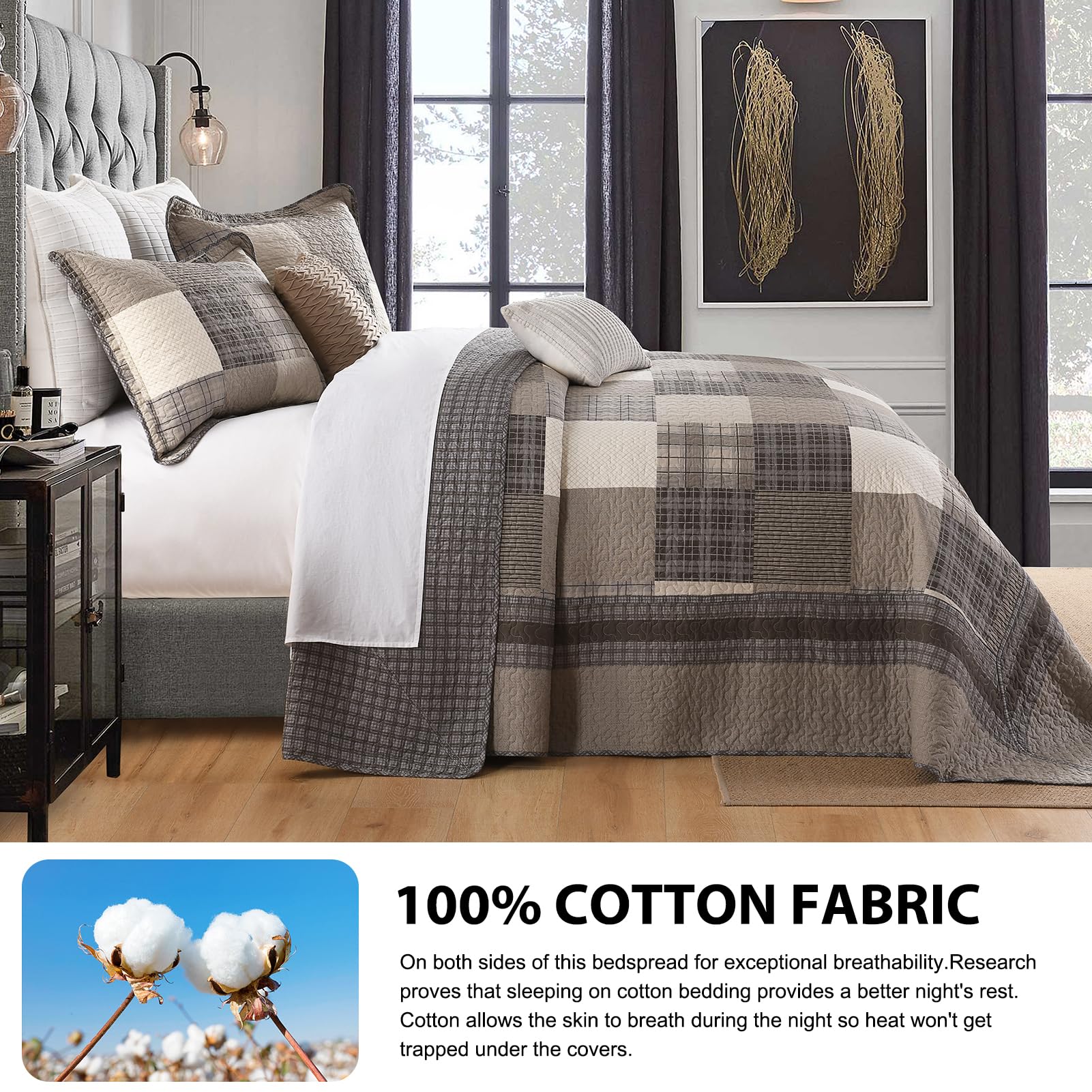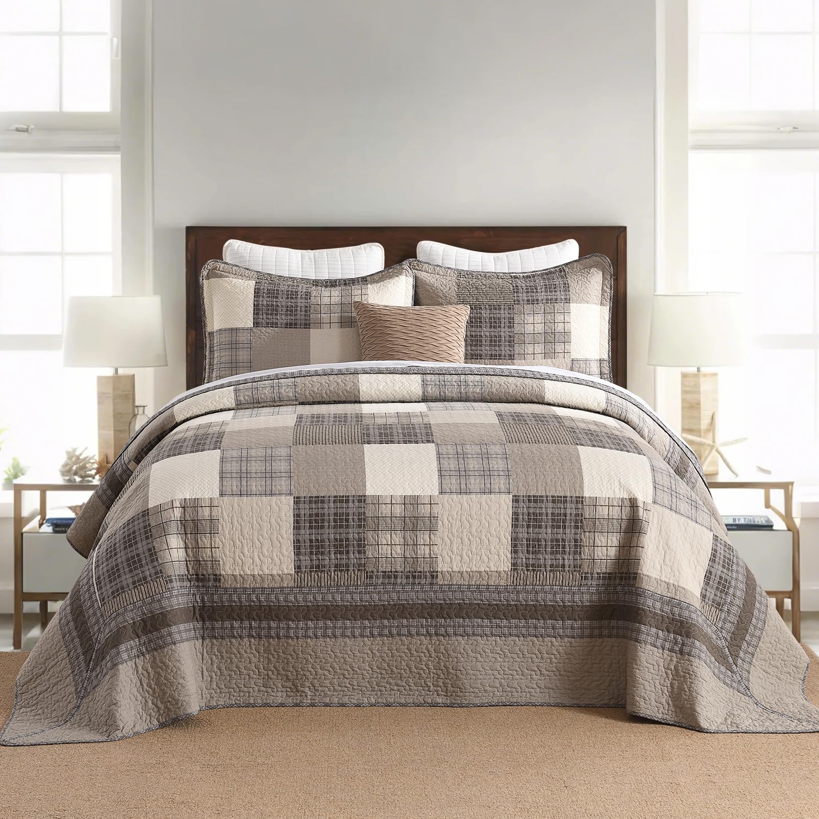 3. Diseño Elegante: Esta colcha king combina la profundidad de tonos gris-marrón con la calidez de marrón y beige, mostrando la esencia acogedora del estilo de Granja. El patrón de cuadros añade capas visuales, creando una atmósfera clásica pero rústica, perfecta para hogares tanto country como modernos.