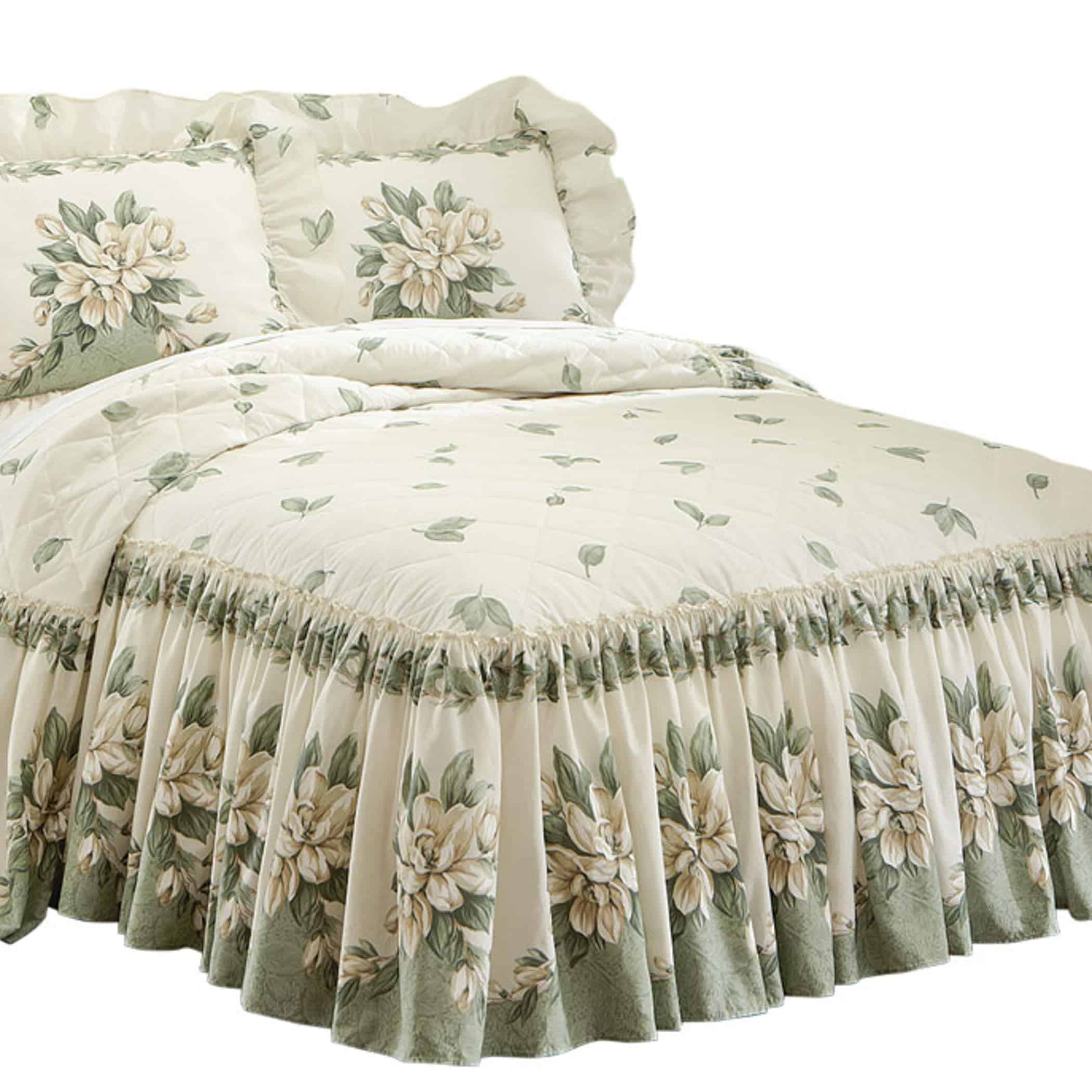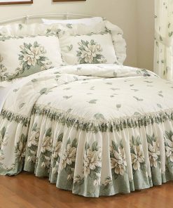 Colcha de cama con parte superior acolchada que presenta un hermoso patrón de magnolias con delicados detalles y un amplio volante que proporciona el toque final perfecto para tu dormitorio. Este conjunto incluye una colcha de cama tamaño Queen en un atractivo color verde. Las fundas de almohada se venden por separado. Fabricado con una mezcla de poliéster y algodón para una apariencia elegante y fácil cuidado. Disfruta de la belleza y la comodidad de esta colcha de cama ligera con un diseño floral encantador que añadirá un toque de elegancia a tu habitación. Lavable a máquina para facilitar el cuidado. No incluye los accesorios mostrados en la imagen.