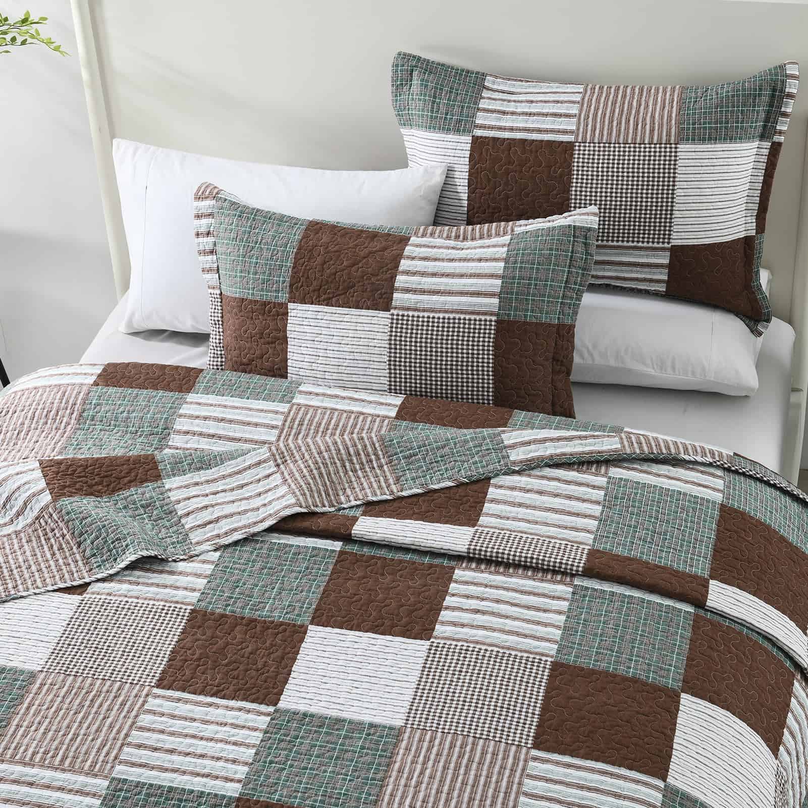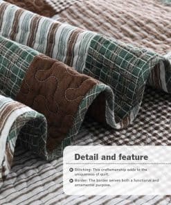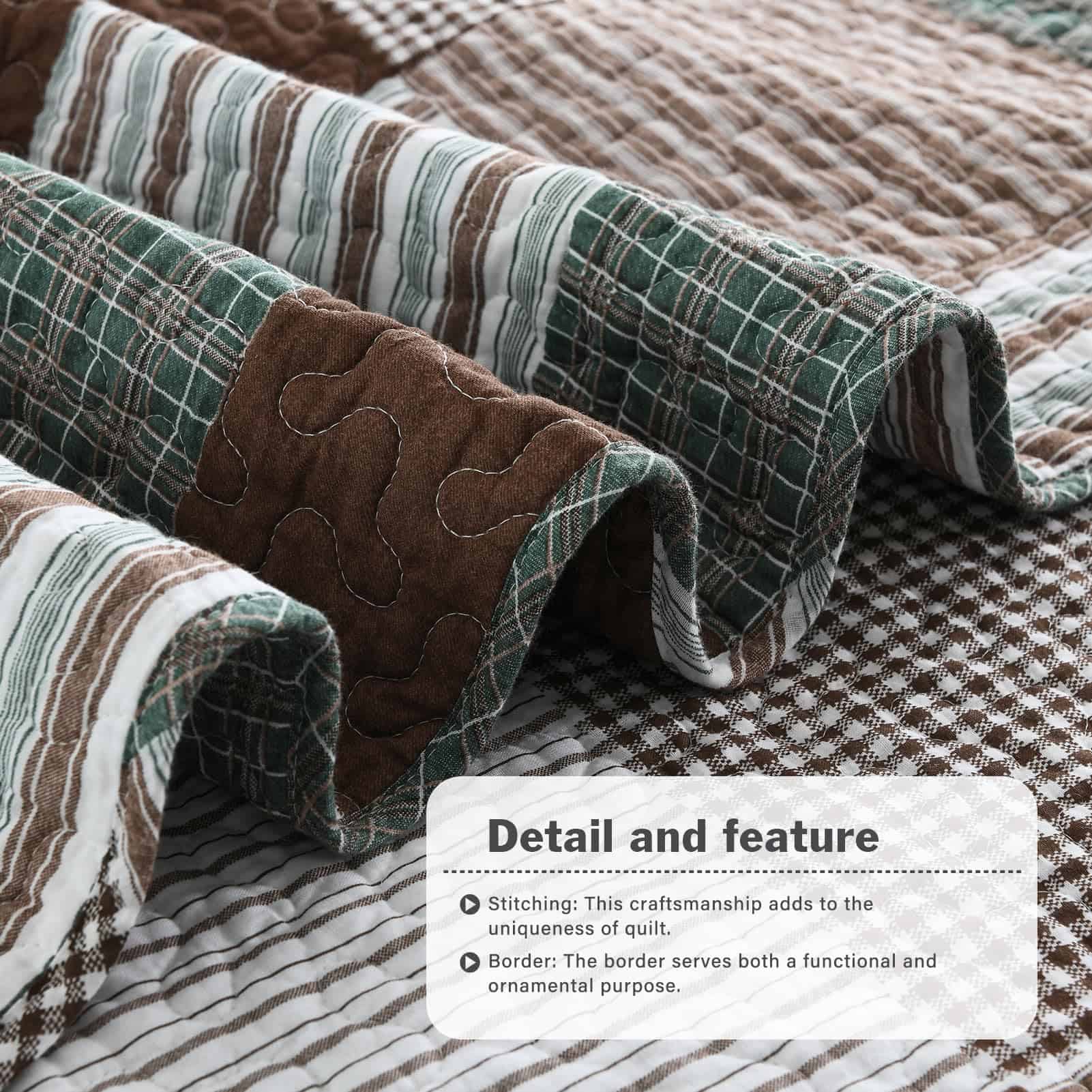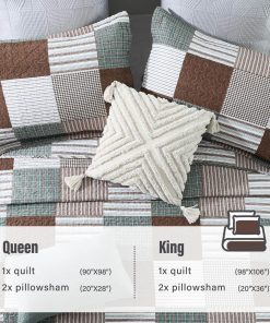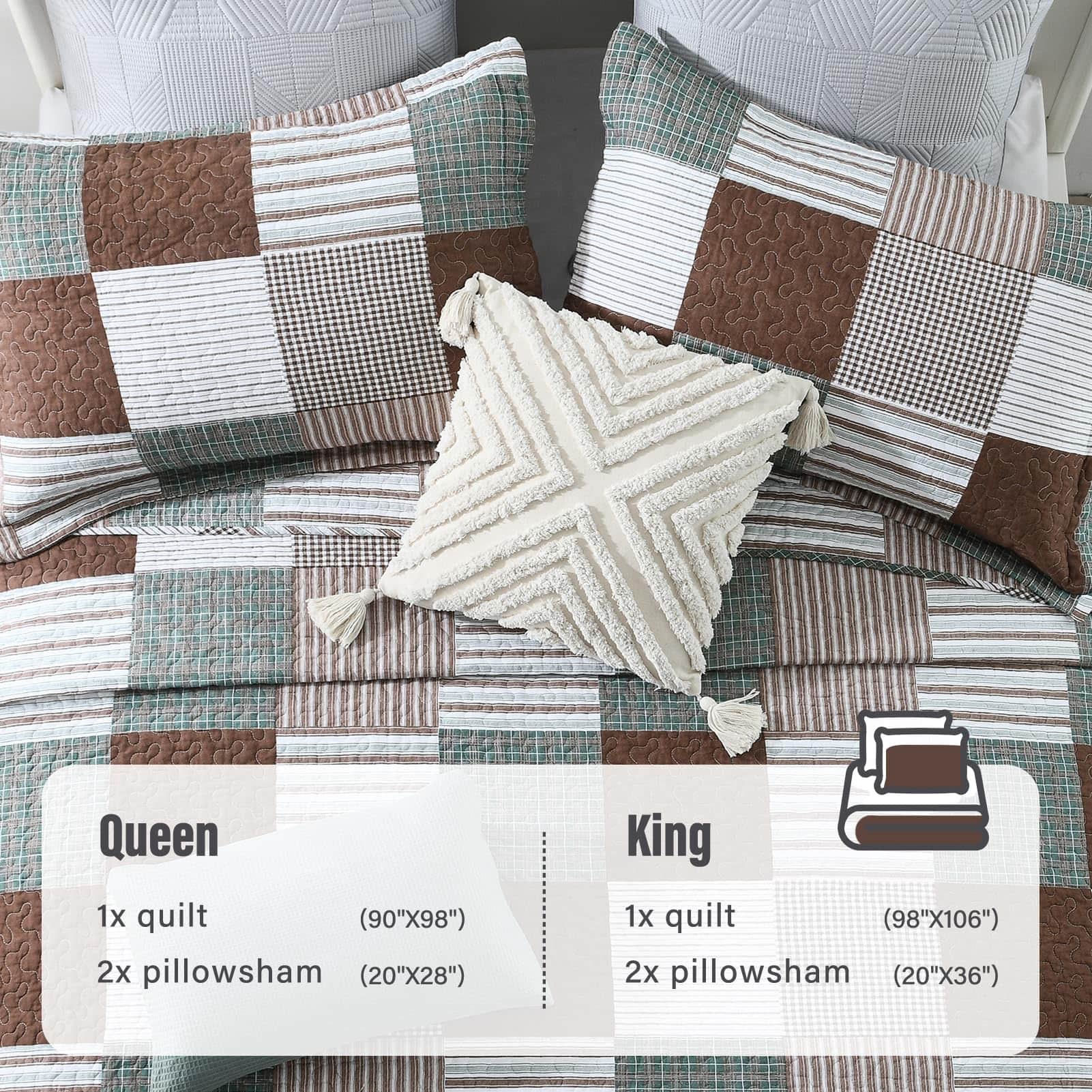 La colcha de cuadros queen size Y-PLWOMEN está hecha de 100% algodón, lo que la hace saludable, transpirable, cómoda y sin olor. Con un patrón de cuadros en tonos marrón y verde, esta colcha queen se ve elegante y puede decorar tu habitación de forma muy bien. La excelente artesanía de doble pespunte garantiza la durabilidad de la colcha y le da un toque de calidad. Este juego de colchas queen size incluye una colcha de 90 * 98 pulgadas y 2 fundas de almohada de 20 * 28 pulgadas. La colcha de algodón de tres capas asegura una excelente retención de calor para que puedas usarla en todas las estaciones. Además, su diseño reversible te permite disfrutar de diferentes experiencias de sueño. Fácil de cuidar, simplemente sigue las instrucciones de lavado a máquina en agua fría y secado a temperatura baja para mantener su aspecto y calidad por mucho tiempo.