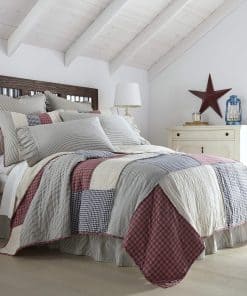Descubre la elegante colcha Hatteras Patch de VHC Brands, con un diseño en patchwork que combina lino y algodón en un estilo único. Esta colcha de alta calidad en tamaño California King (130×115 pulgadas) ha sido prelavada para mayor suavidad y durabilidad. El diseño en tonos rojo americano, blanco algodón y azul denim le dará a tu dormitorio un toque de estilo y confort incomparable. ¡Renueva tu ropa de cama con esta hermosa colcha!