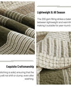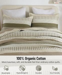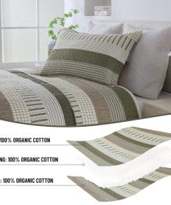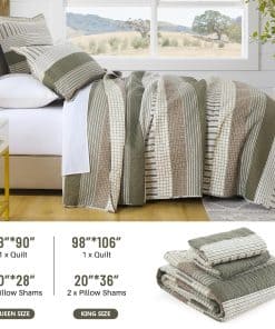 Colcha de algodón 100% orgánico de alta calidad. El tejido y el relleno están hechos de algodón percal orgánico 100%: absorbente de la humedad, transpirable, saludable e hipoalergénico. El recuento de hilos de 300, que es el doble de un edredón de algodón normal, hace que el tacto sea más lujoso y suave, así como más resistente y duradero. Apoyamos con orgullo prácticas de fabricación sostenibles con la certificación OEKO-TEX Standard 100. Cada puntada es un testimonio de nuestra dedicación a la calidad y tu bienestar. Esta colcha de tamaño king tiene un relleno de algodón 100% de 200 gsm de peso moderado, lo que lo hace cálido pero ligero. Es perfecto para aquellos que tienden a sudar durante el sueño y puede ser usado por sí solo en primavera, verano y otoño. En invierno, se puede combinar con un edredón o manta para agregar peso y también decorar su cama. El diseño único de granja moderna en rayas clásicas de color beige, gris, verde gris y marrón puede complementar perfectamente diferentes colores y estilos de papel tapiz y cortinas. Con un patrón consistente en ambos lados, puedes voltear la colcha de tamaño king con frecuencia para reducir el desgaste sin preocuparte por patrones o colores desparejados. El color neutro es universalmente atractivo y lo convierte en un regalo perfecto para personas de todas las edades y géneros. Conjunto de 3 piezas de colcha de tamaño king incluye 1 colcha (98 x 106 pulgadas) + 2 fundas de almohada (20 x 36 pulgadas). La colcha de algodón CozyQQ después de un fino proceso de costura, garantiza que cada línea sea firme y detallada, no se deshilache fácilmente, evitando cualquier desplazamiento o agrupamiento del material de relleno incluso después del lavado. Fácil de cuidar, lavable a máquina. Ciclo suave en agua fría, secar en secadora a baja temperatura. No requiere planchado. No usar lejía. La colcha de algodón king se volverá más suave con cada lavado. Si tienes mascotas, la colcha lavable y duradera es una buena elección.