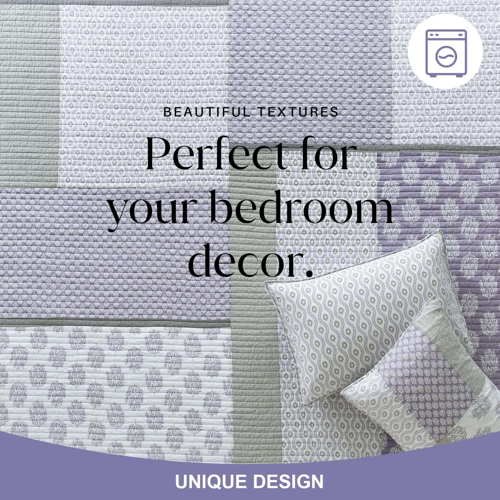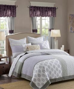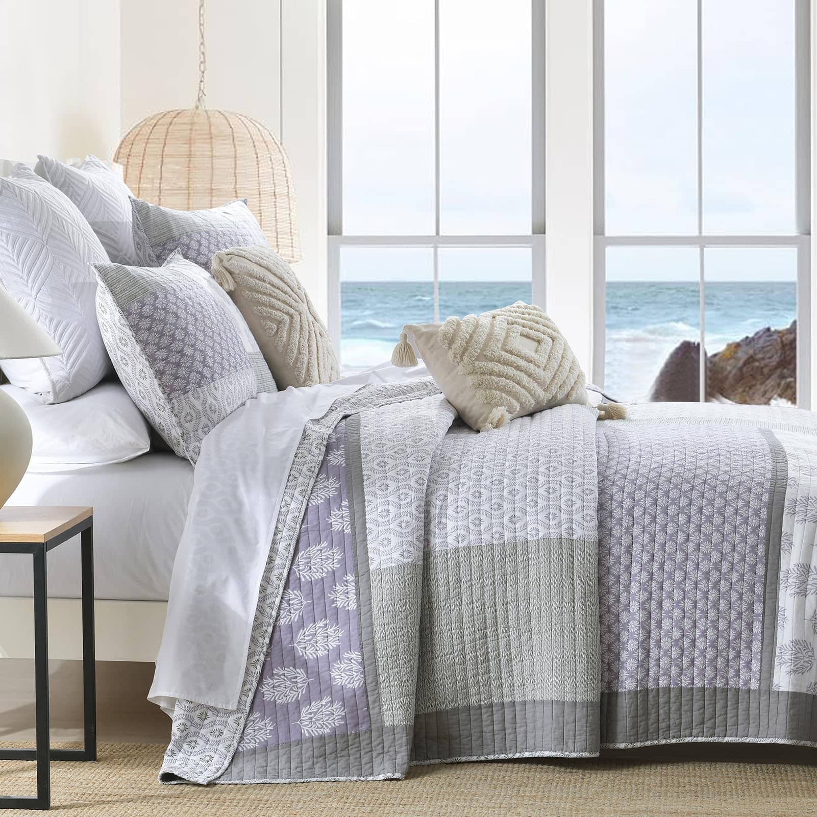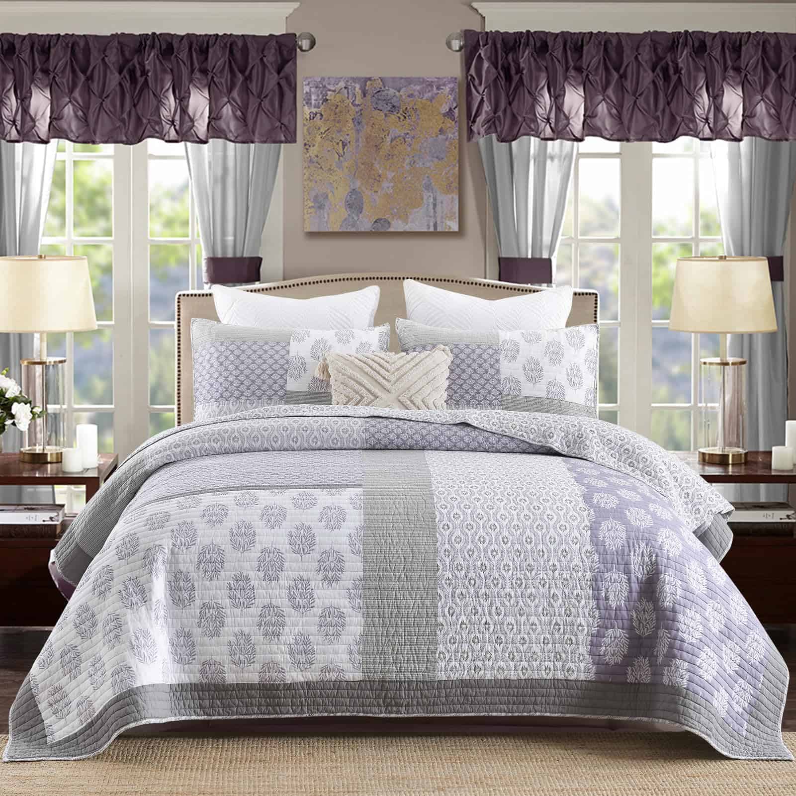 2. Colcha de retazos: Una combinación de patrón floral embellece aún más el diseño de color morado gris y blanco haciéndolo más único y elegante, la mejor elección para la decoración de tu habitación de estilo brillante o de campo.