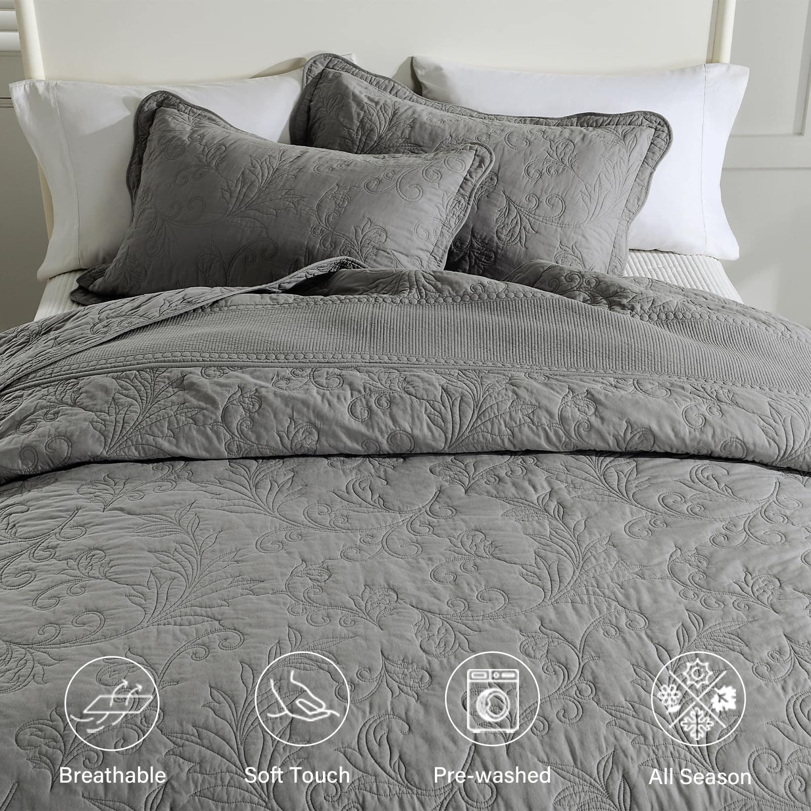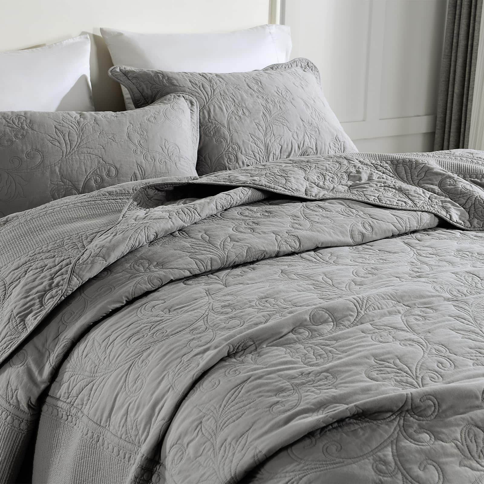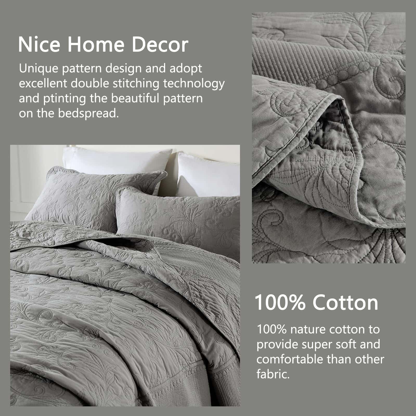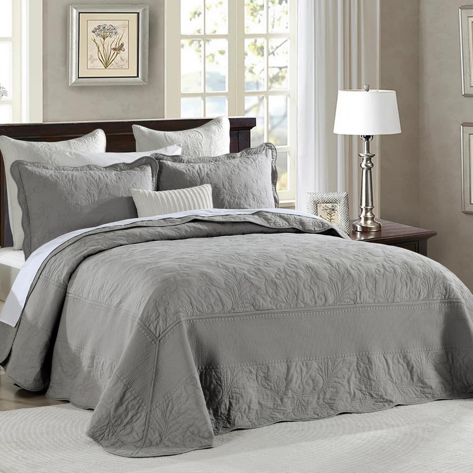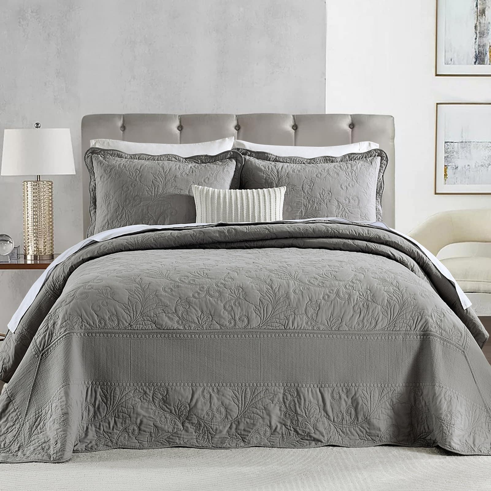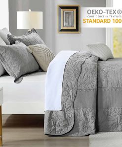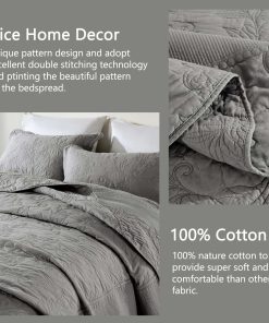 Colcha extra grande King 128″x120″ – Colcha acolchada King/Cal King con bordado de vid y 100% algodón, Juego de cubrecama de color gris sólido, ligera, extra grande con 2 fundas de almohada. Perfecta para una cama King extra grande y más alta, cuelga bien sobre los bordes de tu cama King y hasta el suelo. Borde hermoso que le da un elegante cuelgue, ni siquiera necesita un faldón para la cama. La colcha extragrande está hecha de algodón 100% natural, más saludable y transpirable. Suavidad, amigable con la piel y duradera. El proceso de prelavado la hace más resistente a la contracción. Incluye 1 colcha californiana extragrande (128 x 120 pulgadas) + 2 fundas de almohada (20 x 36 pulgadas), colcha ligera pero cálida, disfruta de un sueño reparador sin sensaciones de frío o calor. La colcha extragrande, que es de estilo vintage y art decó con color gris sólido, patrón de enredaderas rizadas únicas y diseño de bordados elaborados, el mismo patrón en ambos lados, bonita decoración para el hogar. La colcha es la mejor opción de regalo para tus padres y amigos. La colcha extragrande para cama King está diseñada para uso durante todas las estaciones, como colcha fresca en primavera y verano, así como para proporcionar calor adicional según sea necesario en otoño e invierno. Instrucciones de cuidado: Lavar a máquina por separado en agua fría con detergente suave. Secar a fuego lento para garantizar la longevidad del suave y colorido tejido de algodón. Si tienes mascotas, la colcha lavable también es una buena elección. Certificado de seguridad: Este juego de colcha está certificado Standard 100 por OEKO-TEX por cumplir con los criterios de prueba más altos para sustancias químicas dañinas y se ha comprobado que es inofensivo para los humanos.