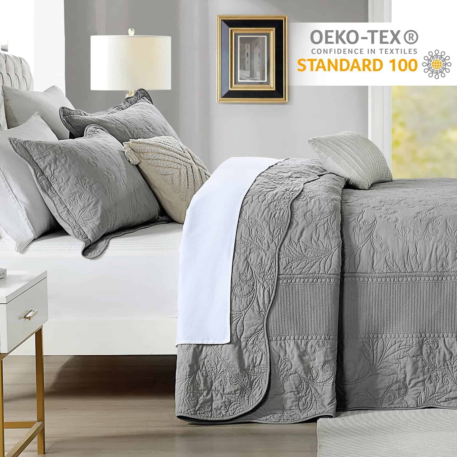 7. Certificado de seguridad – Este juego de colcha está certificado Standard 100 por OEKO-TEX por cumplir con los criterios de prueba más altos para sustancias químicas dañinas y se ha comprobado que es inofensivo para los humanos.