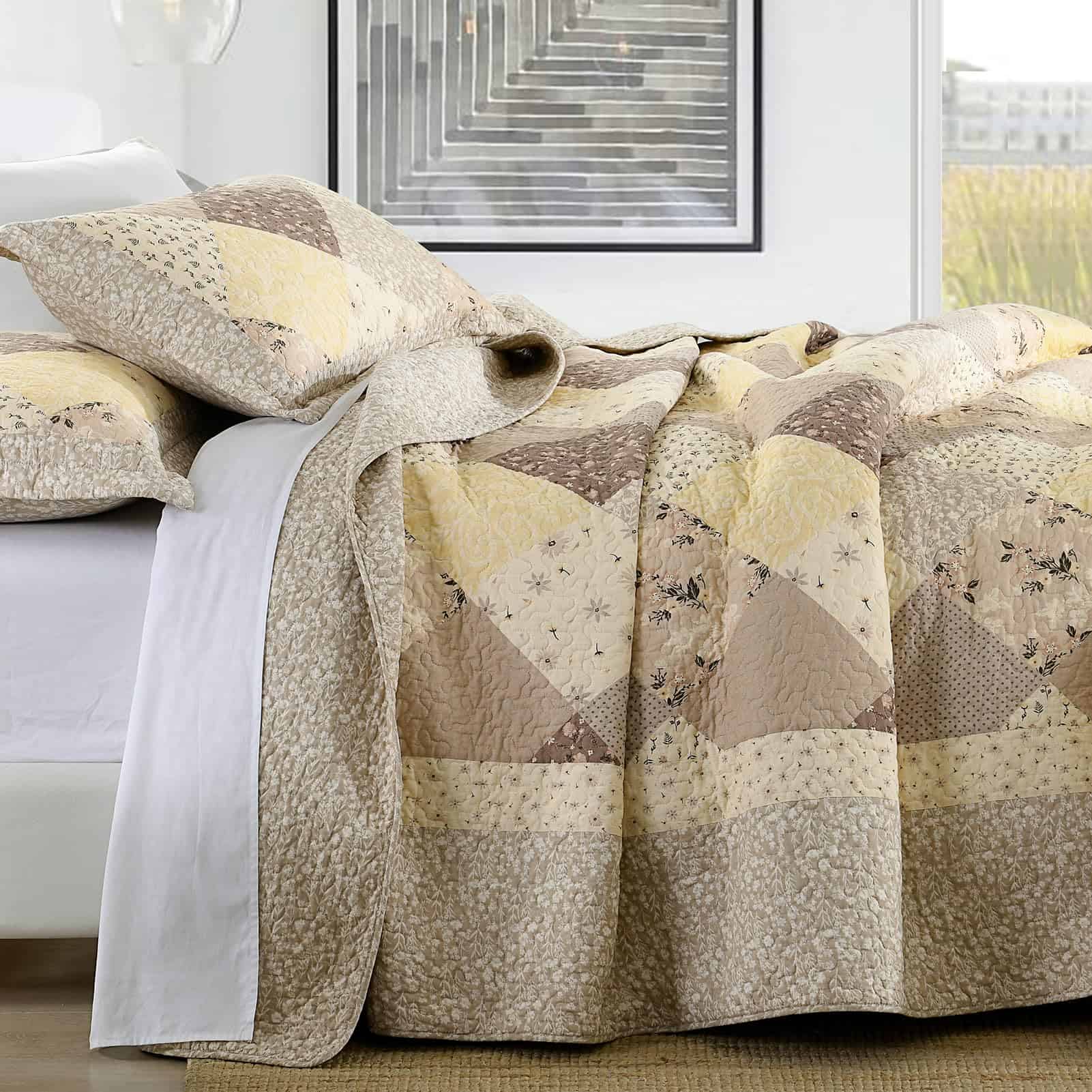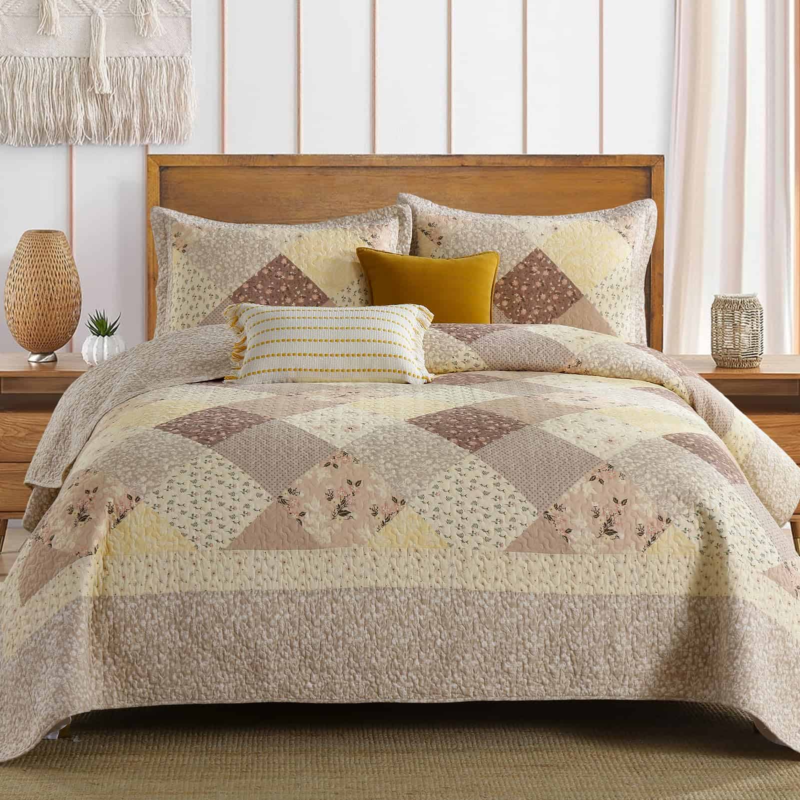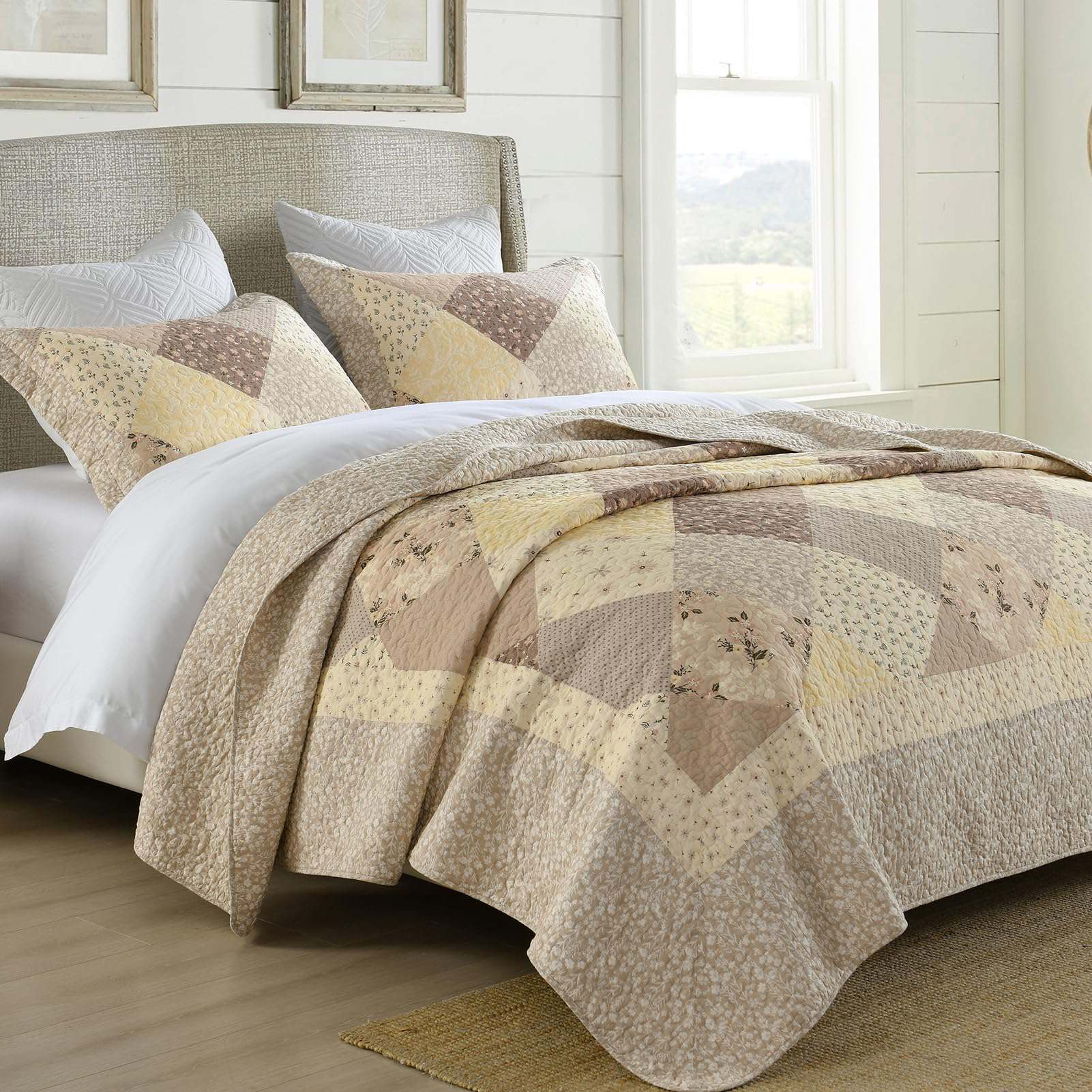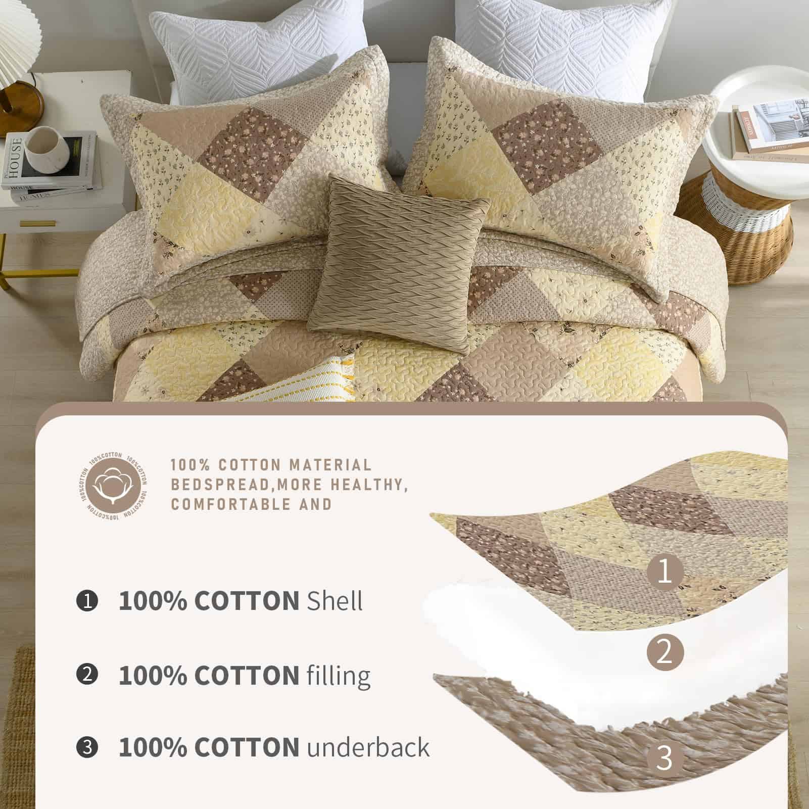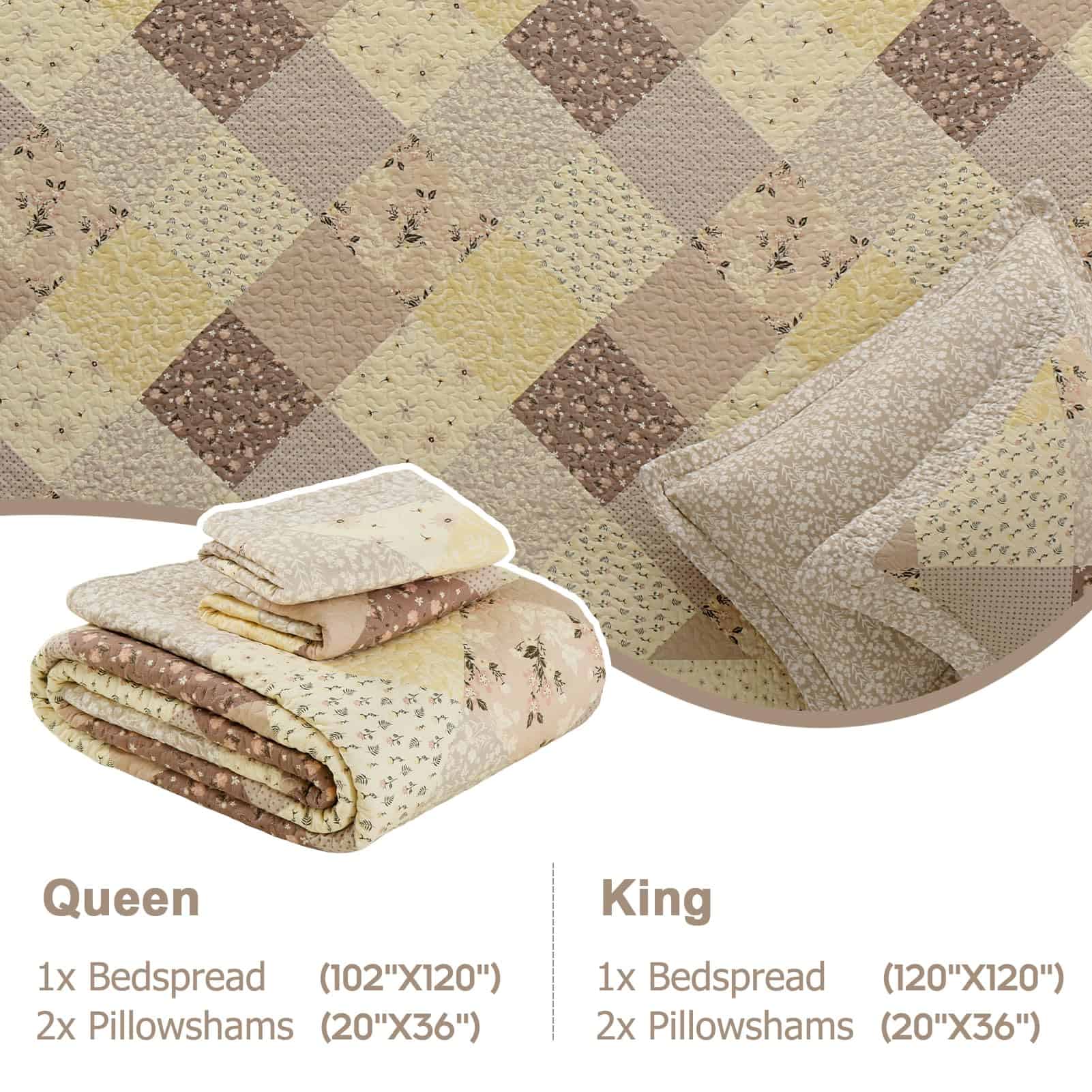 1. 100% Algodón Natural – Colcha tamaño queen hecha de 100% algodón natural, más saludable y transpirable. Suavidad, amigable con la piel y duradero. El proceso de prelavado lo hace más resistente a la contracción. n2. Bonita Decoración para el Hogar – La colcha de cama de estilo rústico y de granja con colores marrón y blanco crema, diseño único de patrón floral y artesanía de doble costura excelente, bonita decoración para el hogar. La colcha es el mejor regalo para tus padres y amigos. n3. Set de 3 Piezas de Colcha – Incluye 1 colcha queen oversized (102 x 120 pulgadas) + 2 fundas de almohada (20 x 28 pulgadas), extra grande, cuelga bien sobre los bordes de tu cama tamaño queen. n4. Colcha Reversible Ligera – Colcha ligera pero cálida, reversible lado a/b puede cambiar el aspecto de tu dormitorio al instante, combinando bien con tu habitación. n5. Colcha para Todas las Estaciones – La costura ordenada y segura garantiza durabilidad para uso a largo plazo. Esta colcha tamaño queen está diseñada para uso durante todas las estaciones, como una manta acolchada en primavera y verano, como un juego de edredones lo suficientemente cálido en otoño e invierno, lo suficientemente fresco para las temperaturas más cálidas. n6. Instrucciones de Cuidado – Lavar a máquina por separado en agua fría con detergente suave. Secar a baja temperatura para garantizar la longevidad de la tela de algodón suave y colorida. Si tienes mascotas, la colcha lavable también es una buena opción.