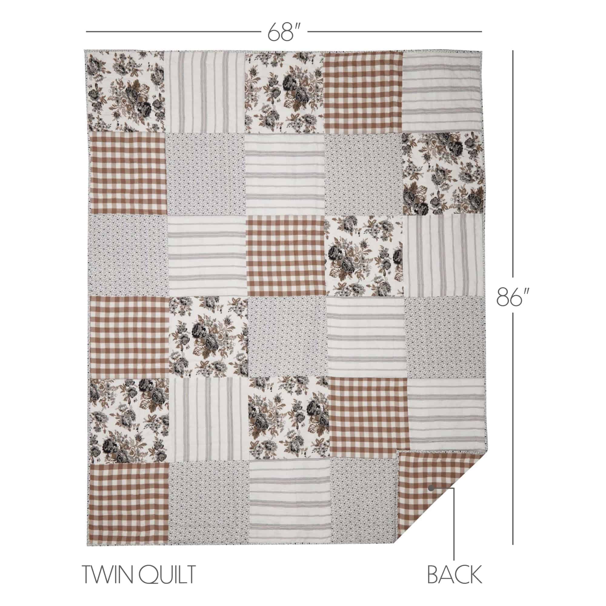 5. ESTILO VINTAGE: Esta acogedora colcha de cabaña campestre cuenta con patrones de inspiración vintage en una mezcla de tartán de búfalo, rayas y flores en blanco, gris cálido y marrón portabella. Con respaldo en tartán de búfalo blanco y marrón portabella.