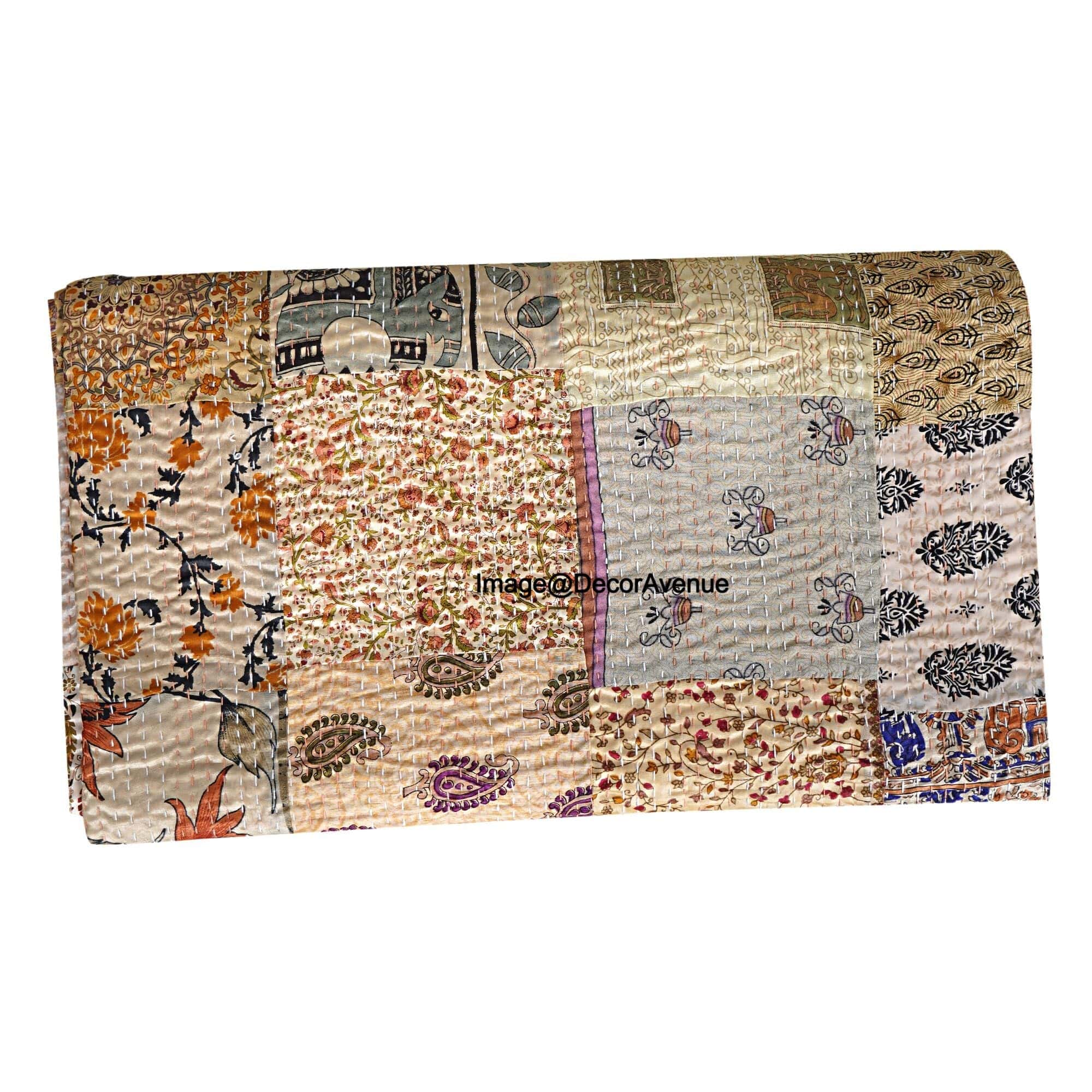 Esta pieza de arte está completamente cosida a mano por artesanas en Rajasthan, India. Puede dar vida a cualquier habitación con sus colores vivos, hecho utilizando el método tradicional y famoso de bordado a mano Kantha. Esta colcha Kantha de retazos está completamente hecha a mano utilizando retazos de 100% seda patola suave. Dale a tu hogar un aspecto tradicional pero auténtico y colorido con esta hermosa manta o cubrecama Kantha hecha a mano que también se puede usar como colcha. Tiene dos capas de tela cosidas juntas con miles de pequeñas y delicadas puntadas kantha corriendo, hechas a mano de forma suave y acolchadas por artesanos en India. La forma en que las puntadas han sido hechas a mano hace que la colcha sea extraordinaria y muy cómoda. Esta colcha es 100% amigable con el medio ambiente. Toda la colcha está bordada a mano con un número infinito de puntadas rectas para crear un producto único, uno de una clase, por lo que también es un regalo perfecto. Ten en cuenta que estas cubrecamas están hechas utilizando diferentes retazos, por lo que cada pieza es un poco diferente de otra, la imagen de la publicación te da una idea de cómo es, pero los colores de los retazos pueden ser diferentes.