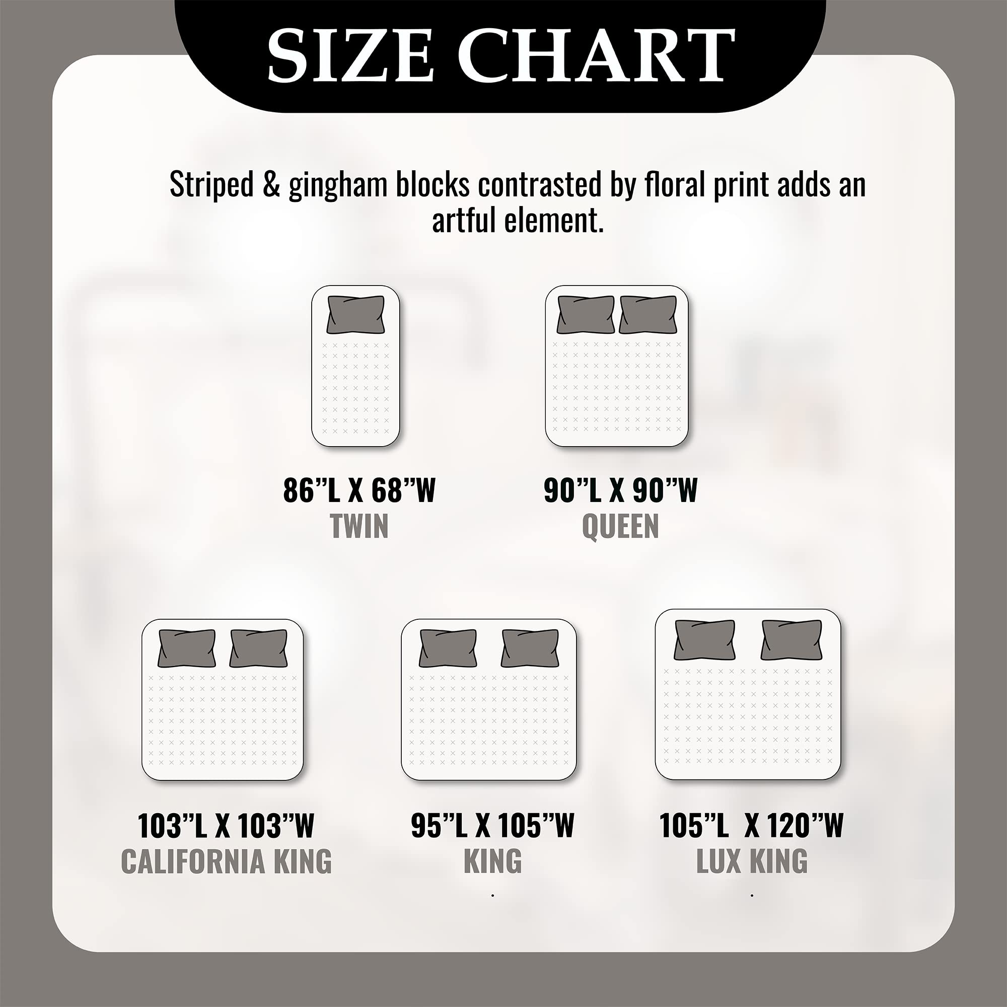 2. 105 x 95 COLCHA KING presenta cubierta y relleno 100% algodón. Los bloques de patchwork y encantadores estampados florales se combinan para hacer una colcha reversible que agrega los toques finales a la decoración de tu dormitorio de granja.