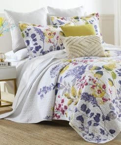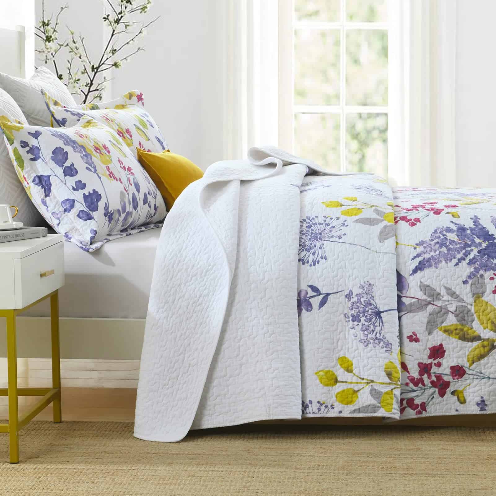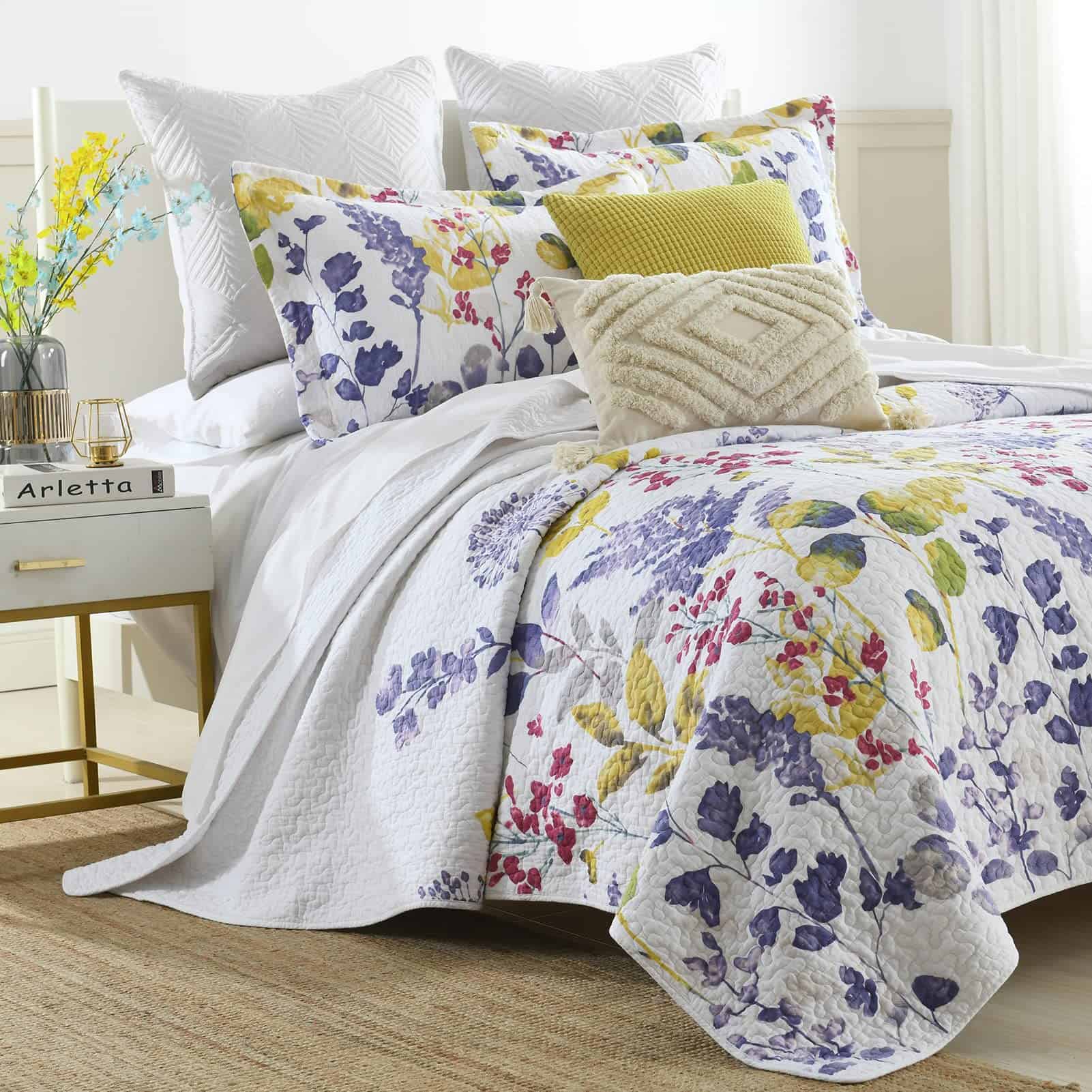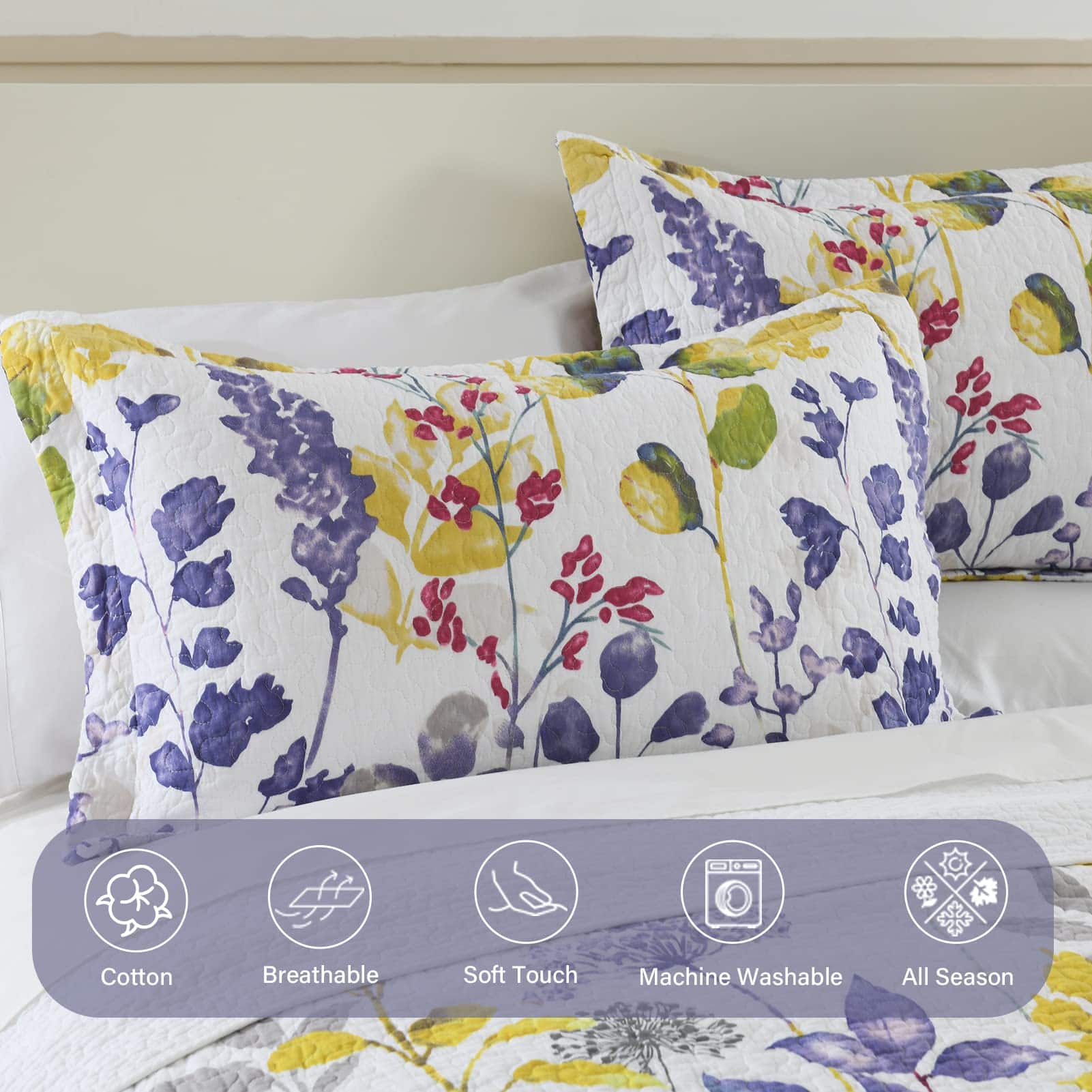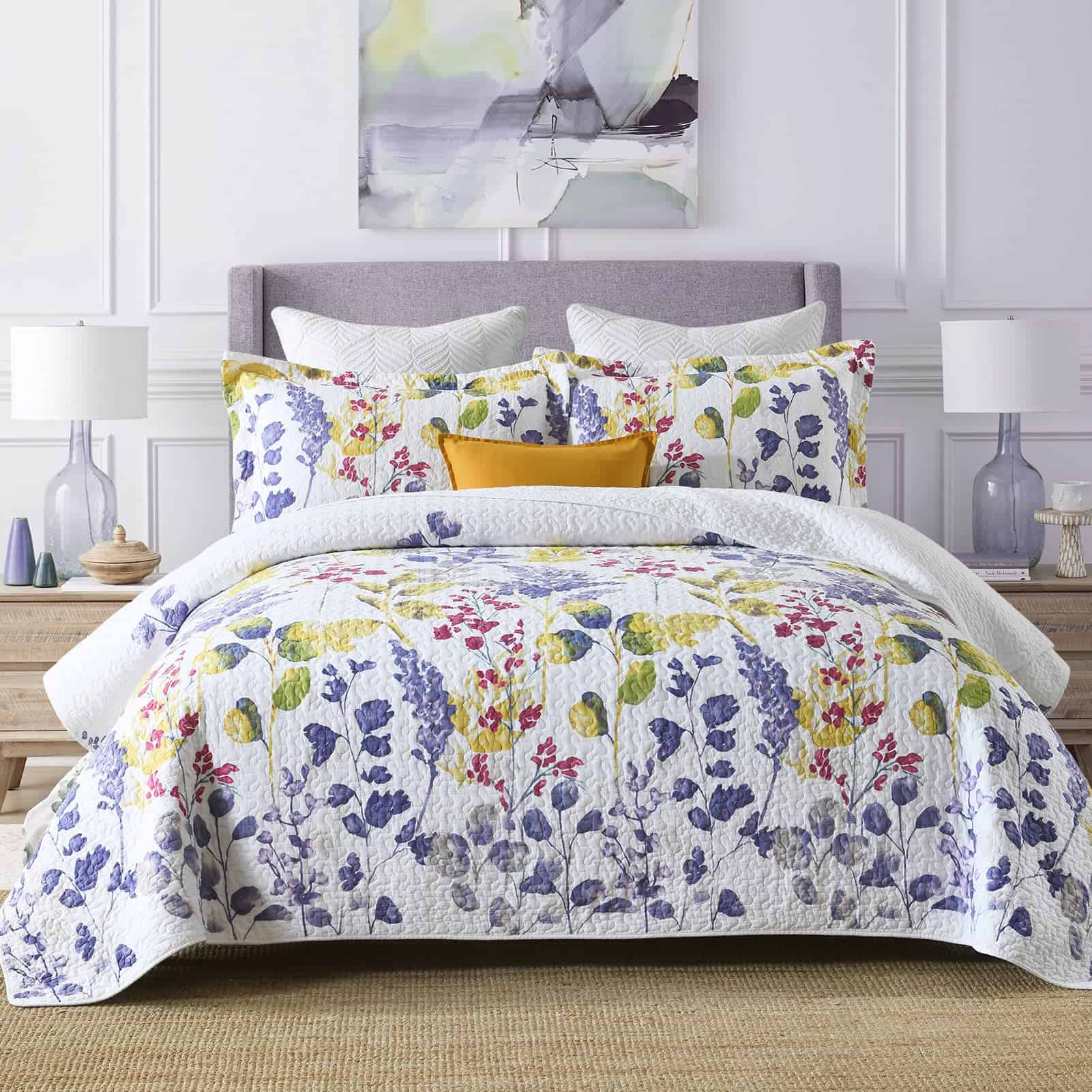 5. Bonito Decoración del Hogar – Colcha king con colores púrpura, amarillo y blanco, colcha ligera, cambia el aspecto de tu dormitorio al instante y lo suficientemente fresca para las temperaturas cálidas.