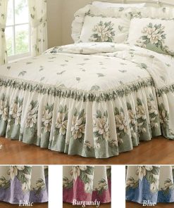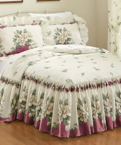 Colcha-top de acolchado presenta un hermoso patrón de magnolias con detalles delicados y una falda completa con volantes que proporciona el toque final. Las fundas se venden por separado. Lavar a máquina. Fabricada en poliéster y algodón. Disponible en tamaños: Full (108″ x 96″), Queen (112″ x 102″) o King (120″ x 112″). Especificar color: Rojo borgoña o salvia. Shop Coordinating Items: {TIP: Type the product name and item into the search box } Magnolia Garden Floral Ruffle Pillow Sham,97605; Floral Magnolia Garden Curtain Panel Pair,97604