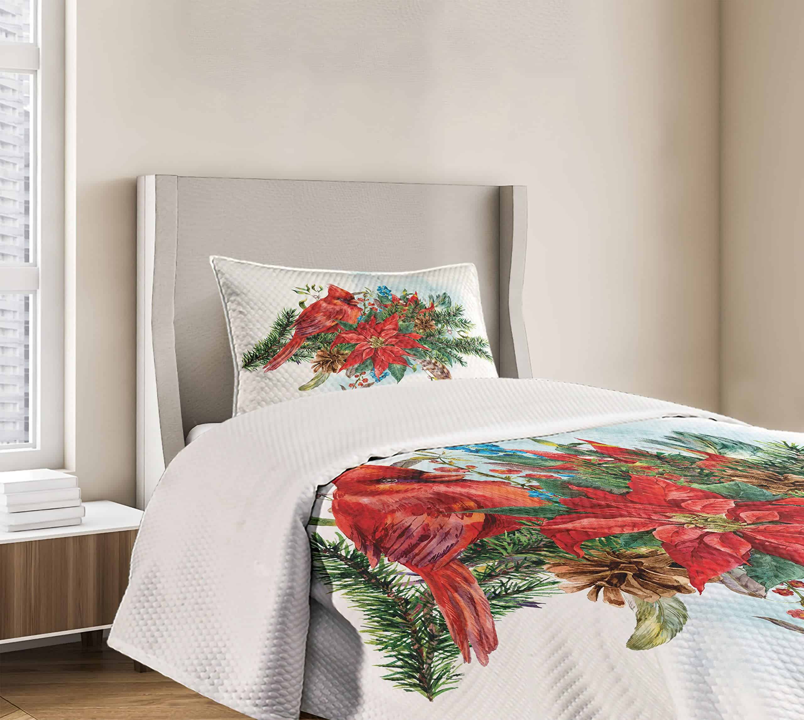Colcha Lunarable Cardinal, Tema de Navidad Pájaro en Ramo Floral Flor de Pascua Piñas y Bayas, Juego de Colcha Decorativa de 2 Piezas con Funda de Almohada en tamaño Twin. Hecho con poliéster suave de alta densidad de doble cepillado para la suavidad óptima y la máxima comodidad. Pesado – No se cae fácilmente de la cama y se puede usar como manta. Colcha de punto de alta tecnología. Lavable a máquina en ciclo frío, seguro para secadora y fácil de planchar con colores que no se desvanecen. Excelente costura y mano de obra. Impreso con tecnología digital de vanguardia. La colcha y las fundas de almohada están impresas solo en el lado frontal.