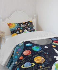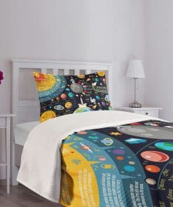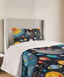 1 Colcha twin 68″ X 88″ + 1 funda 30″ X 20″. Tamaño amplio – Gran cobertura a lo largo de los lados de la cama. Hecho de – Poliéster suave de alta densidad de doble cepillado para una suavidad óptima y la máxima comodidad. Lavable en lavadora – Ciclo frío, seguro para secadora. Fácil de planchar. SIN DESVANECIMIENTO. Excelente costura y mano de obra. Impreso con tecnología digital de última generación. ¡La colcha y las fundas están impresas solo en el LADO FRONTAL!