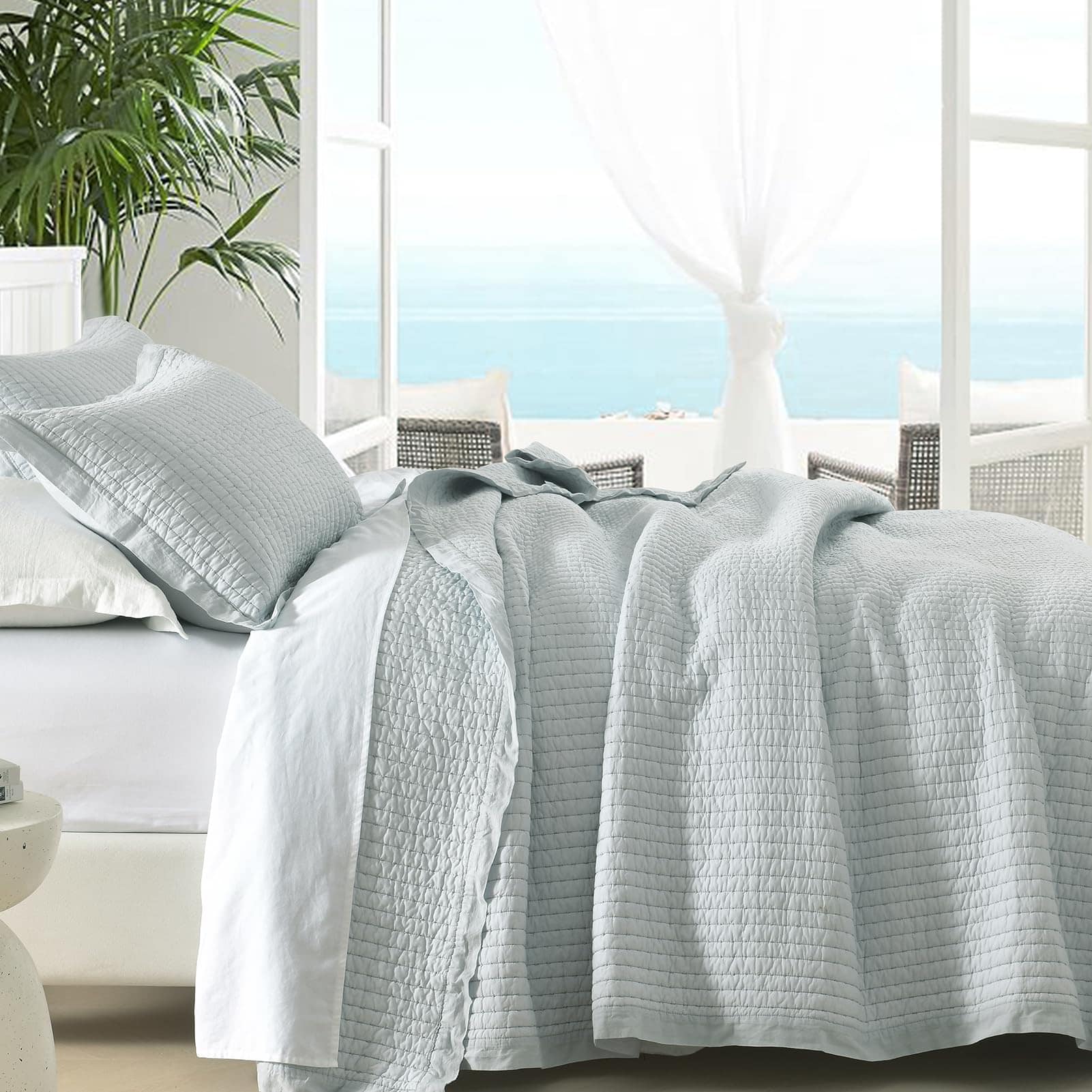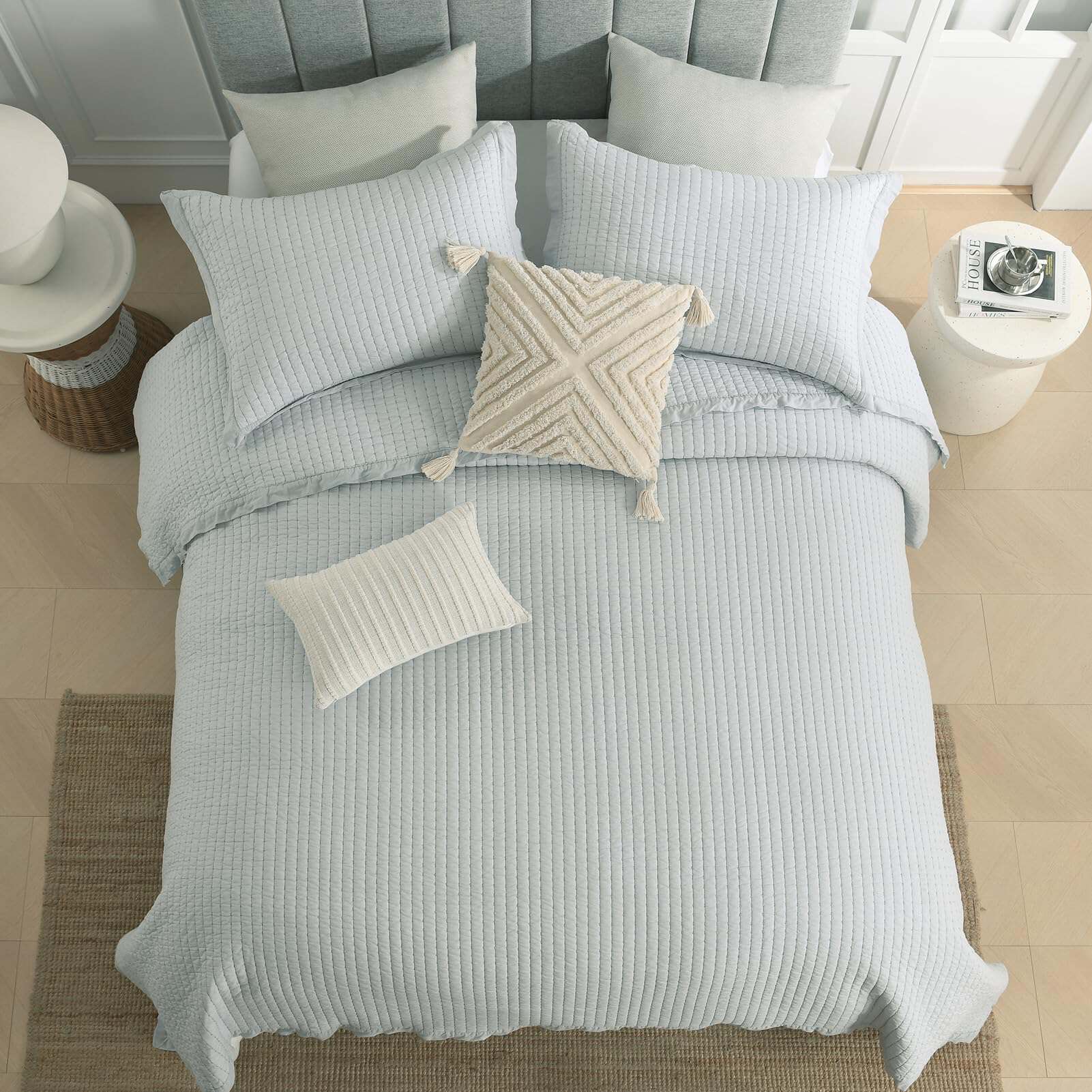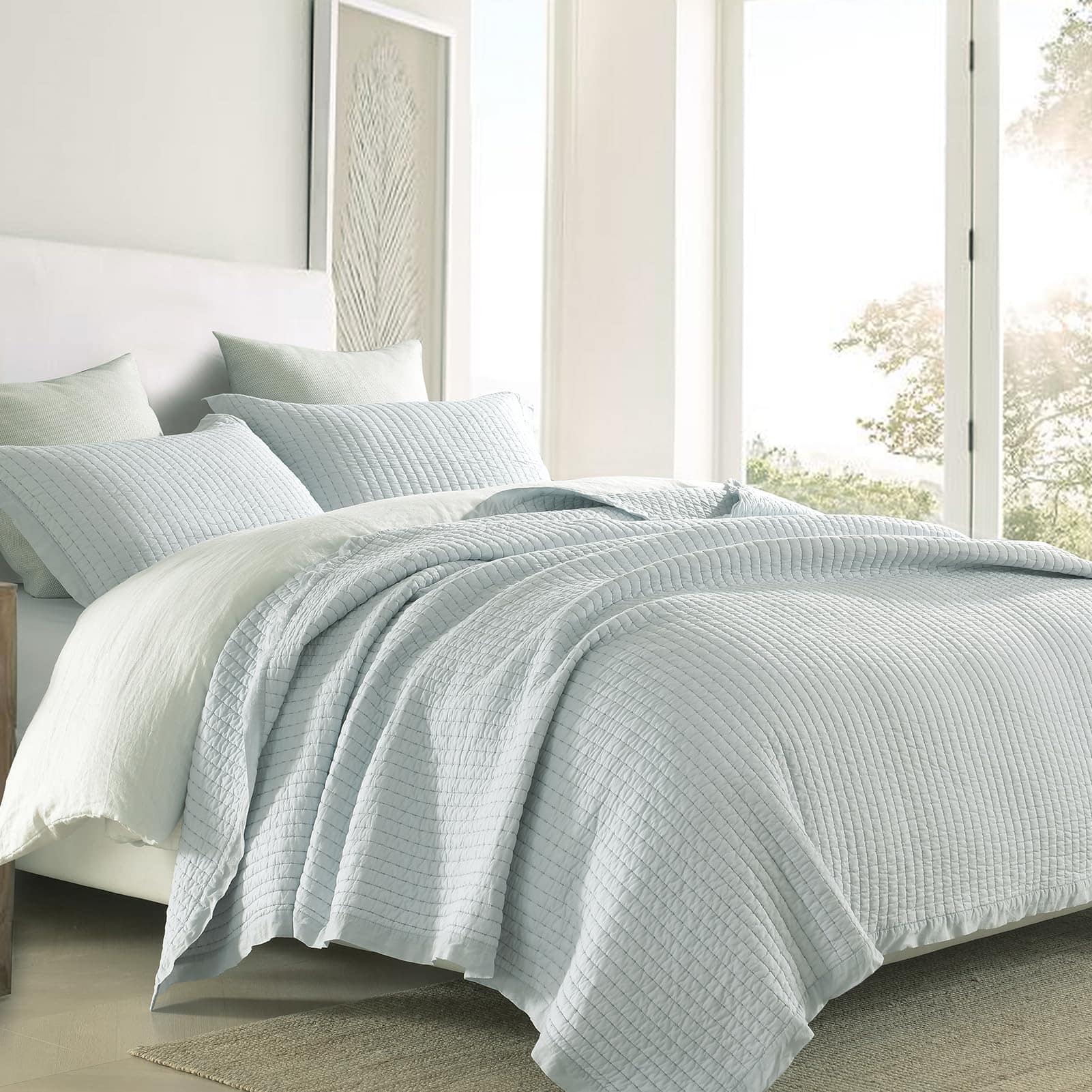 Con su transpirabilidad y propiedades hipoalergénicas, esta colcha de algodón 100% es una gran elección para aquellos que buscan una experiencia de sueño cómoda y saludable, especialmente para los que duermen calurosos. Este juego de colchas es versátil para todas las estaciones. Funciona como una colcha independiente para los días cálidos y se puede combinar con un edredón en invierno. Combínalo con otros textiles para crear un aspecto personalizado. Este juego de colcha queen cuenta con un ribete amplio que no solo agrega un toque decorativo, sino que también aumenta la durabilidad. El ribete previene de manera efectiva el deshilachado y protege los bordes del desgaste. Gracias a su fabricación a mano con puntada de selección, la colcha luce un aspecto hecho a mano distintivo y enternecedor. Este juego de ropa de cama incluye 1 colcha (90cm x 98cm) + 2 fundas de almohada (20cm x 28cm). Un set completo puede simplificar tu proceso de selección y mejorar la apariencia estética general y la coherencia estilística de tus textiles. Este set de cama está prelavado, ofrece un mejor tacto y reduce efectivamente el posterior encogimiento y decoloración. Lava la colcha por separado en agua fría. Seca al aire o en secadora a baja temperatura. Evita usar lejía para mantener su calidad.
