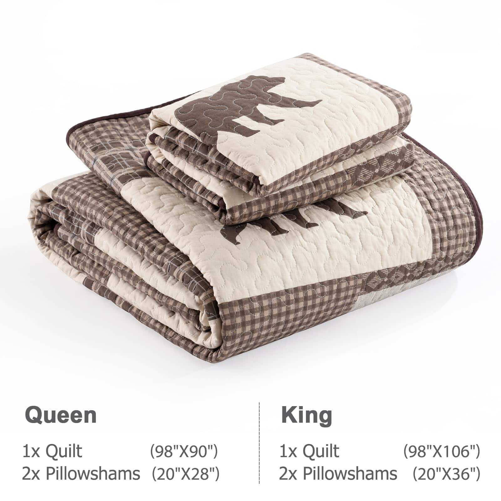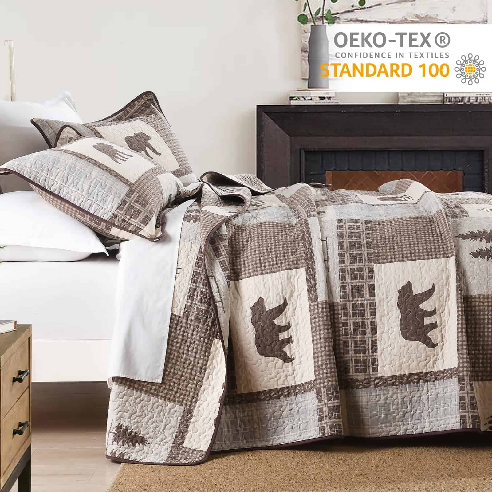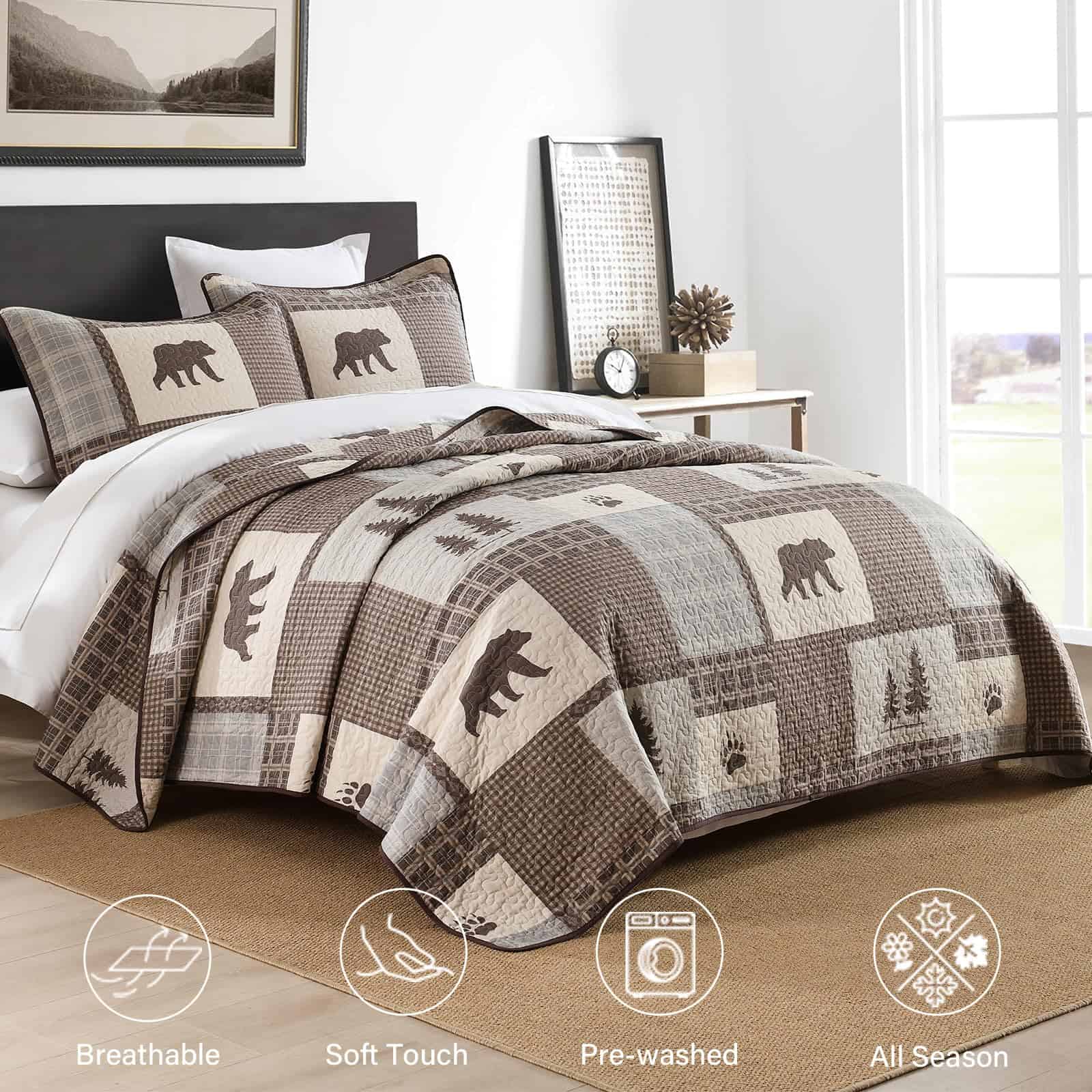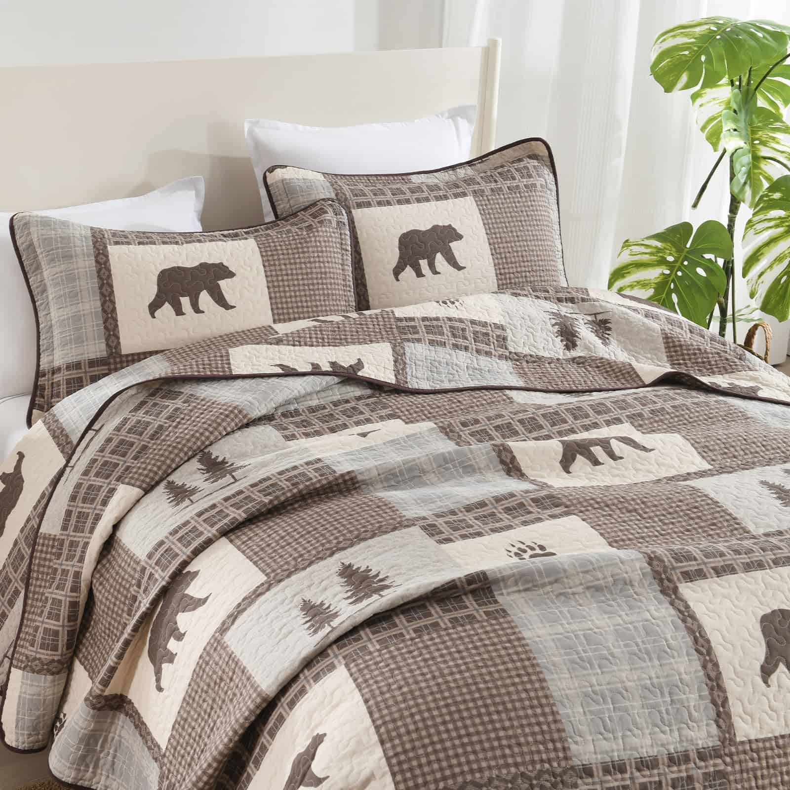 5. Bonita Decoración para el Hogar – Colcha queen en color marrón, gris y beige, colcha a cuadros con patrón de oso, árbol de pino, mano de cerveza, colcha ligera, lo suficientemente fresca para las temperaturas más cálidas.